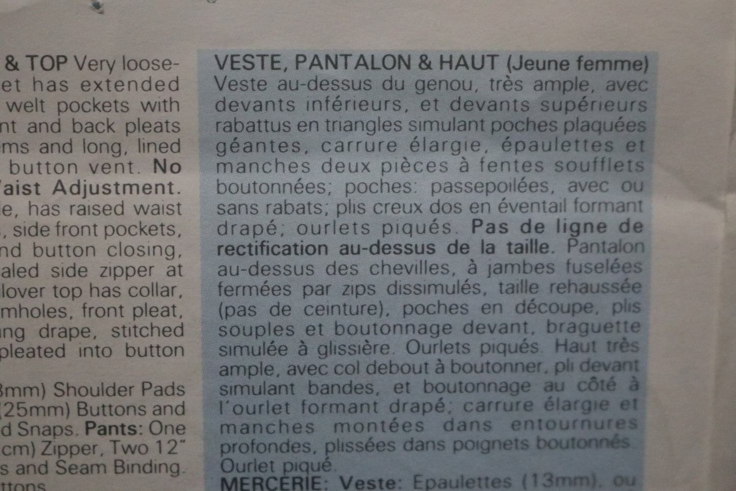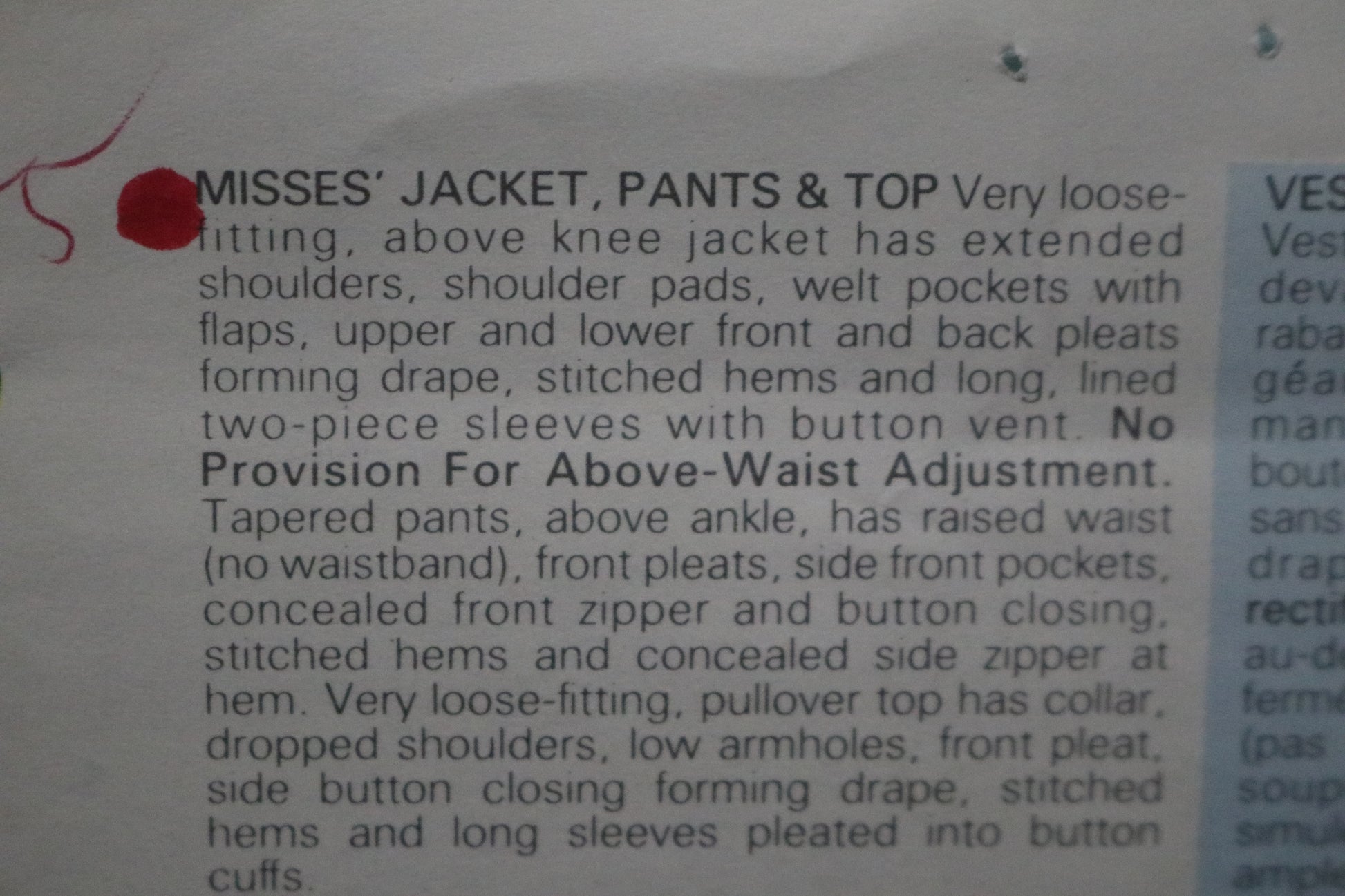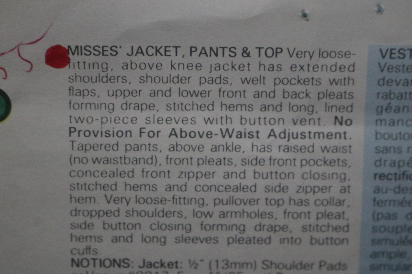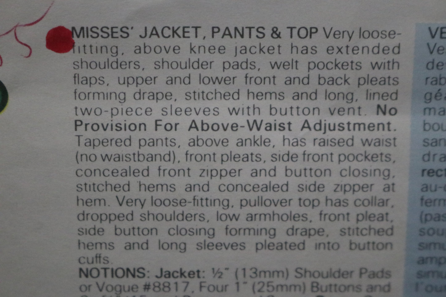 Very loose-fitting above knee jacket has extended shoulders, shoulder pads, welt pockets with flaps, upper and lower front and back pleats forming drape, stitched hems and long, lined two-piece sleeves with button vent. Tapered pants, above ankle, has raised waist , front pleats, side front pockets. Very loose-fitting, pullover top has collar, dropped shoulders, low armholes, front pleat, side button closing forming drape, stitched hems and long sleeves pleated into button cuffs.