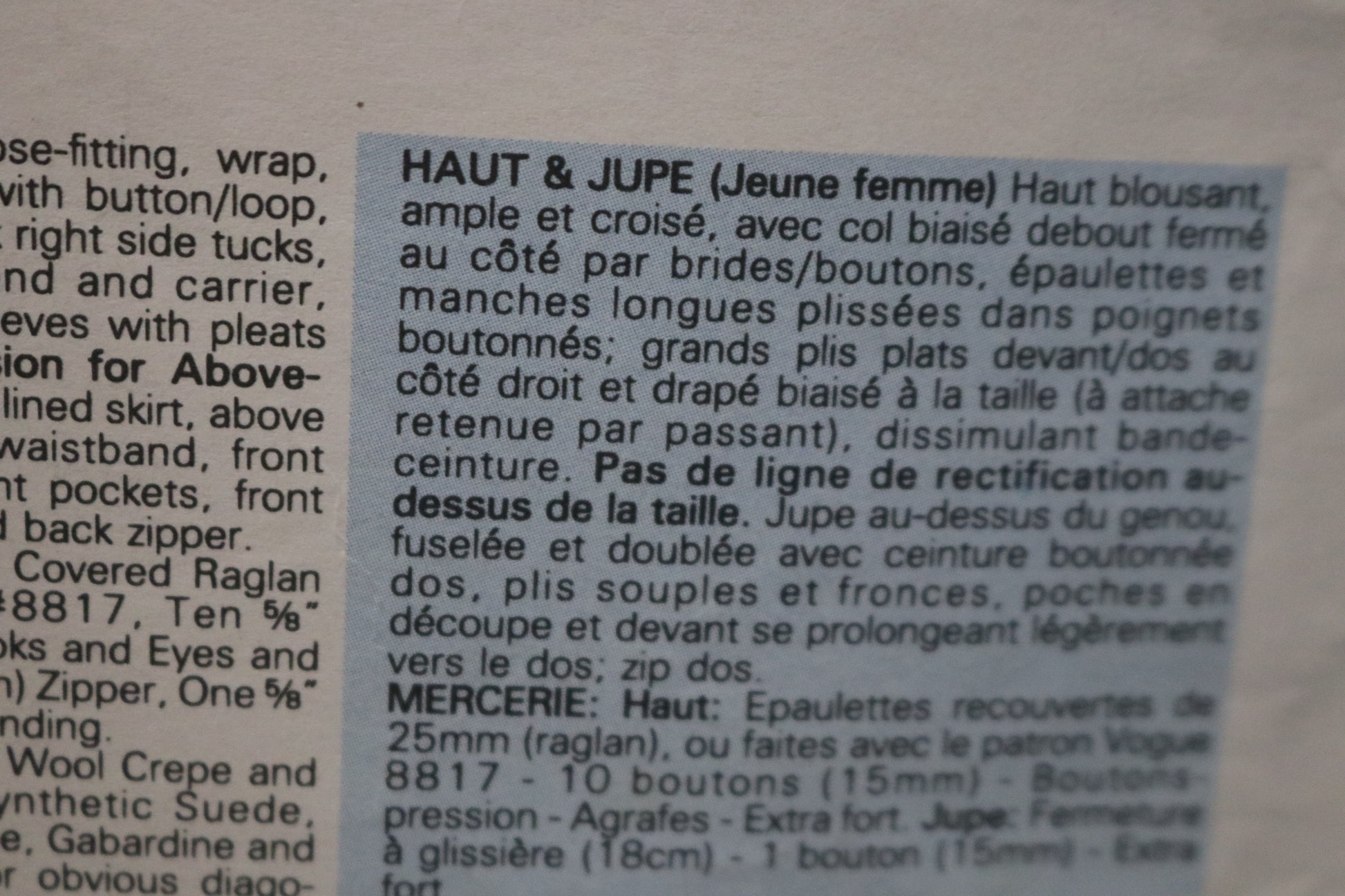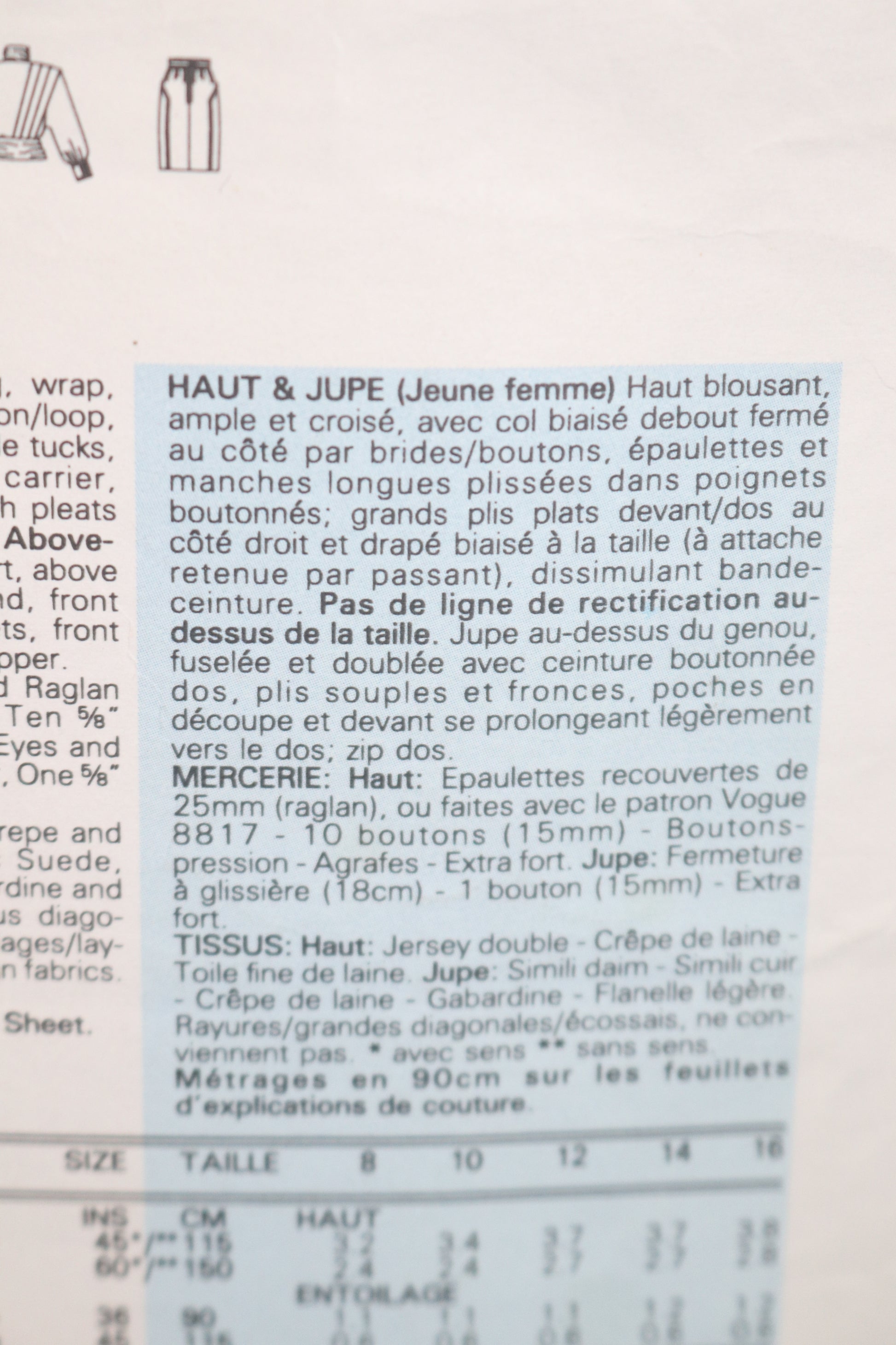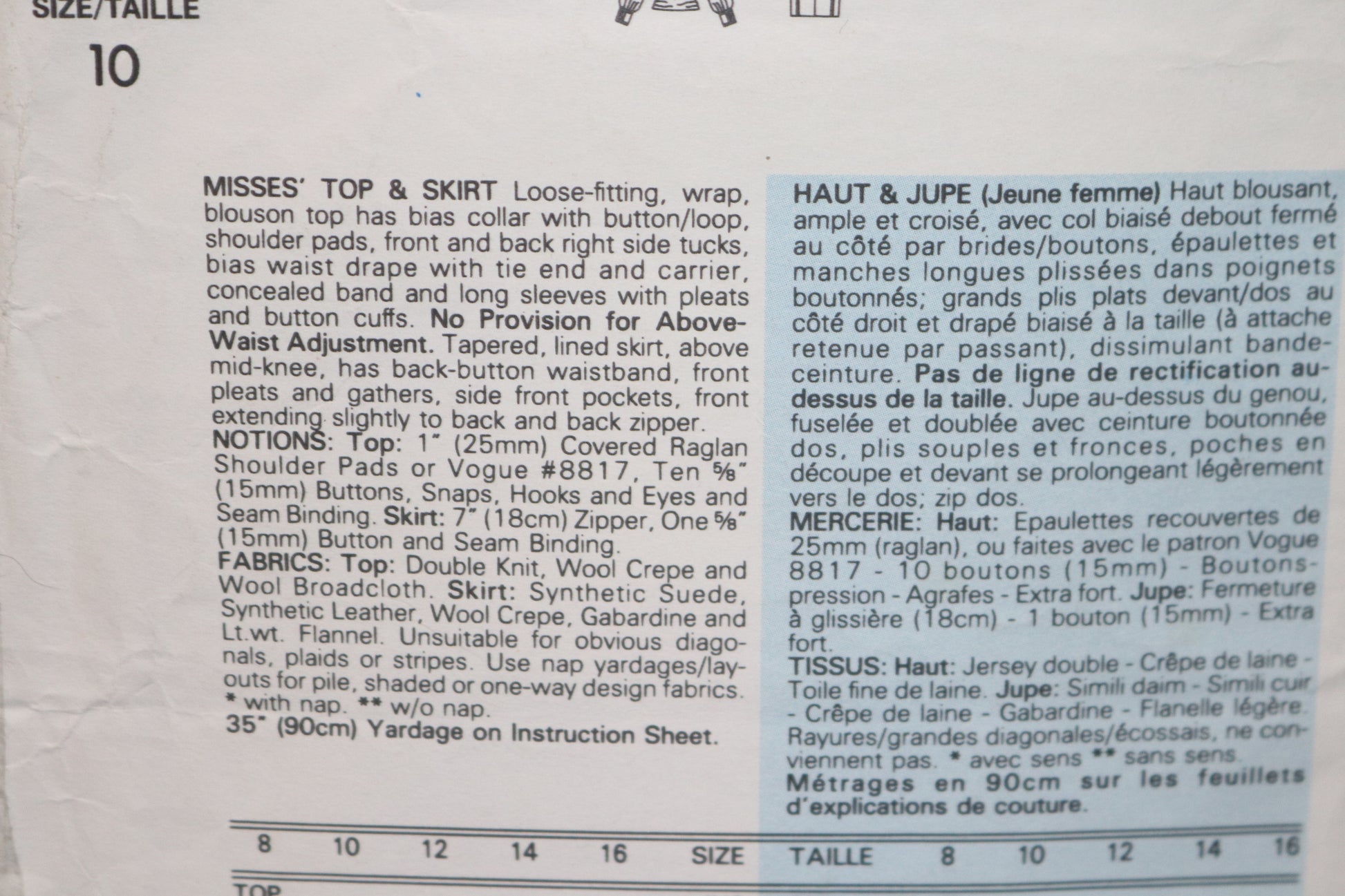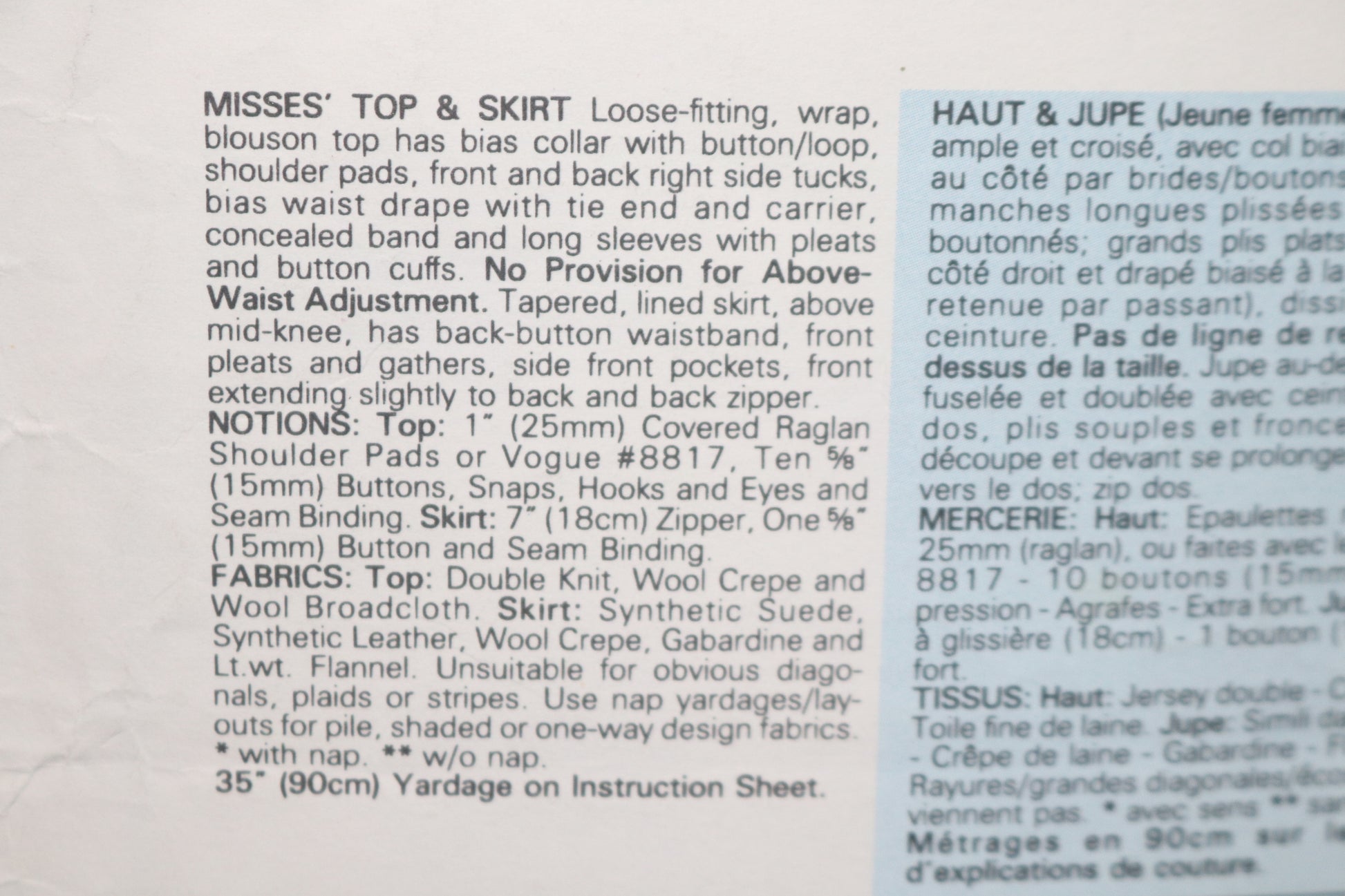 Loose-fitting, wrap, blouson top has bias collar, with button/loop, shoulder pads, front and back right side tucks, bias waist drape with tie end and carrier, concealed band and long sleeves with pleats and button cuffs. No provision for above-waist adjustment. Tapered, lined skirt, above mid-knee, has back-button waistband, front extending slightly to back and back zipper.