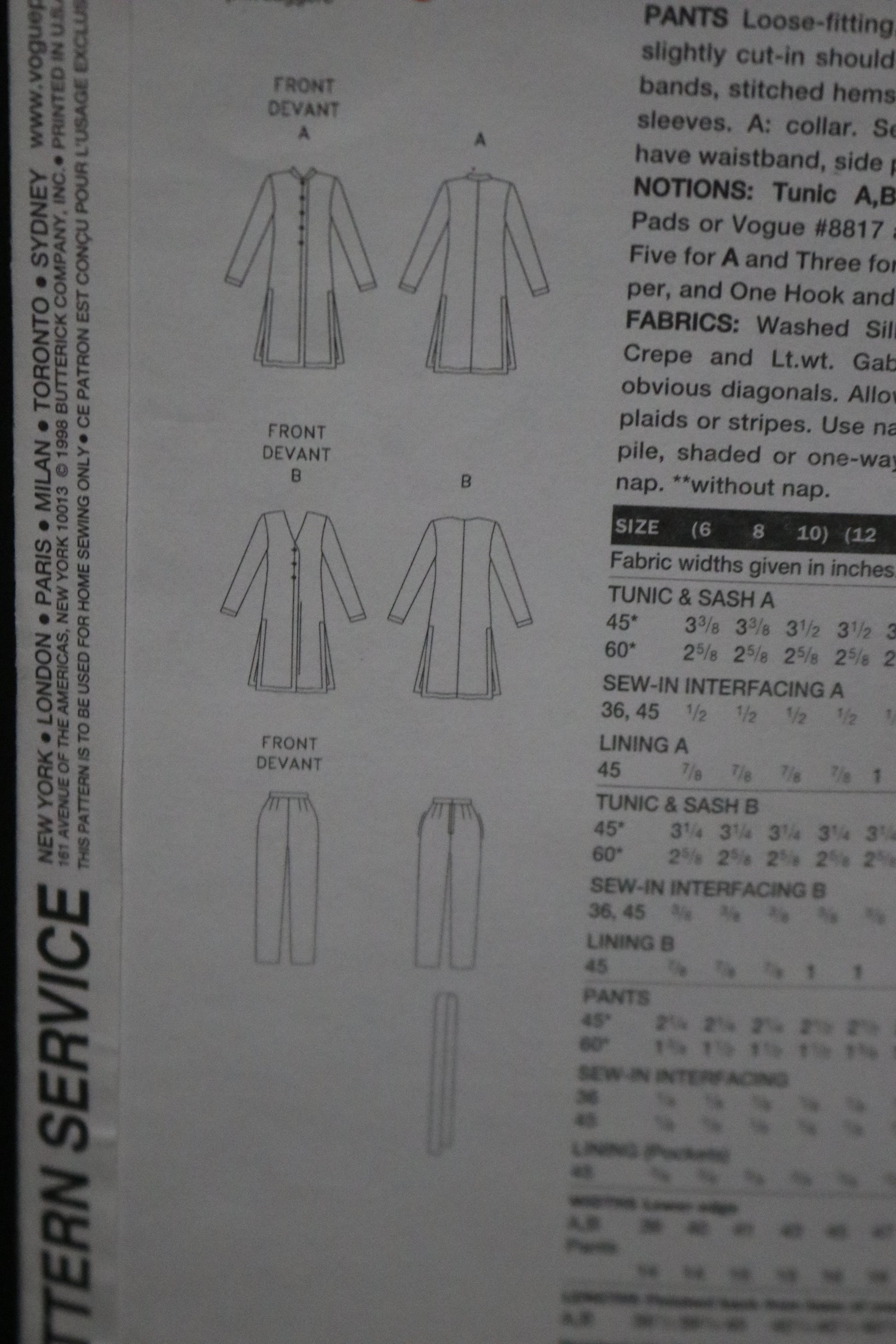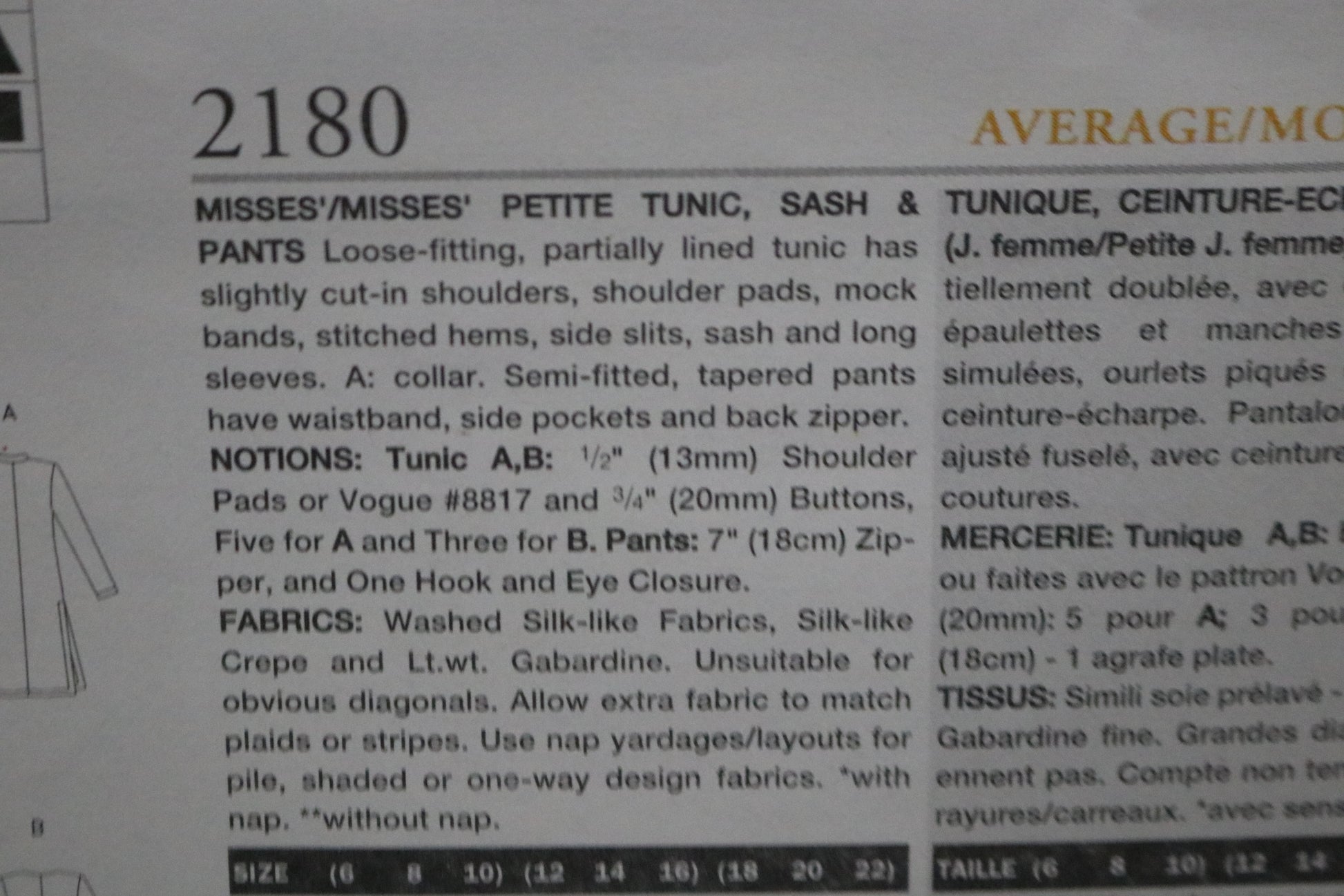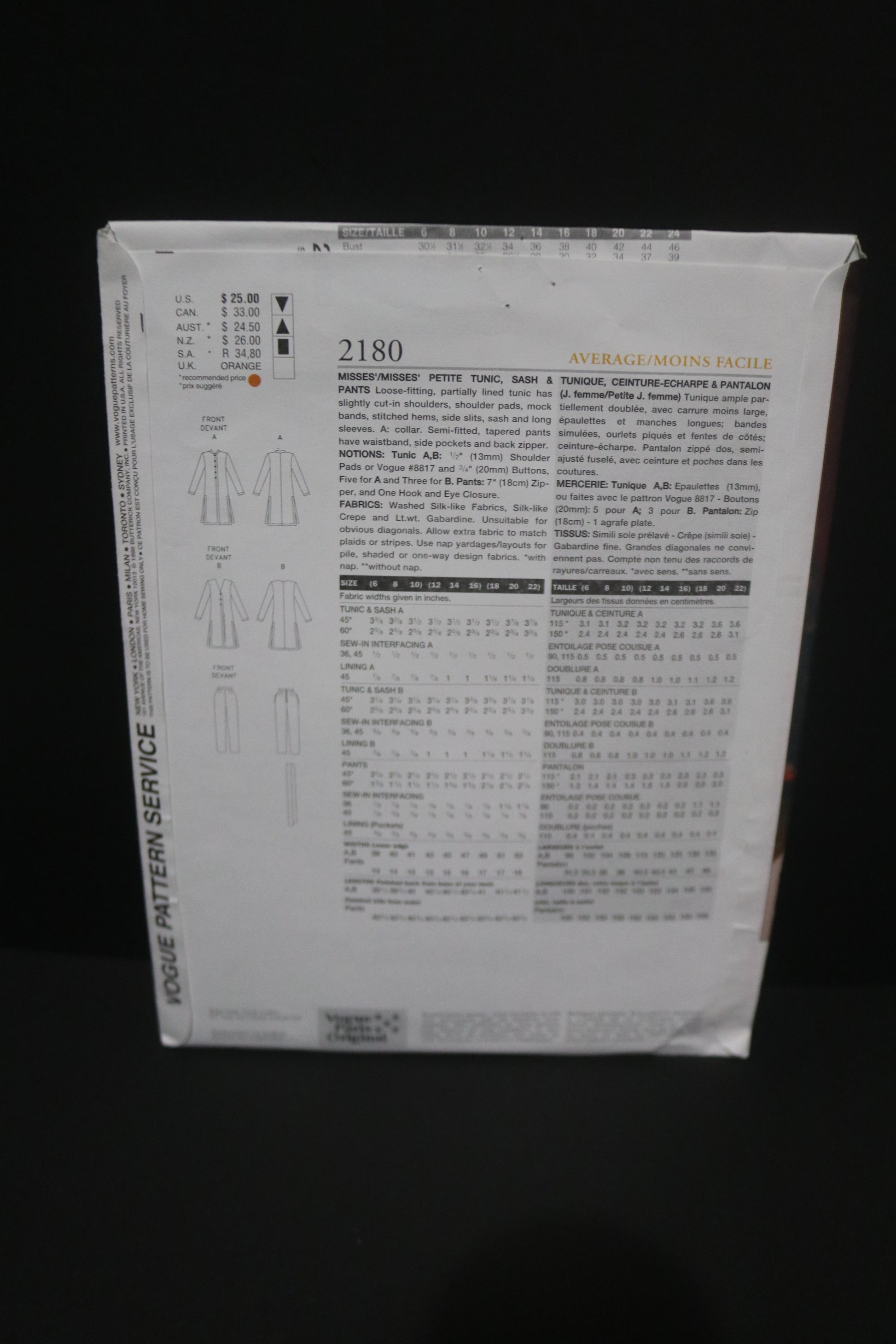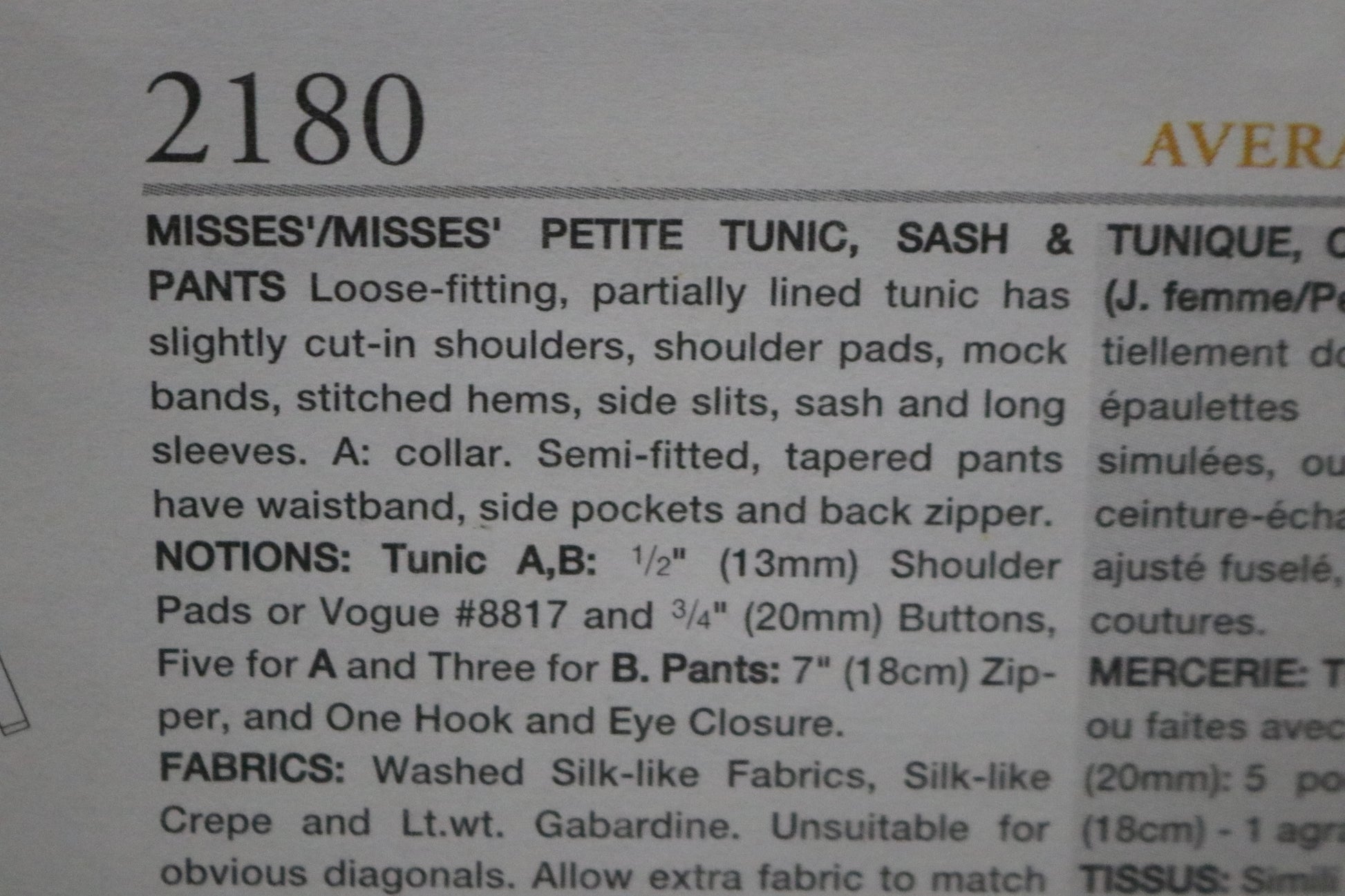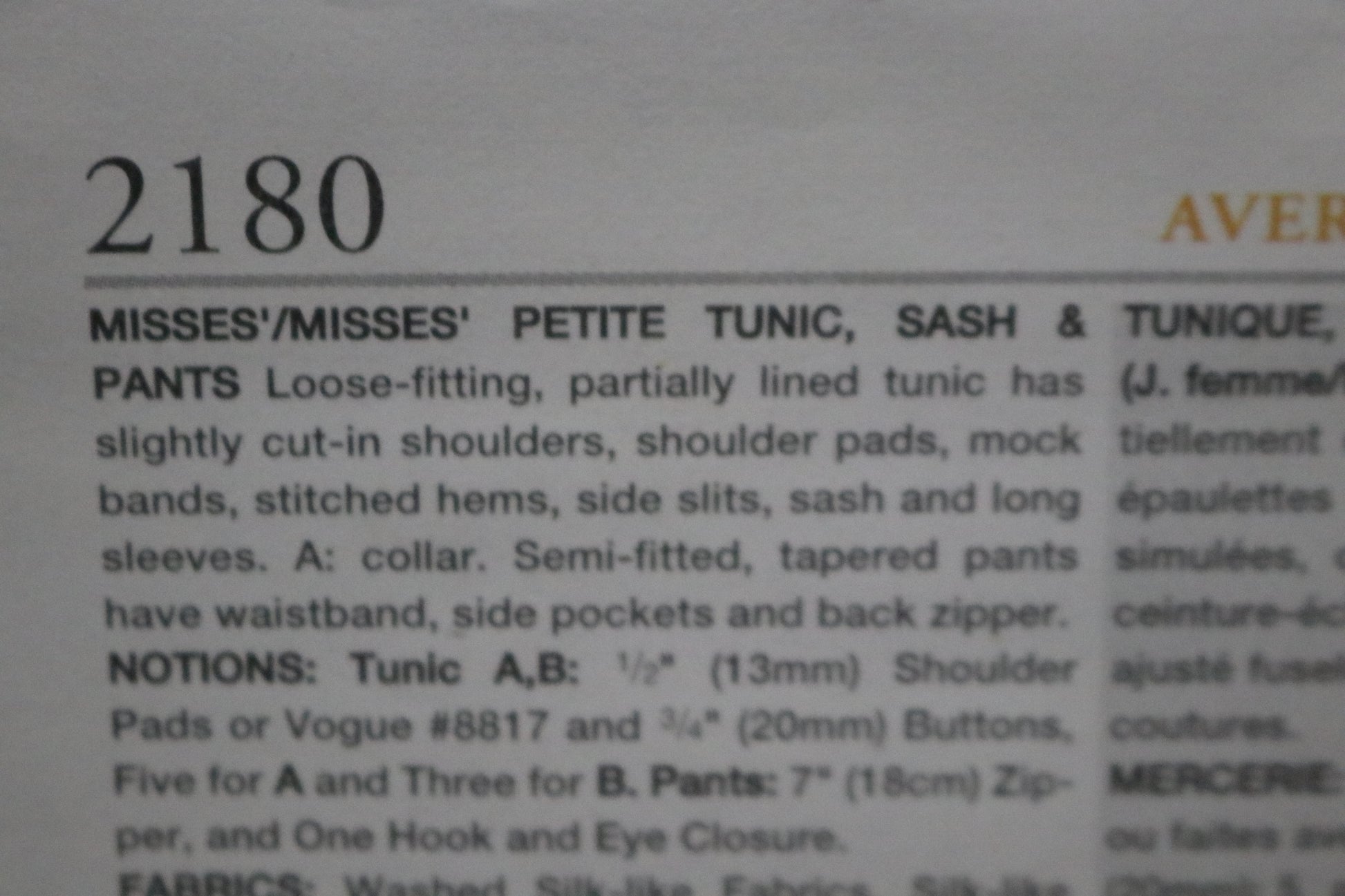 Vogue 2180 Yves Saint Laurent Misses / Misses Petite Tunic Sash and Pants Sewing Pattern