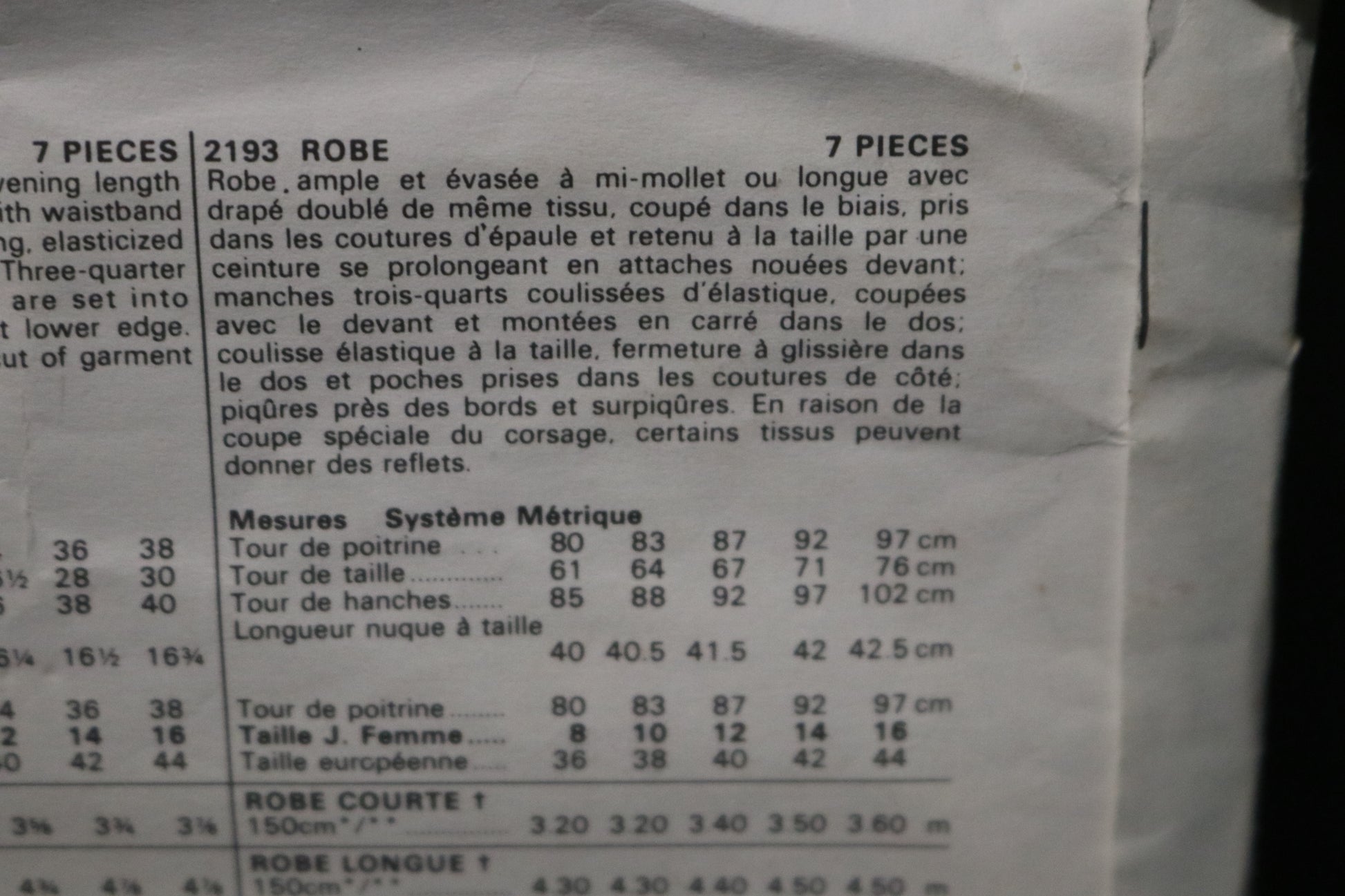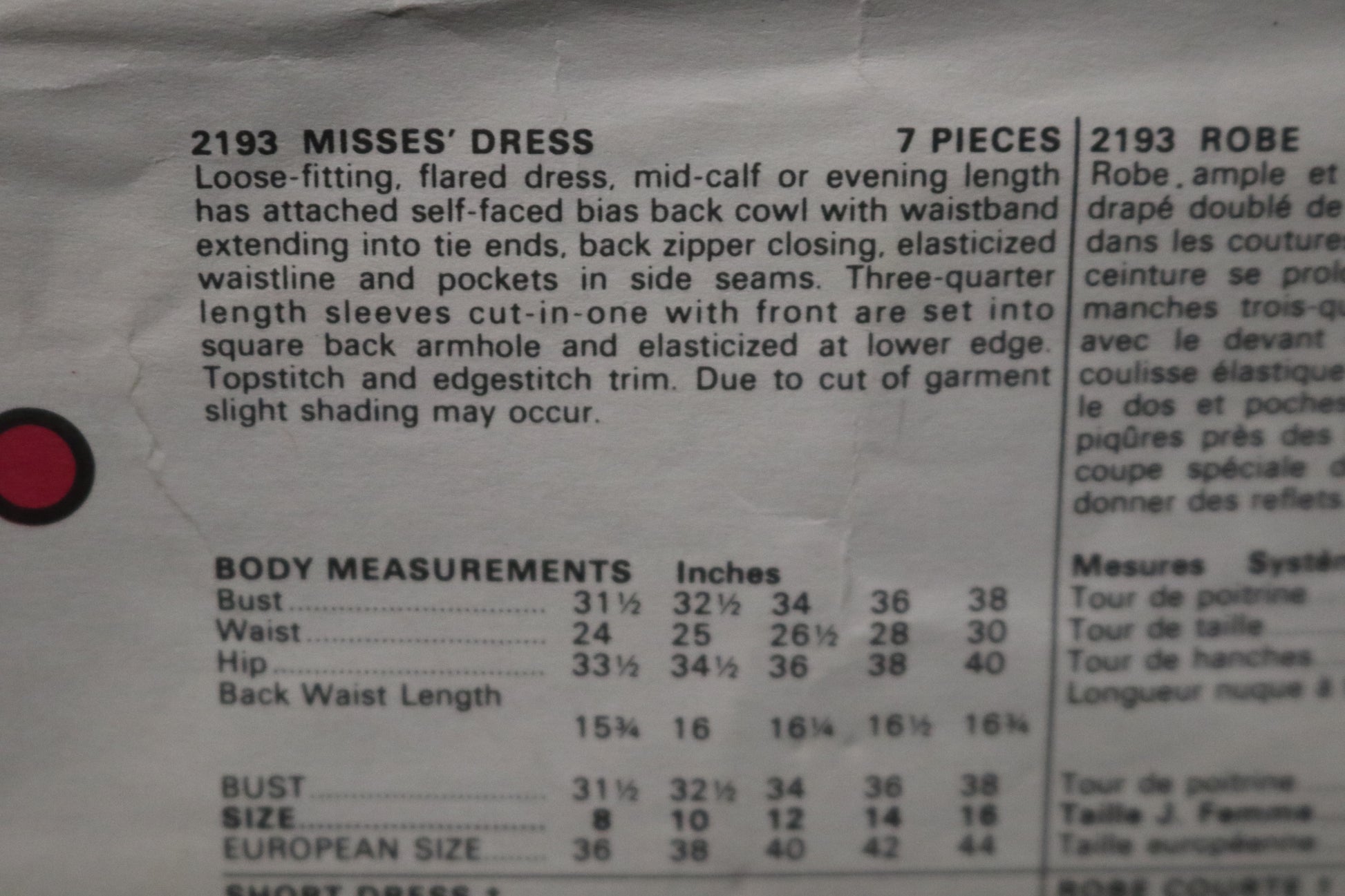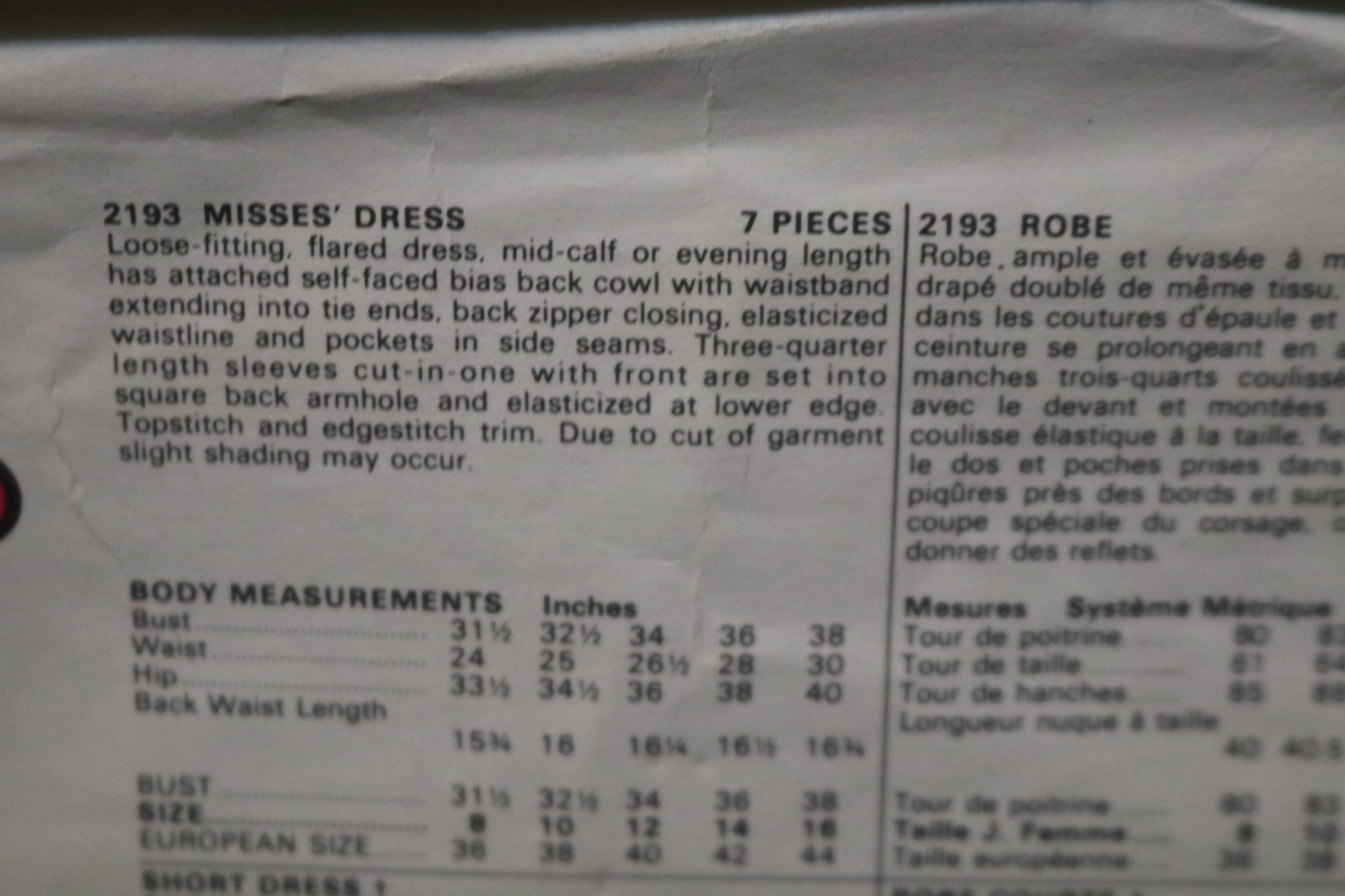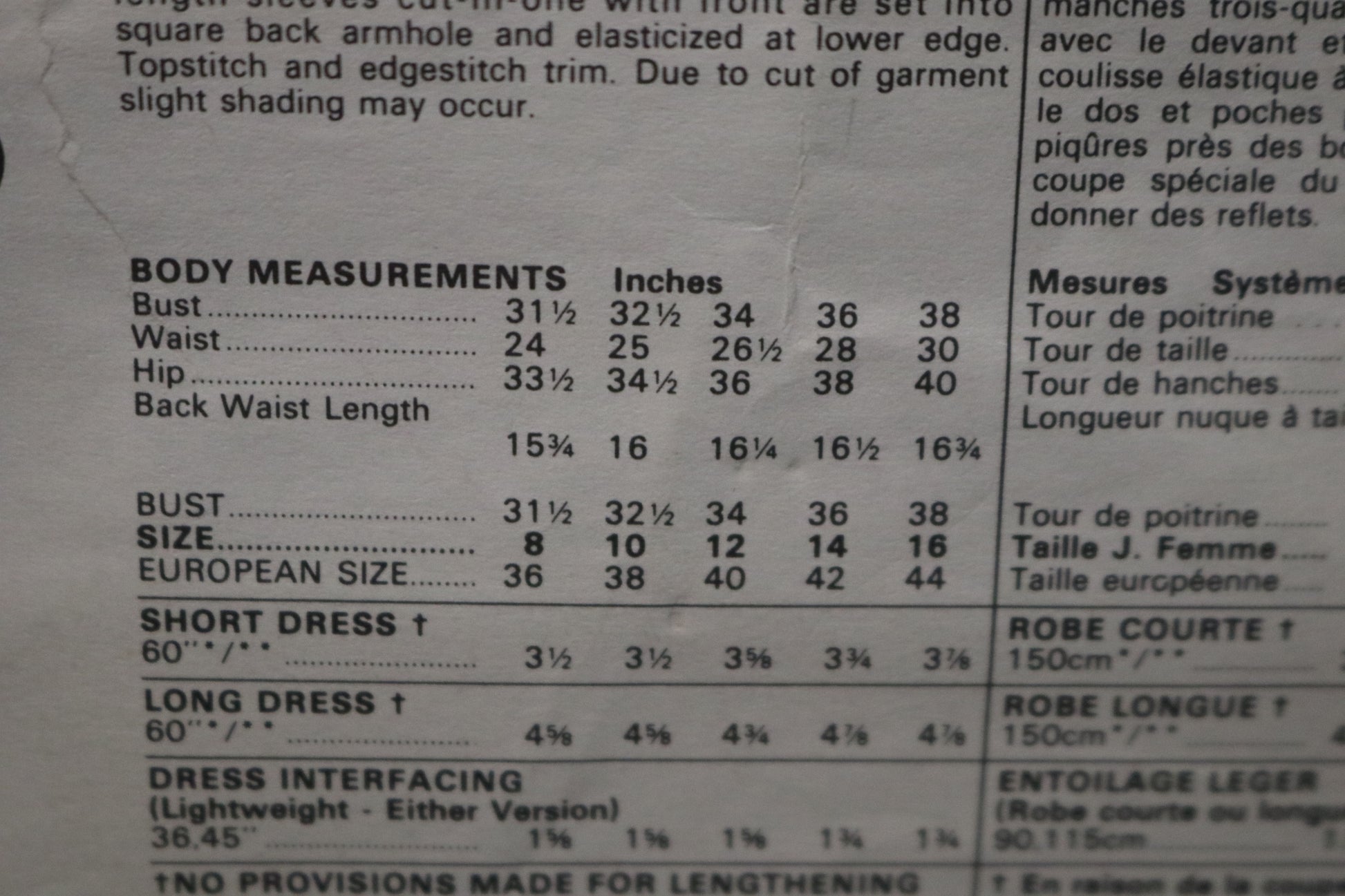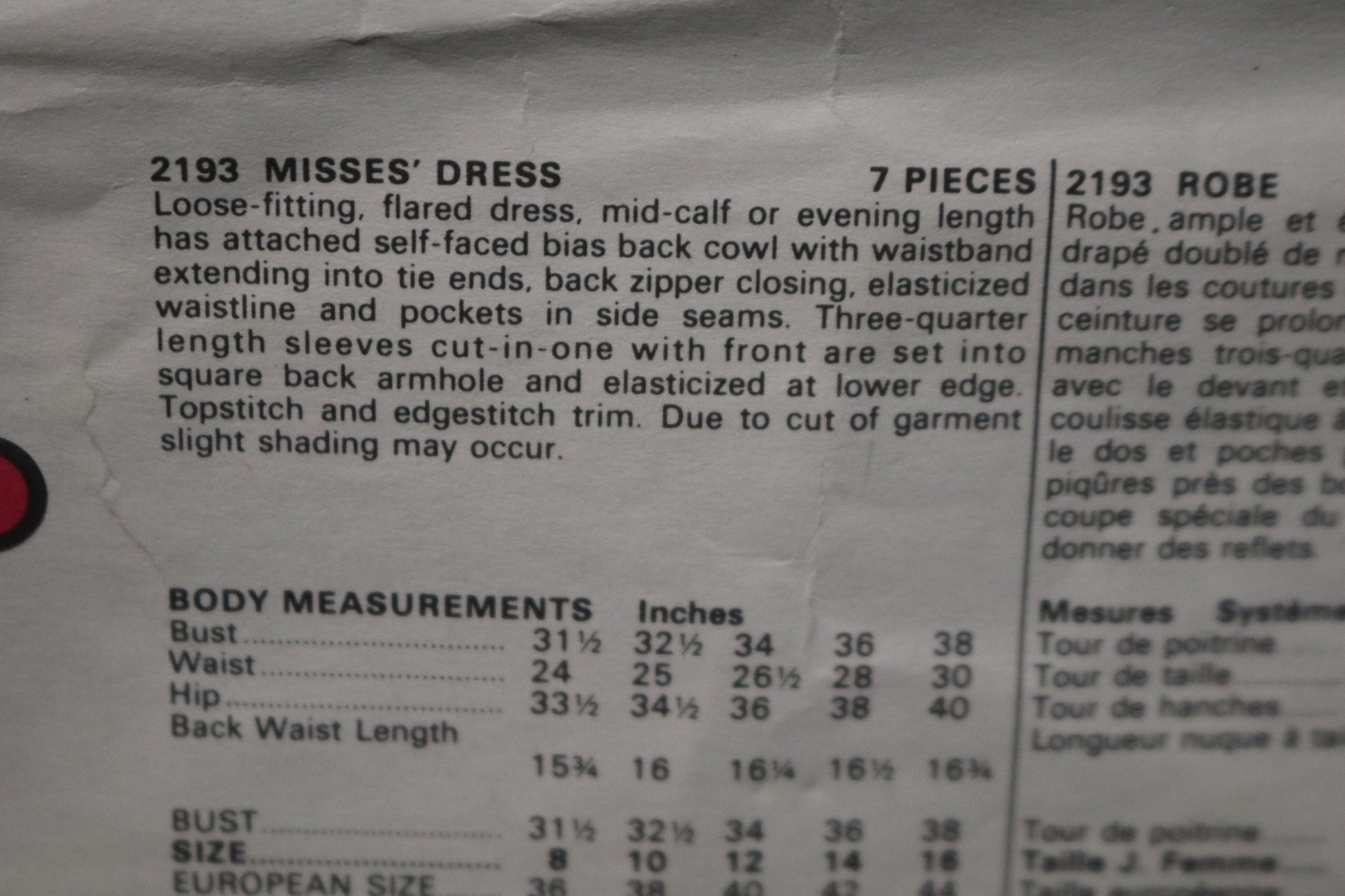 Loose-fitting, flared dress mid calf or evening length has attached self-faced bias back cowl with waistband extending into tie ends., back zipper closing, elasticized waistline and pockets in side seams. Three-quarter length sleeves cut-in-one with front are set into square back armhole and elasticized at lower edge. Topstitch and edgestitch trim. Due to cut of garment slight shading may occur.