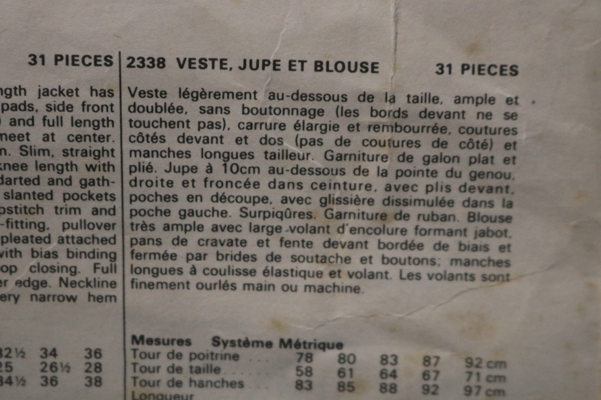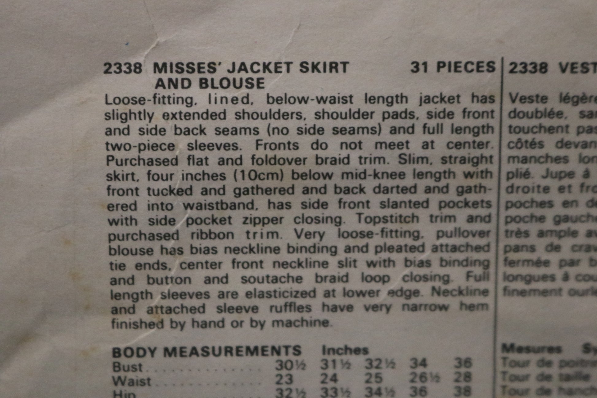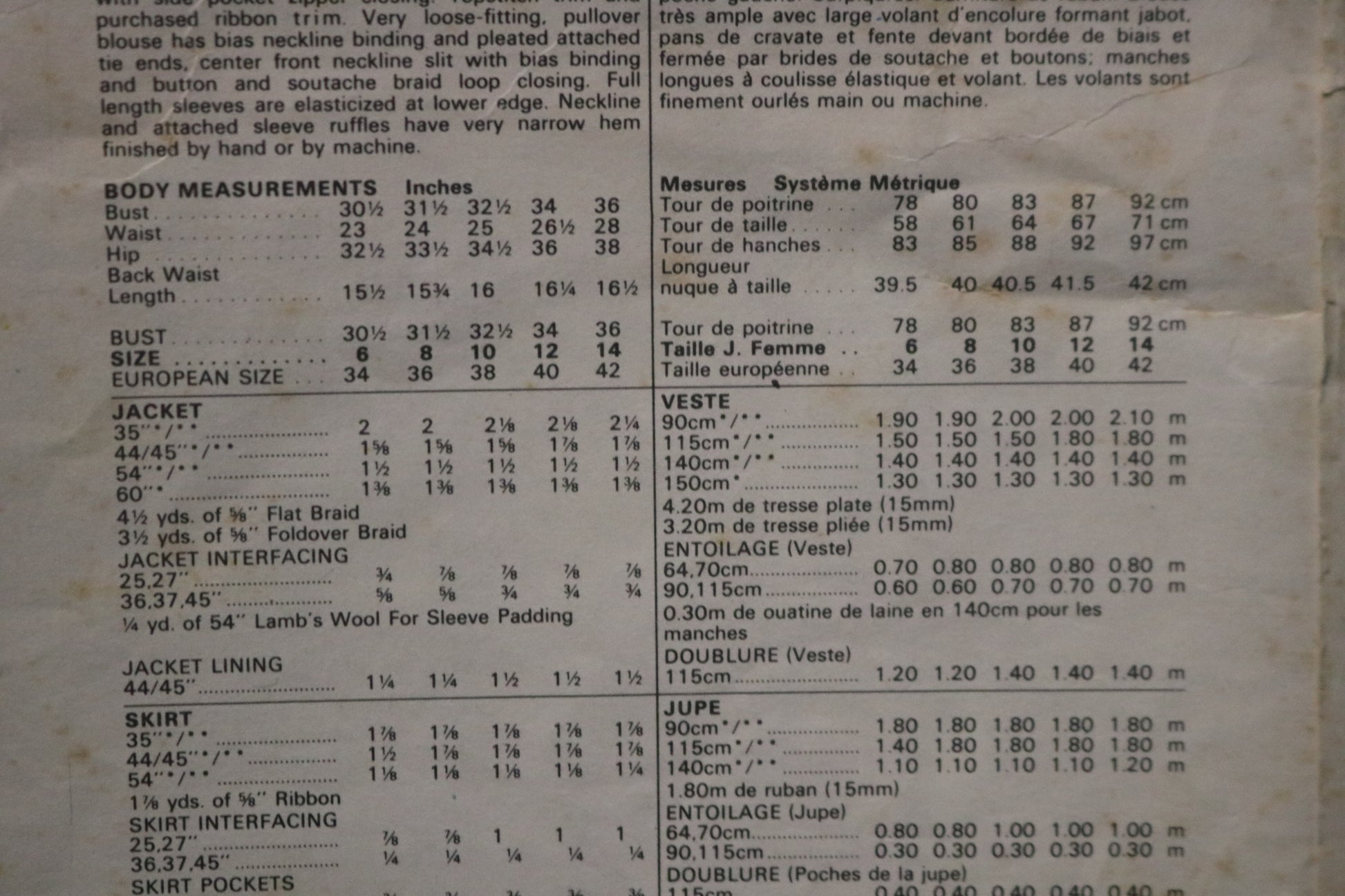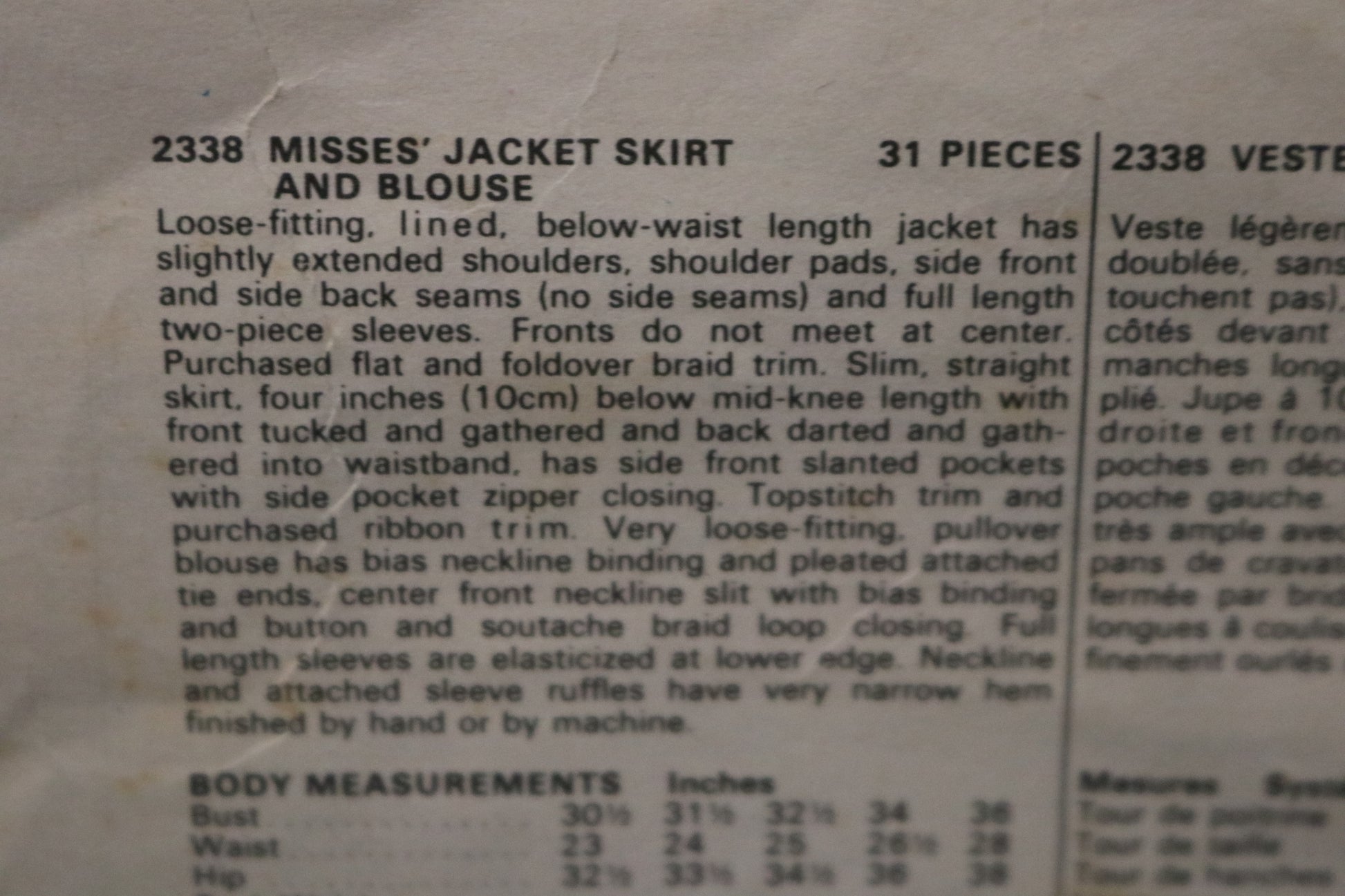 Loose-fitting, lined, below-waist length jacket has slightly extended shoulders, shoulder pads, side front and side back seams (no side seams) and full length two-piece sleeves. Fronts do not meet at center. Purchased flat and fold over braid trim. Slim, straight skirt, four inches below mid-knee length with front tucked and gathered and back darted and gathered into waistband, has side front slanted pockets with side pocket zipper closing. Topstitch trim and purchased ribbon trim. Very loose-fitting pullover blouse has bias neckline binding and pleated attached tie ends, center front neckline slit with bias binding and button and soutache braid loop closing. Full length sleeves are elasticized at the lower edge. Neckline and attached sleeve ruffle have very narrow hem finished by hand or by machine.