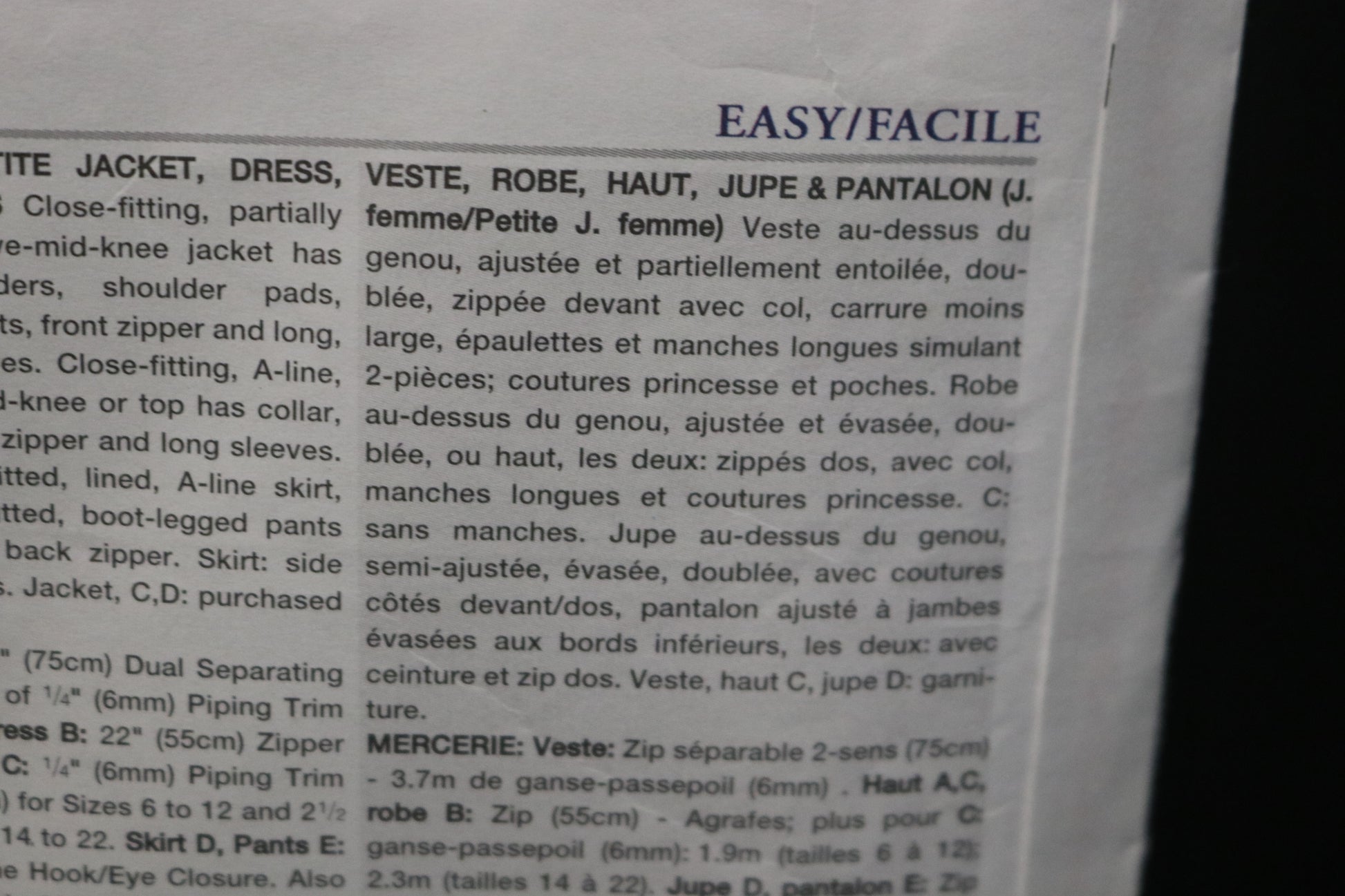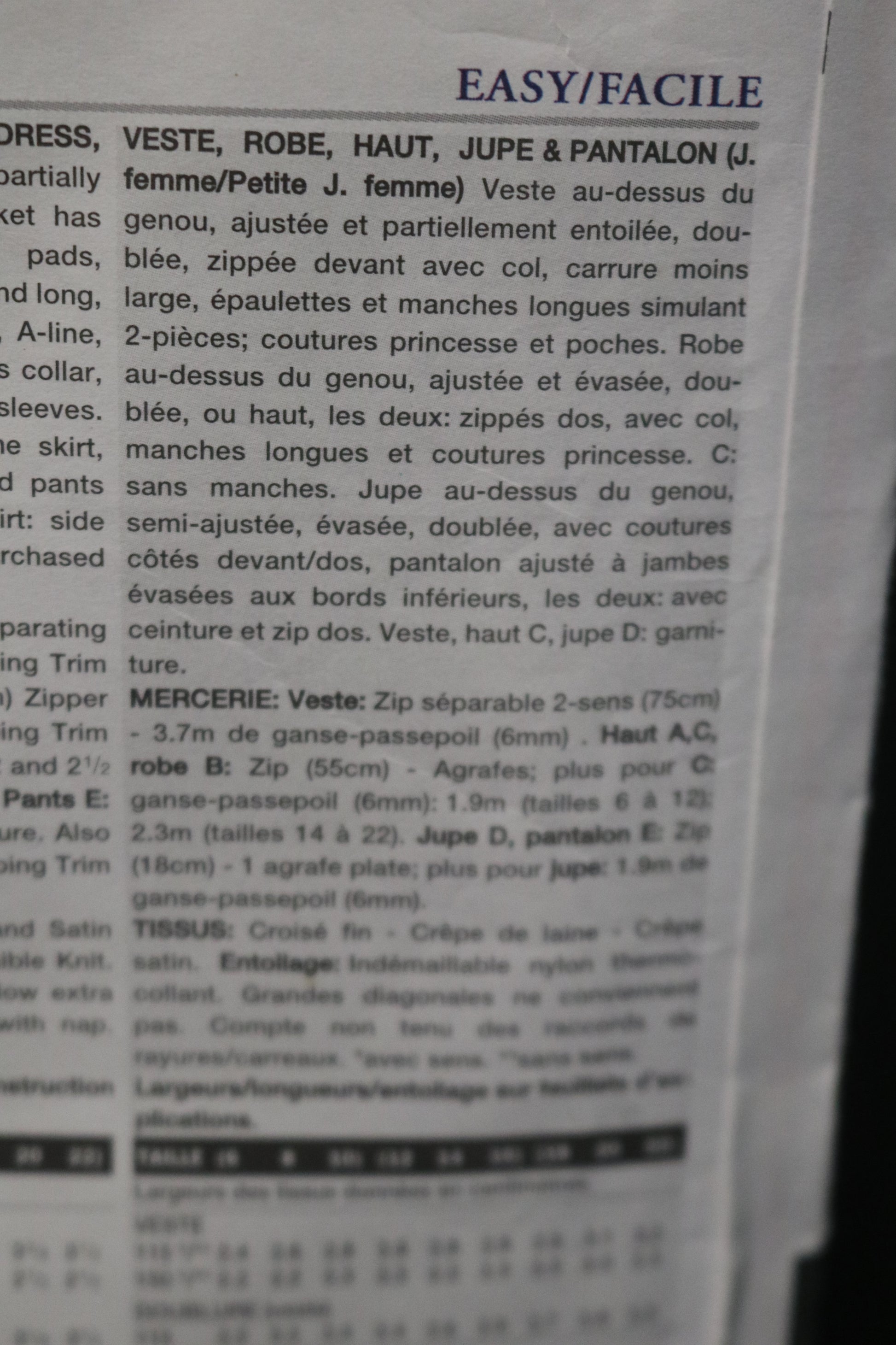 Close-fitting, lined, above mid knee jacket has collar, cut in shoulders, shoulder pads, princess seams, pockets, front zipper and long two piece effect sleeves. Close fitting, A-line lined dress, above mid-knee or top has collar, princess seams, back zipper and long sleeves. C: sleeveless,semi fitted; lined A line Skirt . above mid knee or fitted, boot legged pants havce waistband and back zipper. Skirt: side front/side back seams. Jacket C,D: purchased trims.
