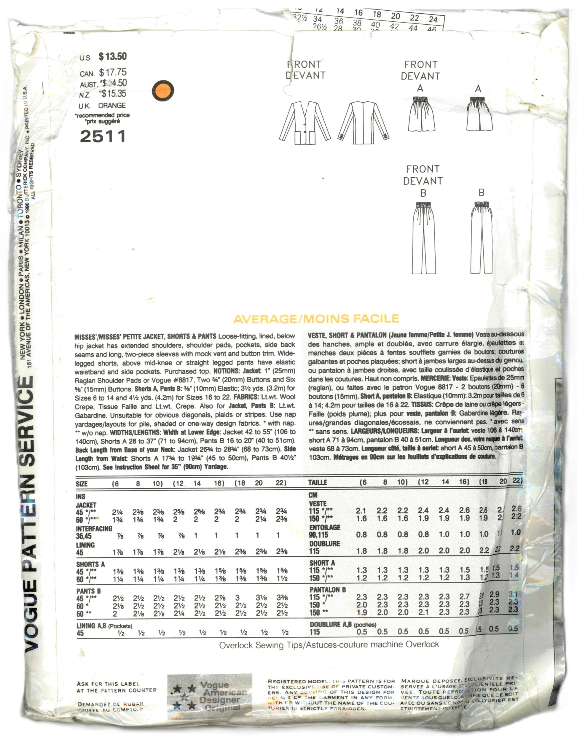 Vogue 2511 Donna Karan DKNY Misses / Misses Petite Jacket Shorts and Pants Sewing Pattern