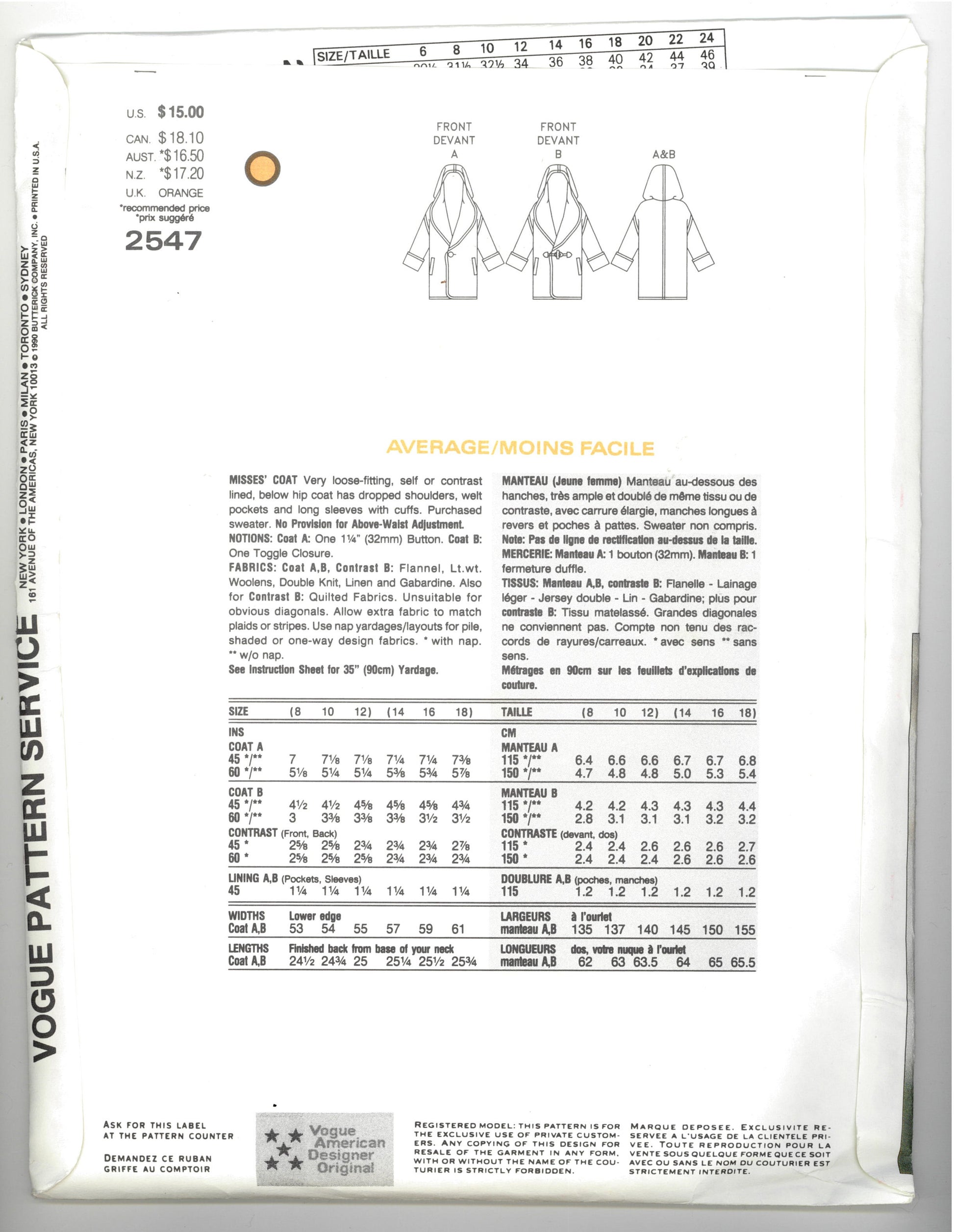 Vogue 2547 Donna Karan DKNY Misses Coat Sewing Pattern - UNCUT - Size 14 16 18