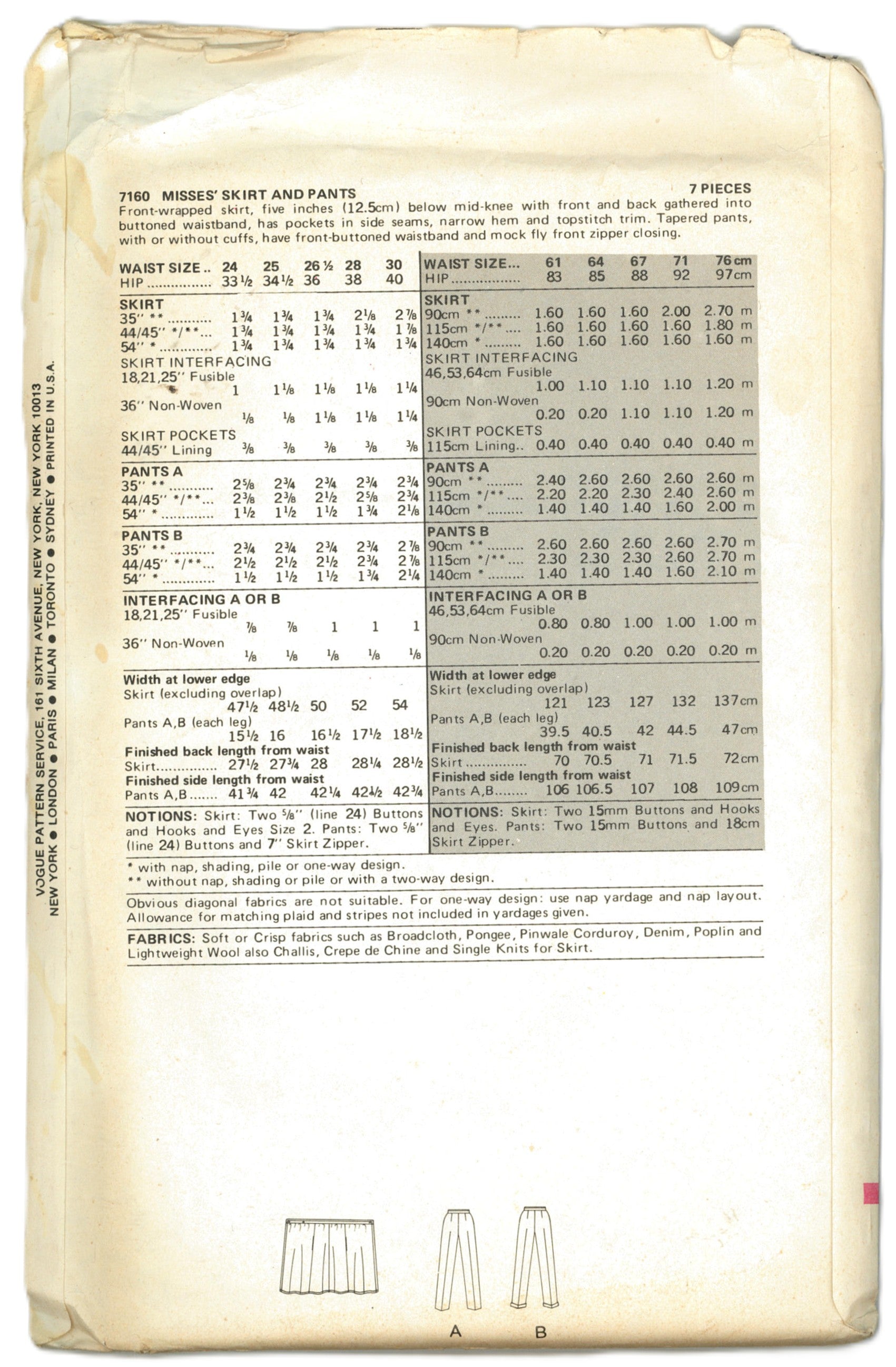 Vogue 7160 Misses Skirt and Pants Sewing Pattern