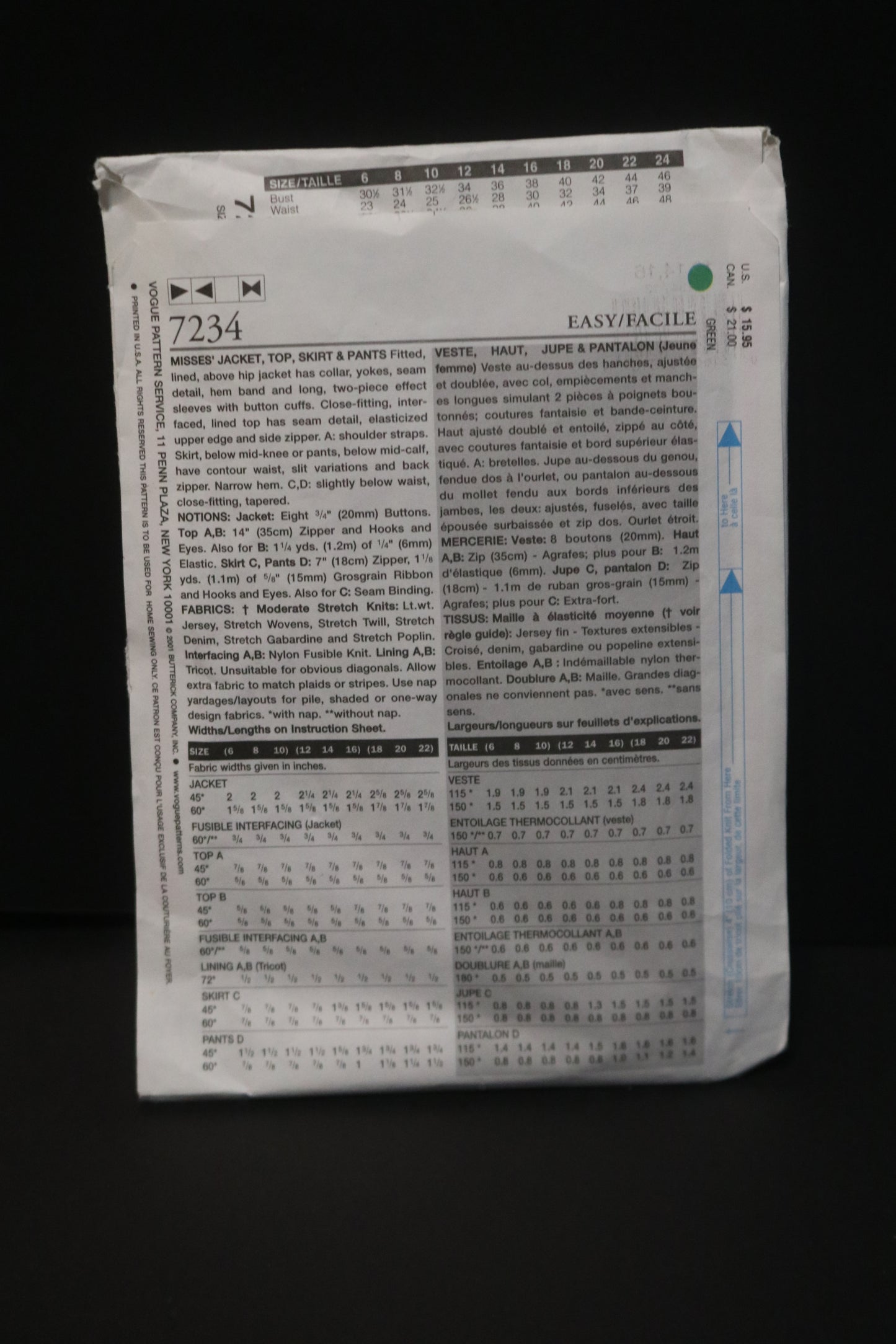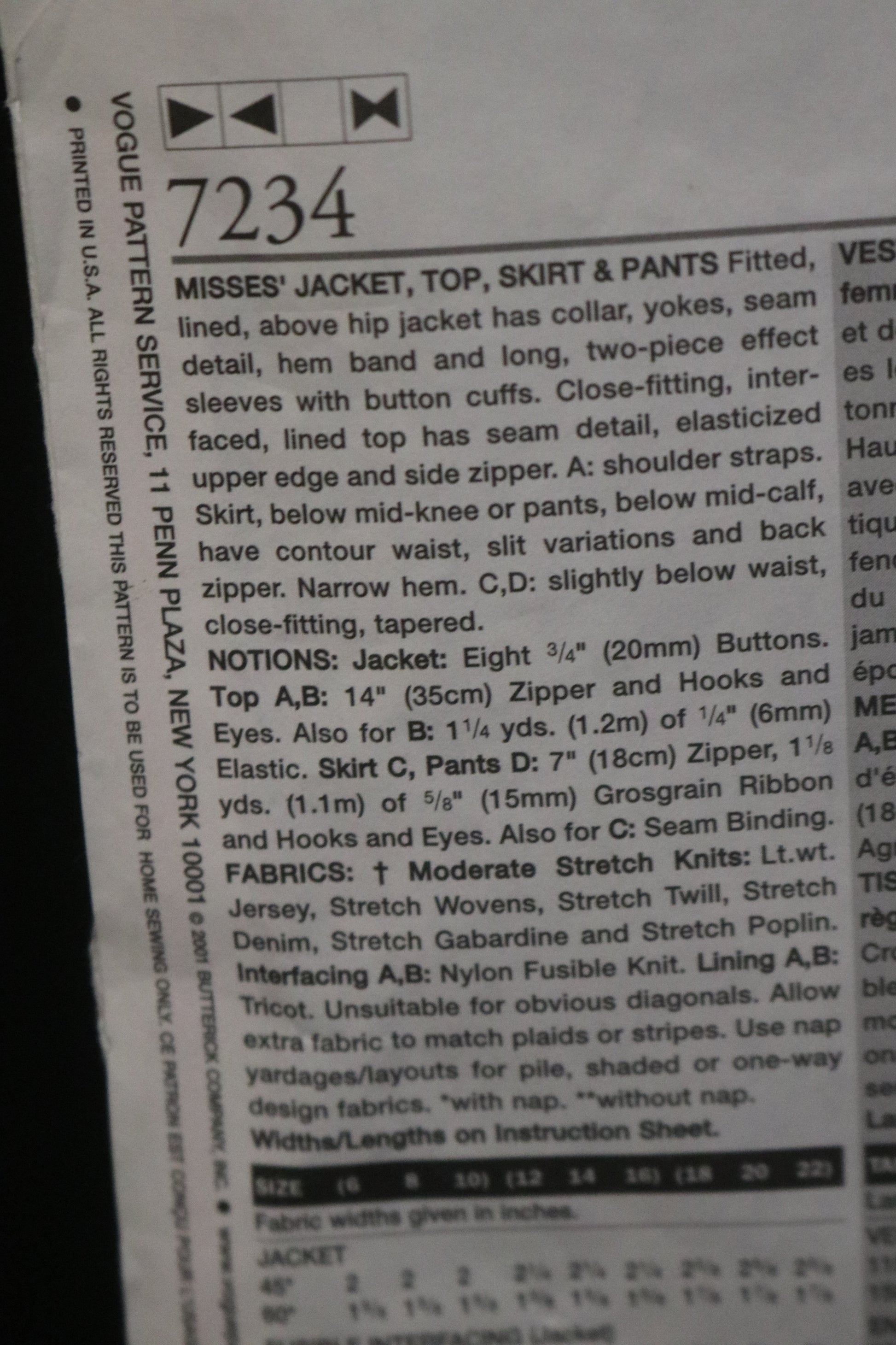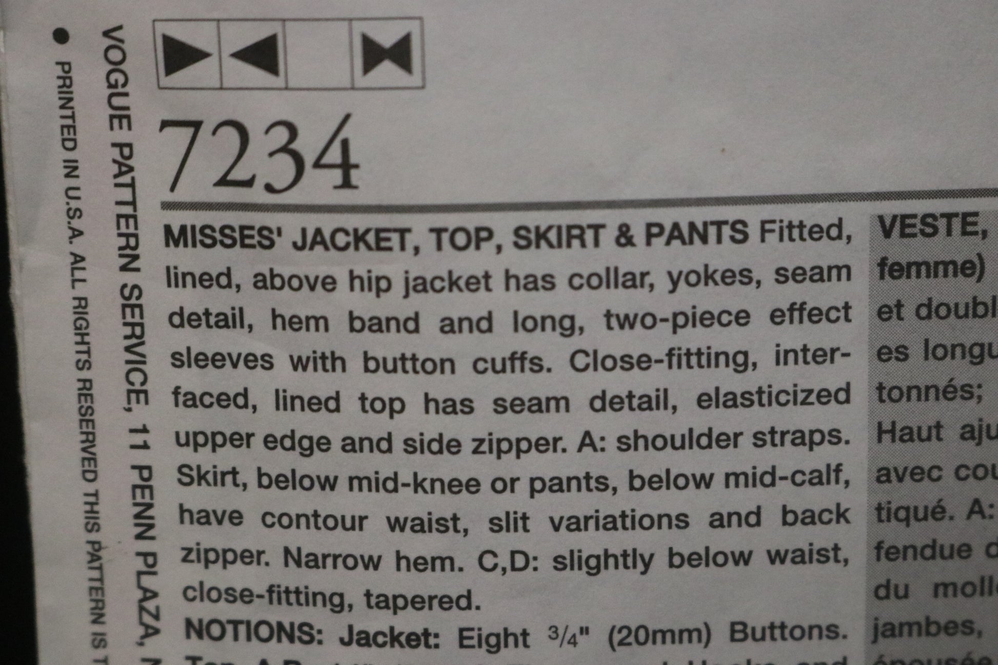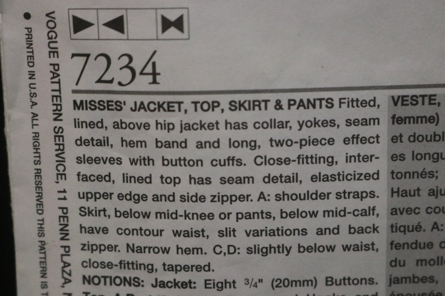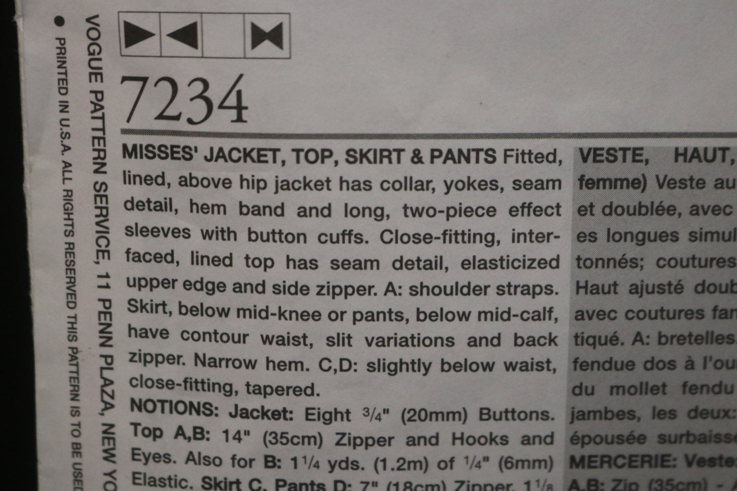 Vogue 7234 Misses Jacket Top Skirt and Pants Sewing Pattern