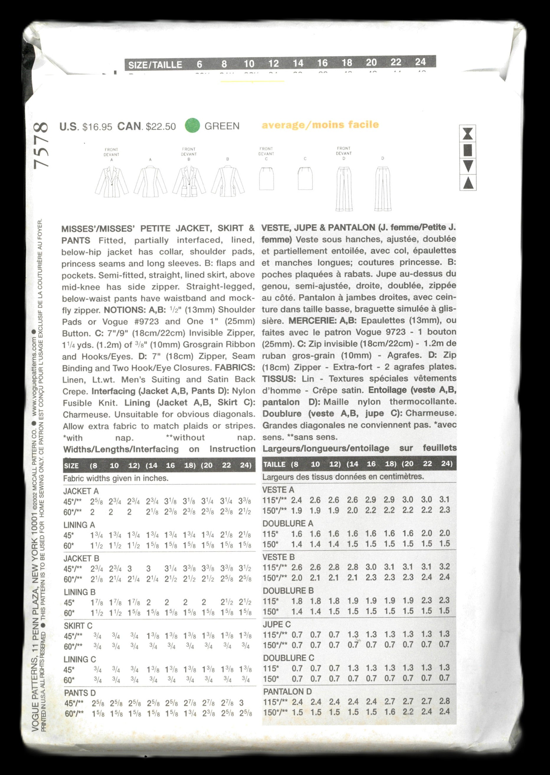 Vogue 7578 The Vogue Woman Misses / Misses Petite Jacket Skirt and Pants Sewing Pattern