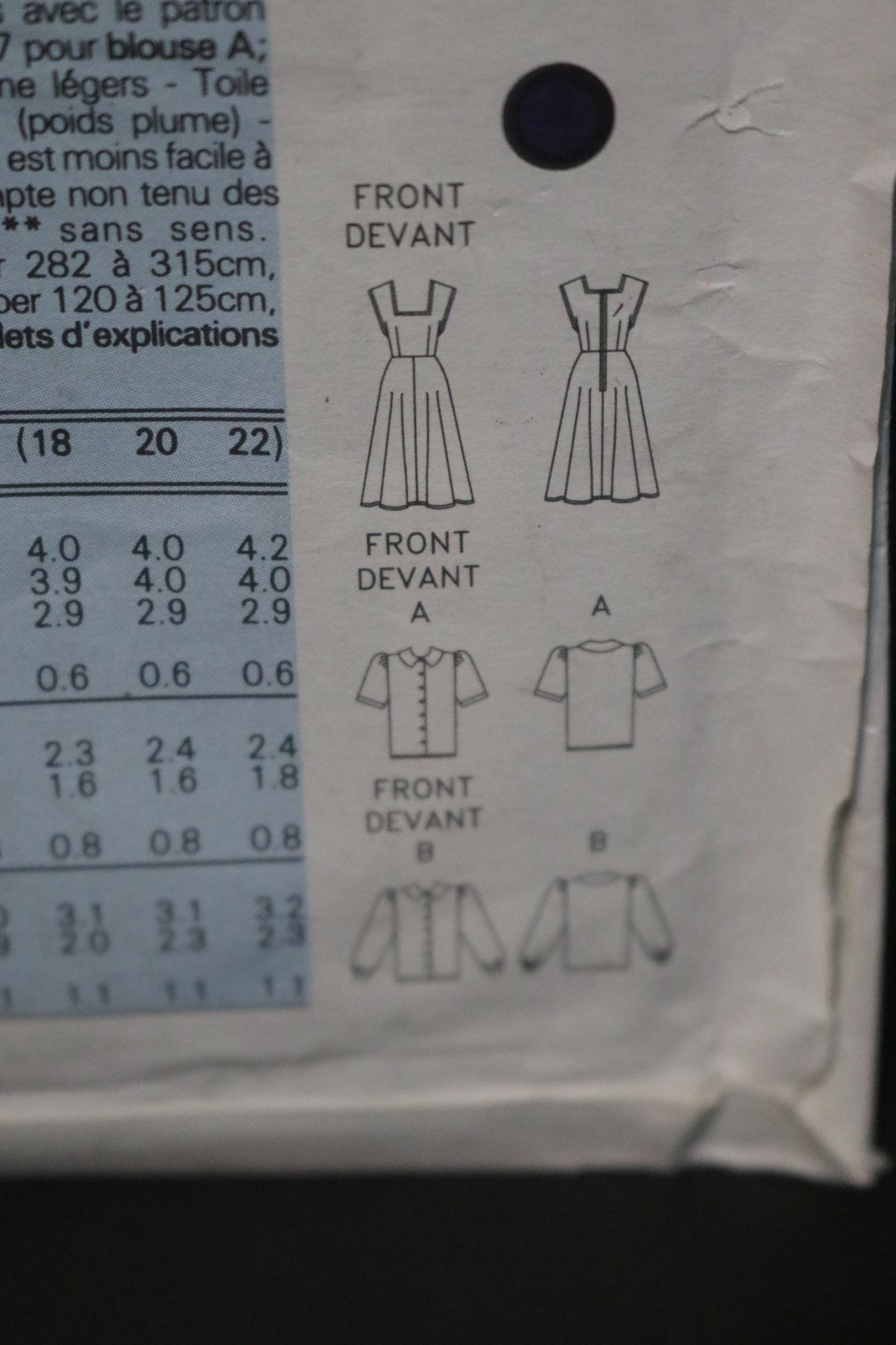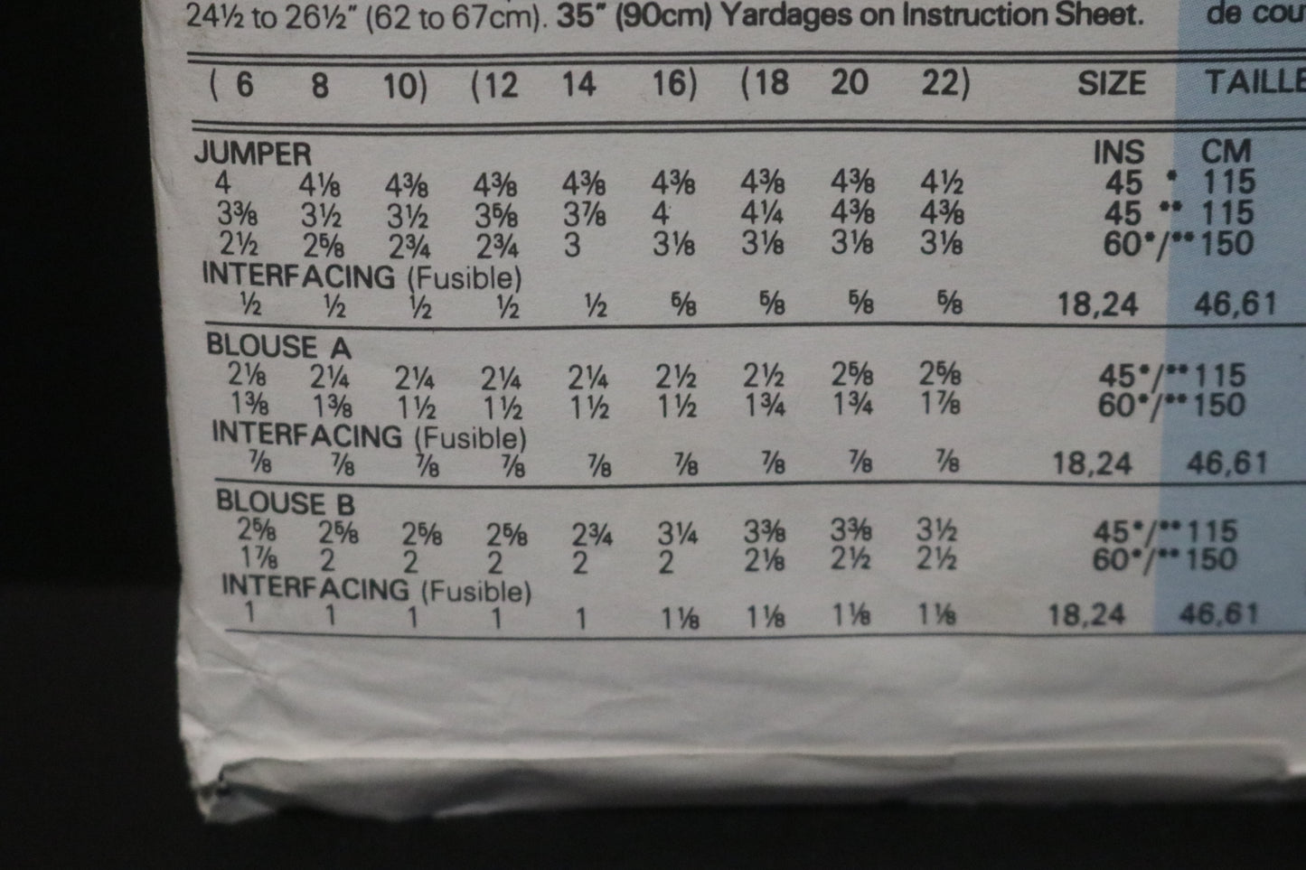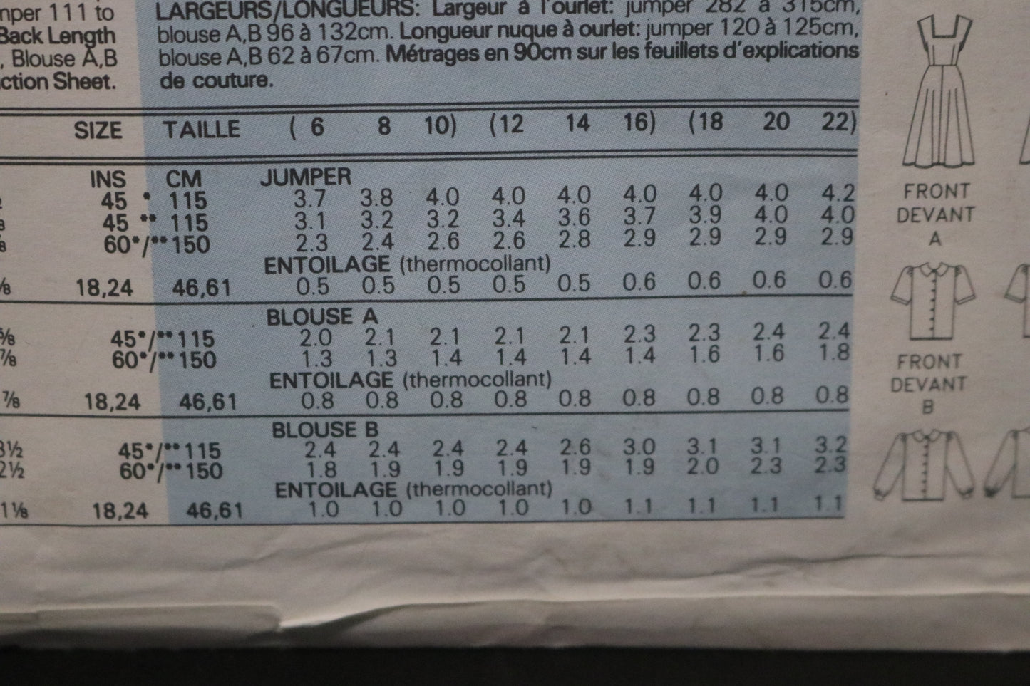 Jumper, lower calf, has dropped shoulders, semi-fitted bodice, flared skirt and back zipper. Narrow hem. Loose-fitting blouse has collar, extended shoulders, shoulder pads and above elbow sleeves with stitched hems or long sleeves with button cuffs. Narrow hem. Purchased bow and belt.