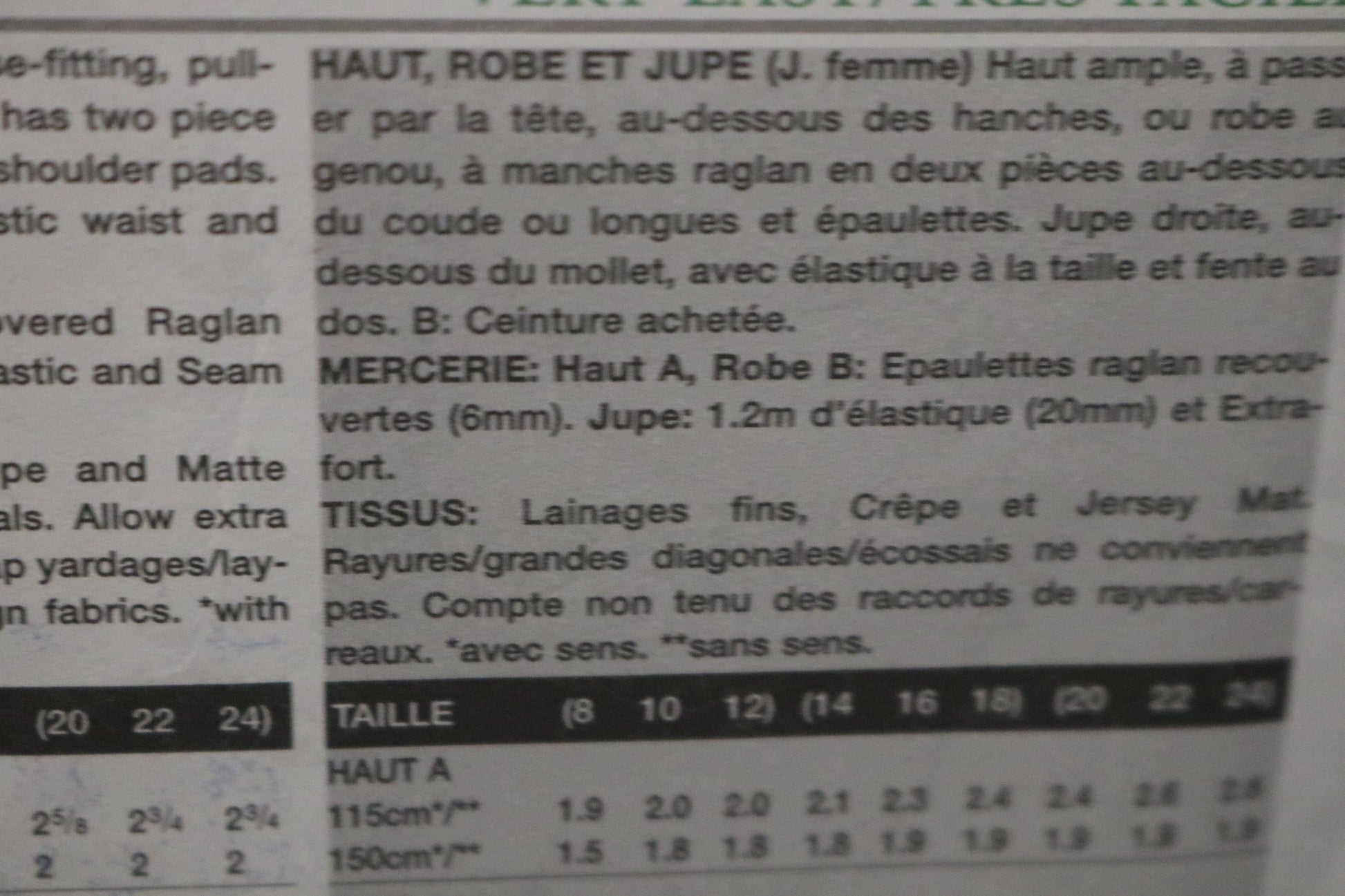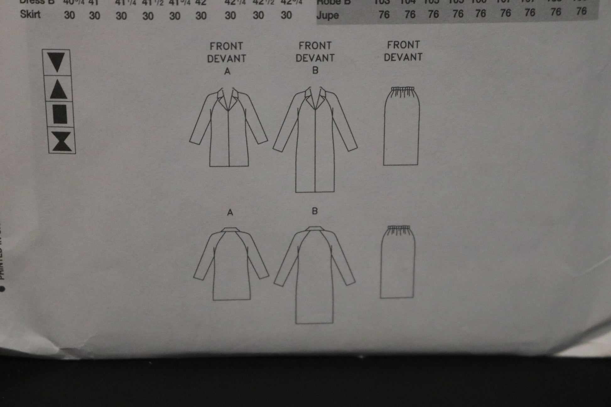 Loose fitting, pullover top below hip or dress, mid knee, has two piece raglan, below elbow or long sleeves and shoulder pads. Straight skirt, below mid calf, has elastic waist and back slit. B; purchased Belt.