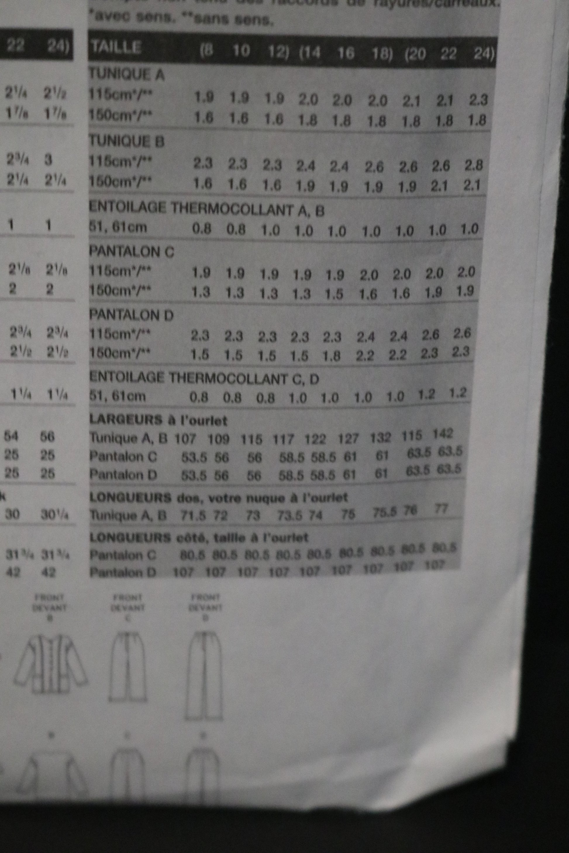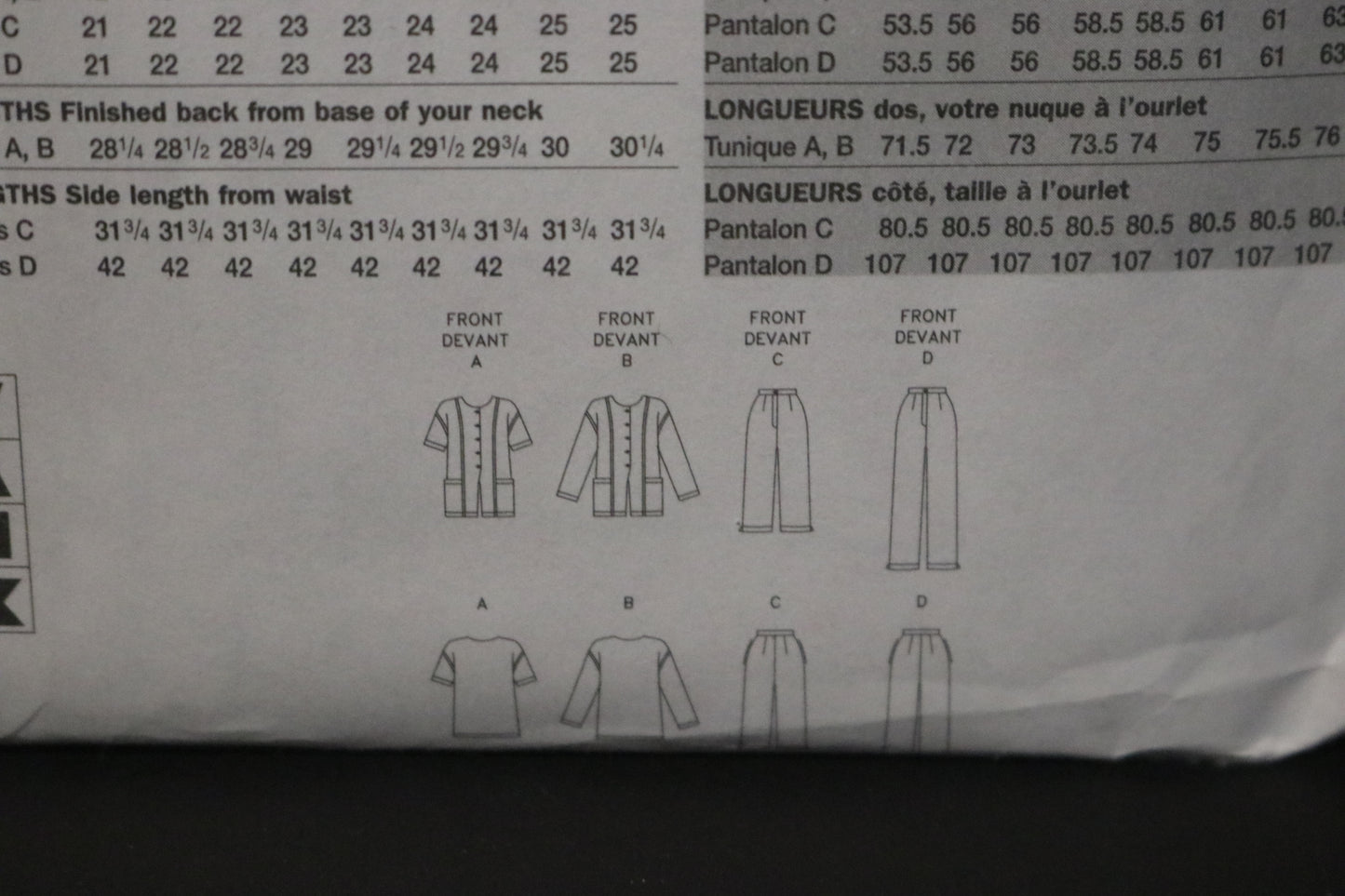loose fitting tunic has sleeve variations, front princess seams, pockets and button front closure. A; above elbow sleeves. B long sleeves, Straight legged pants, lower calf or floor length, has zipper closure, waistband and side slits. All garments have stitched hems.