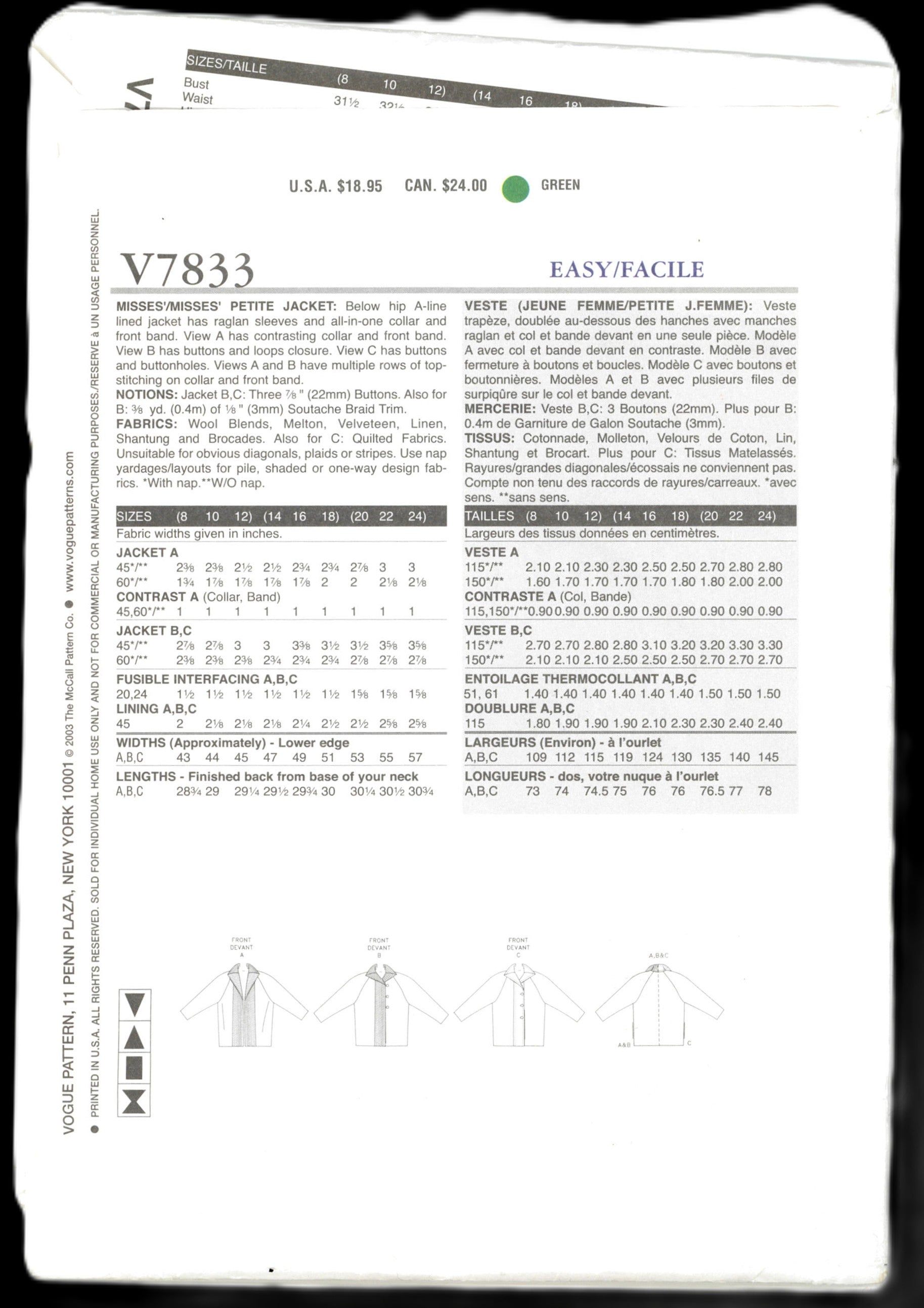 Vogue 7833 Misses / Miss Petite Jacket Sewing Pattern