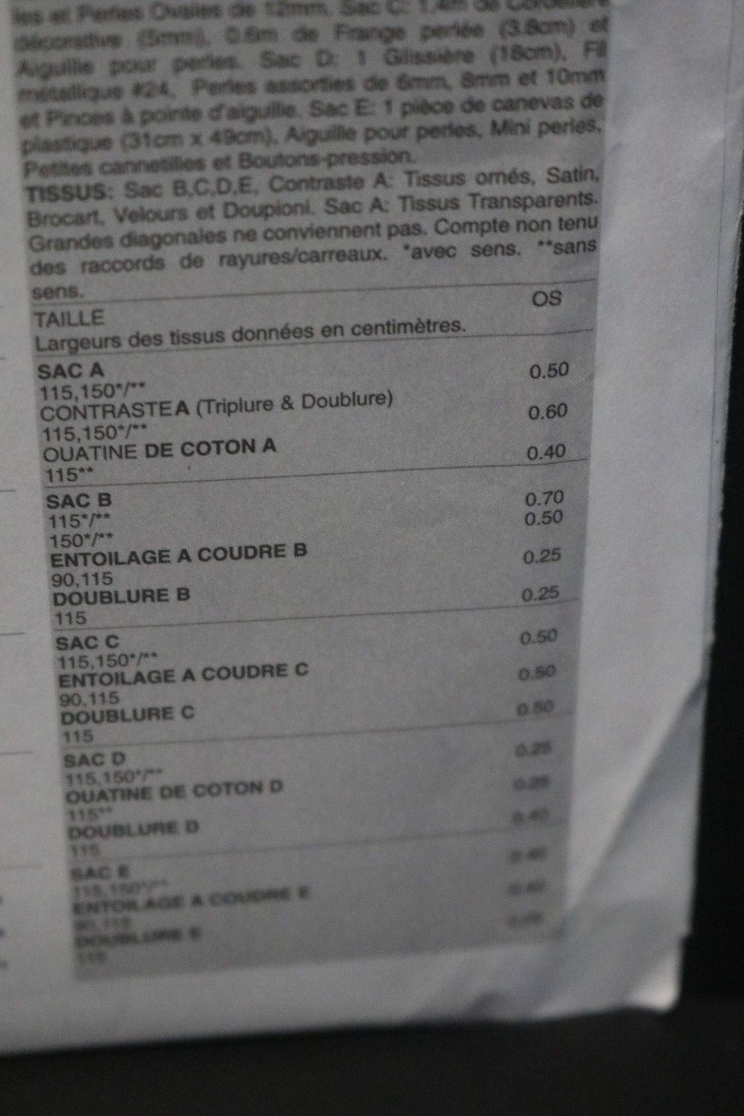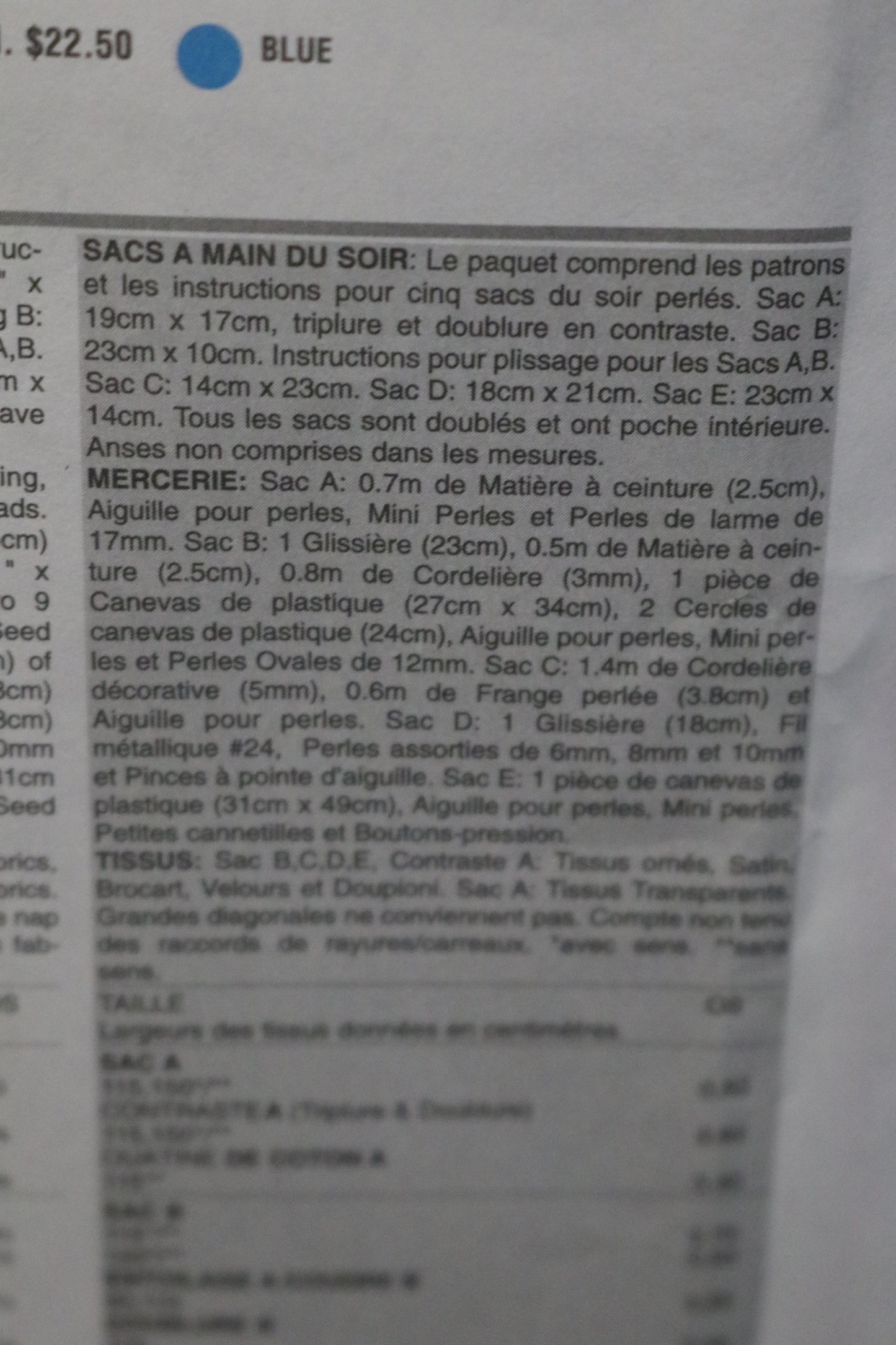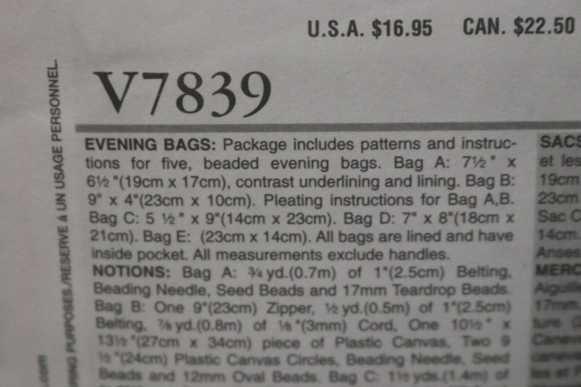 Package includes patterns and instructions for Five Beaded Evening bags: Bag A: 7 ½” x 6 ½”, contrast underlining and lining.