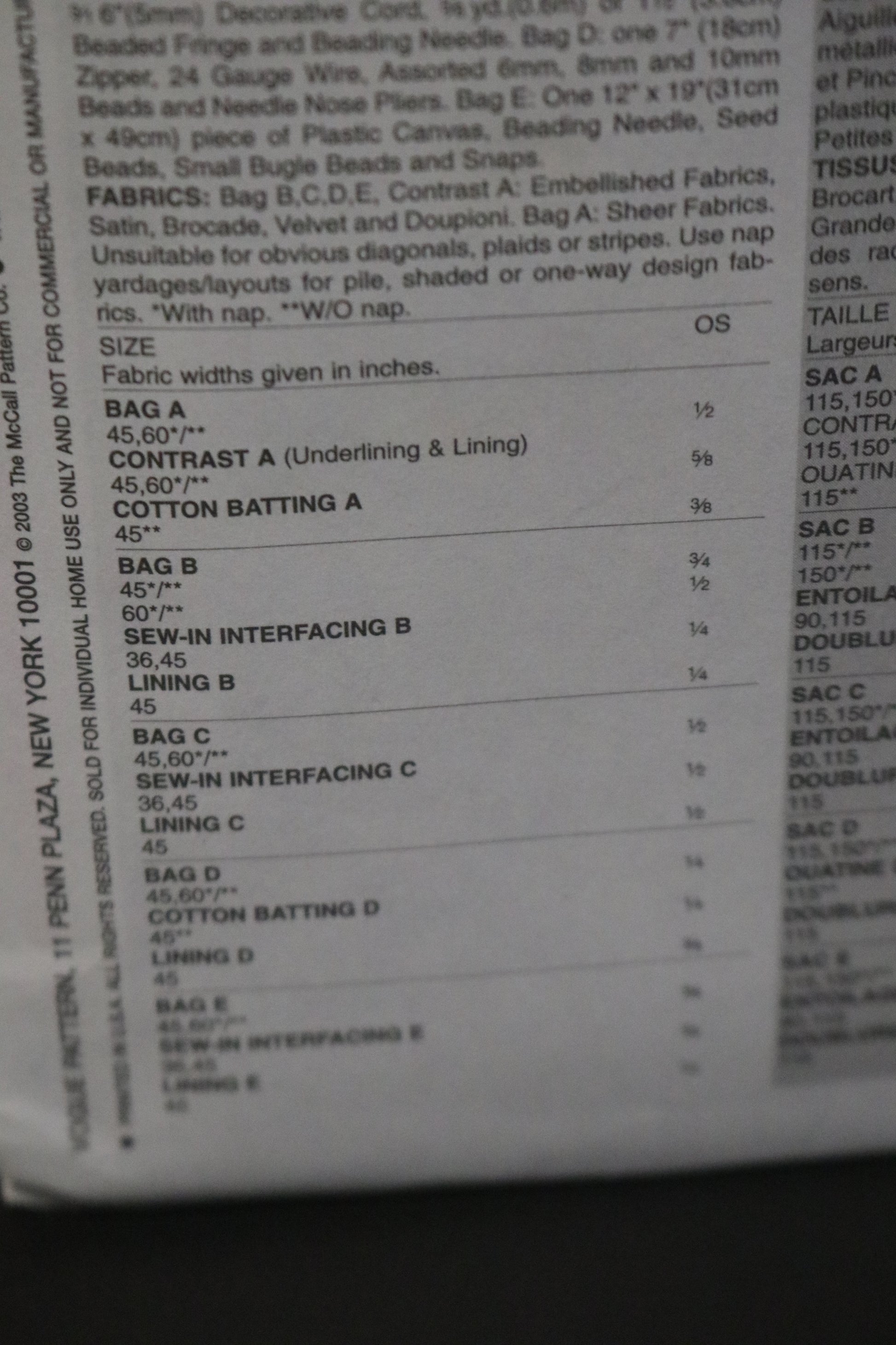 Bag B: 9” x 4”. Pleating instructions for Bag A,B. Bag C: 5 ½” x 9”. Bag D: 7” x 8”. Bag E: 23cm x 14cm.