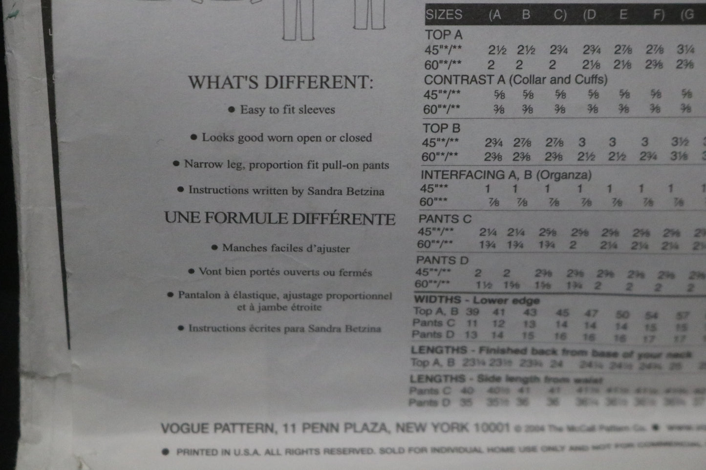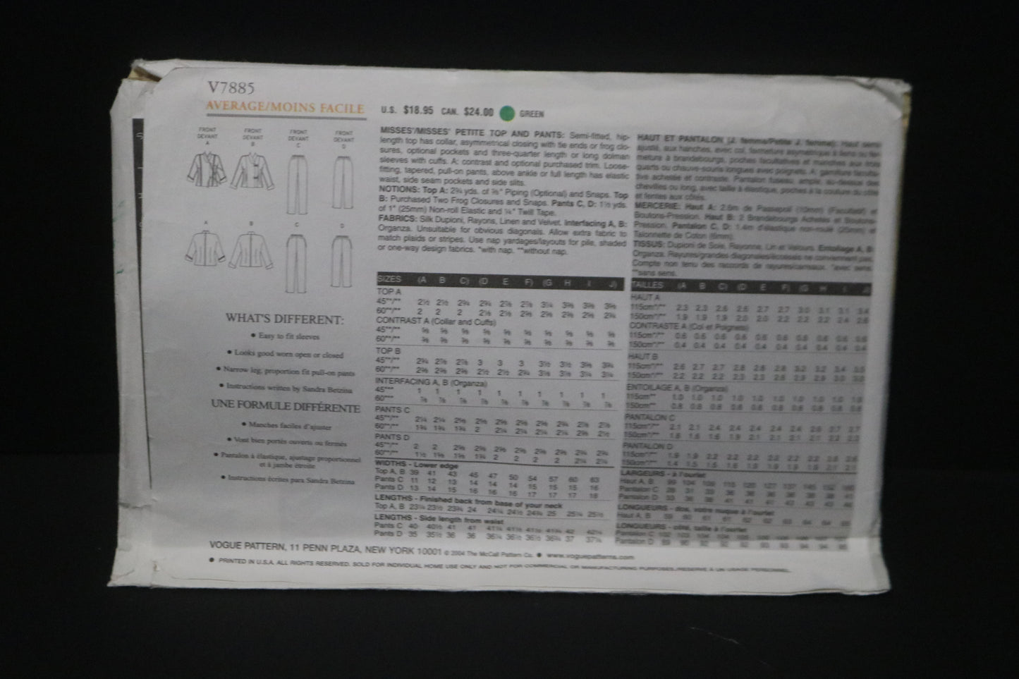 Vogue 7885 Sandra Betzina Misses / Misses Petite Top and Pants Sewing Pattern - UNCUT - Size D E F or Size G H I J