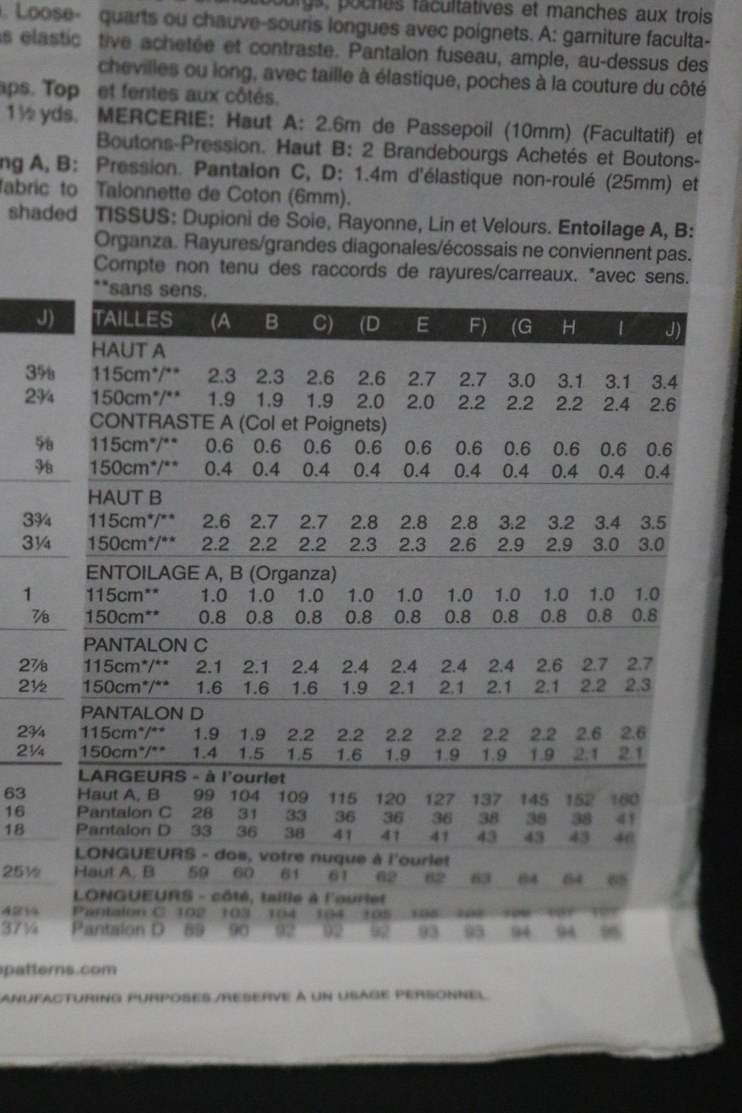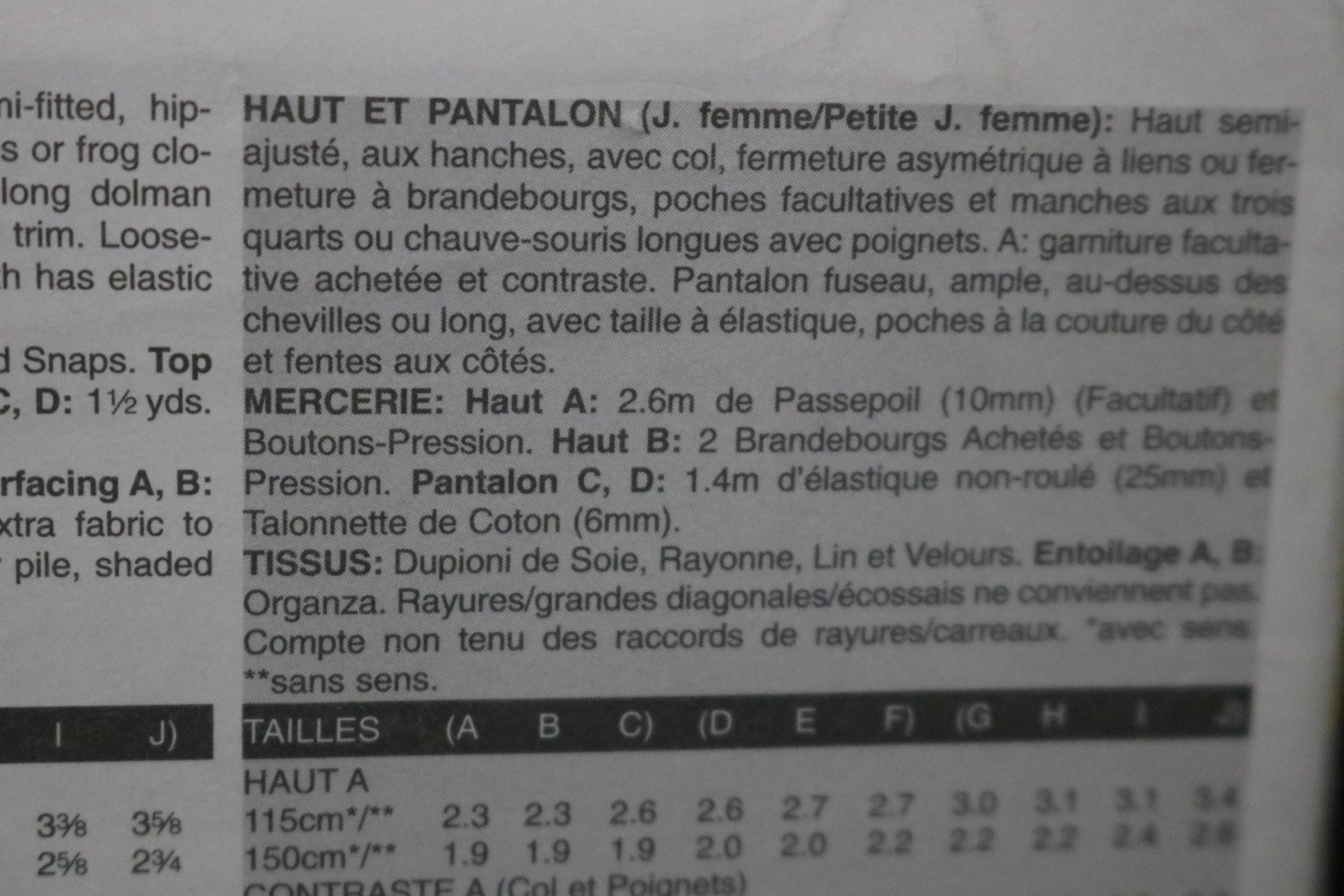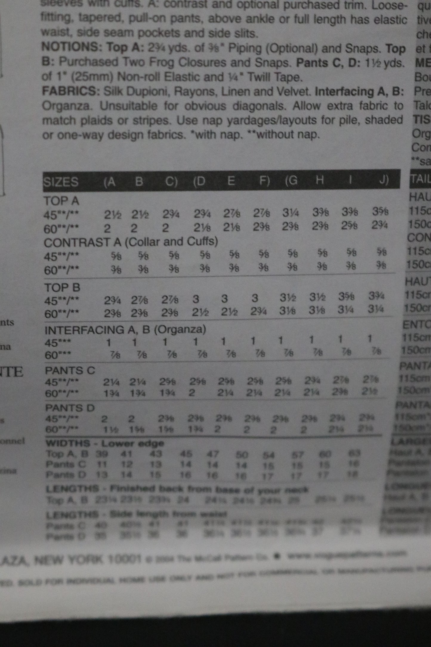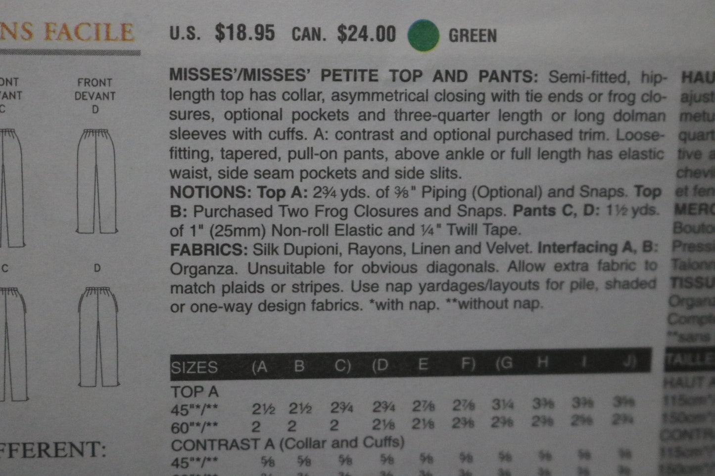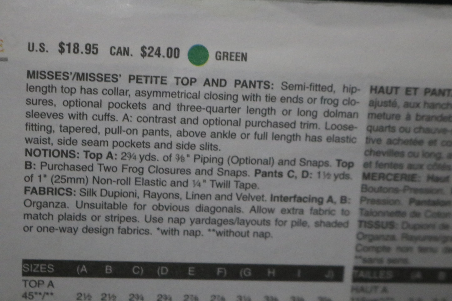 Semi-fitted, hip-length top has collar, asymmetrical closing with tie ends or frog closures, optional pockets and three-quarter length or long dolman sleeves with cuffs. A: contrast and optional purchased trim. Loose-fitting, tapered, pull-on pants, above ankle or full length has elastic waist, side seam pockets and side slits