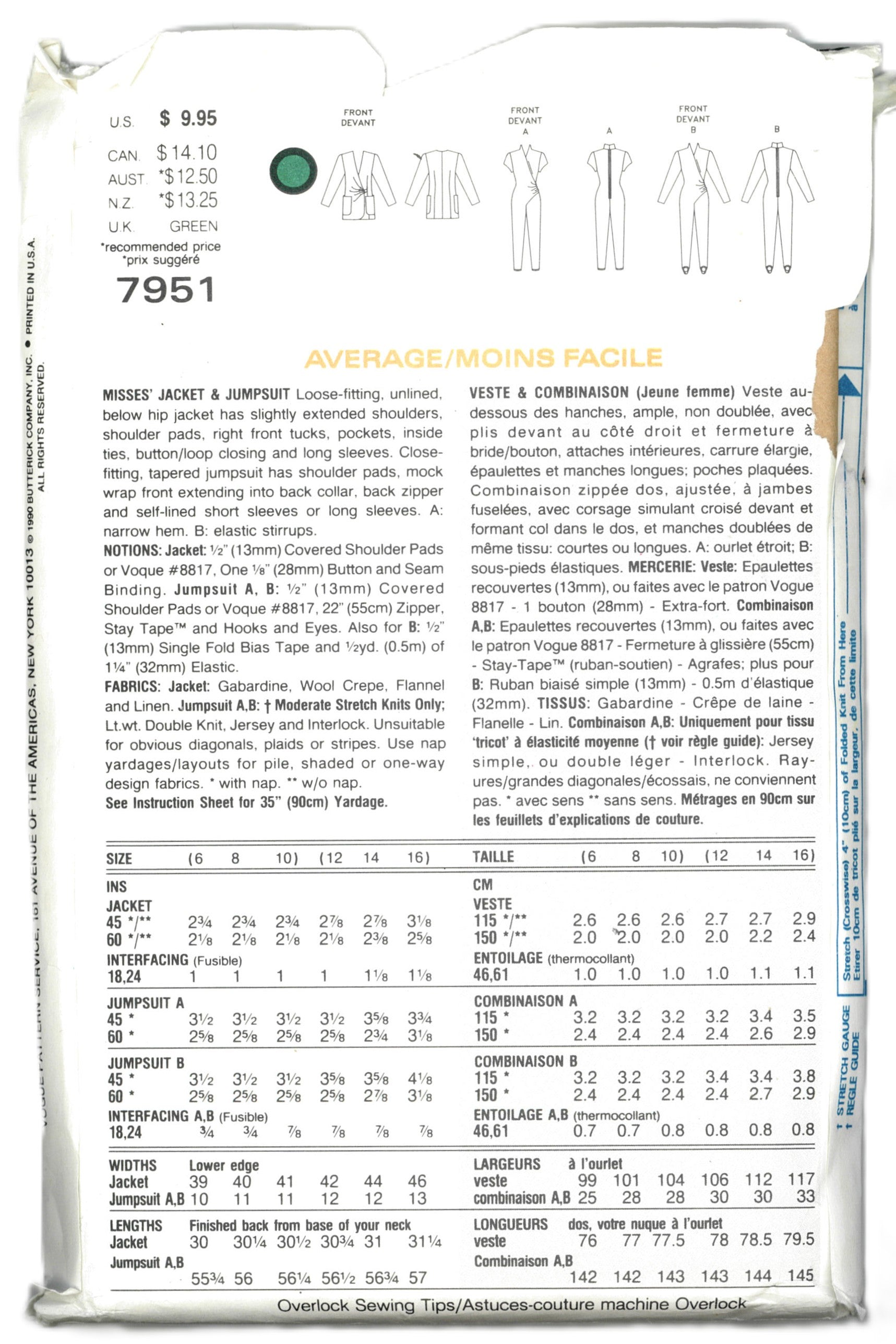 Vogue 7951 Misses jacket and Jumpsuit Sewing Pattern - UNCUT - Size 6 8 10
