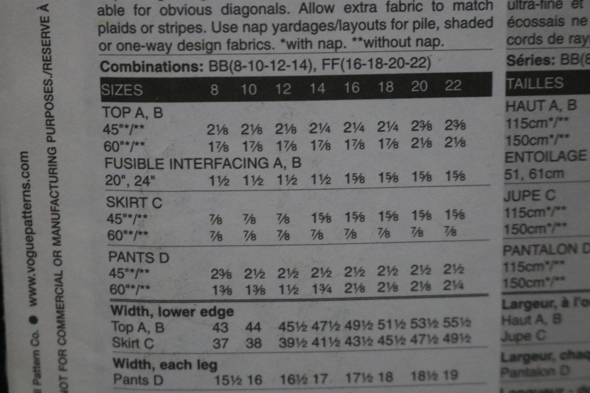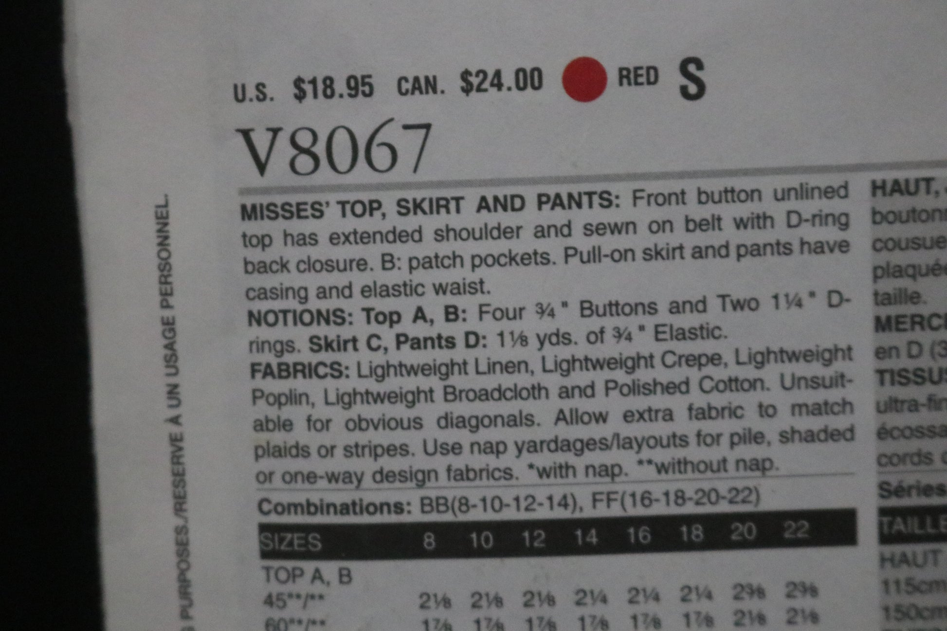 Vogue 8067 Misses Top Skirt and Pants Sewing Pattern