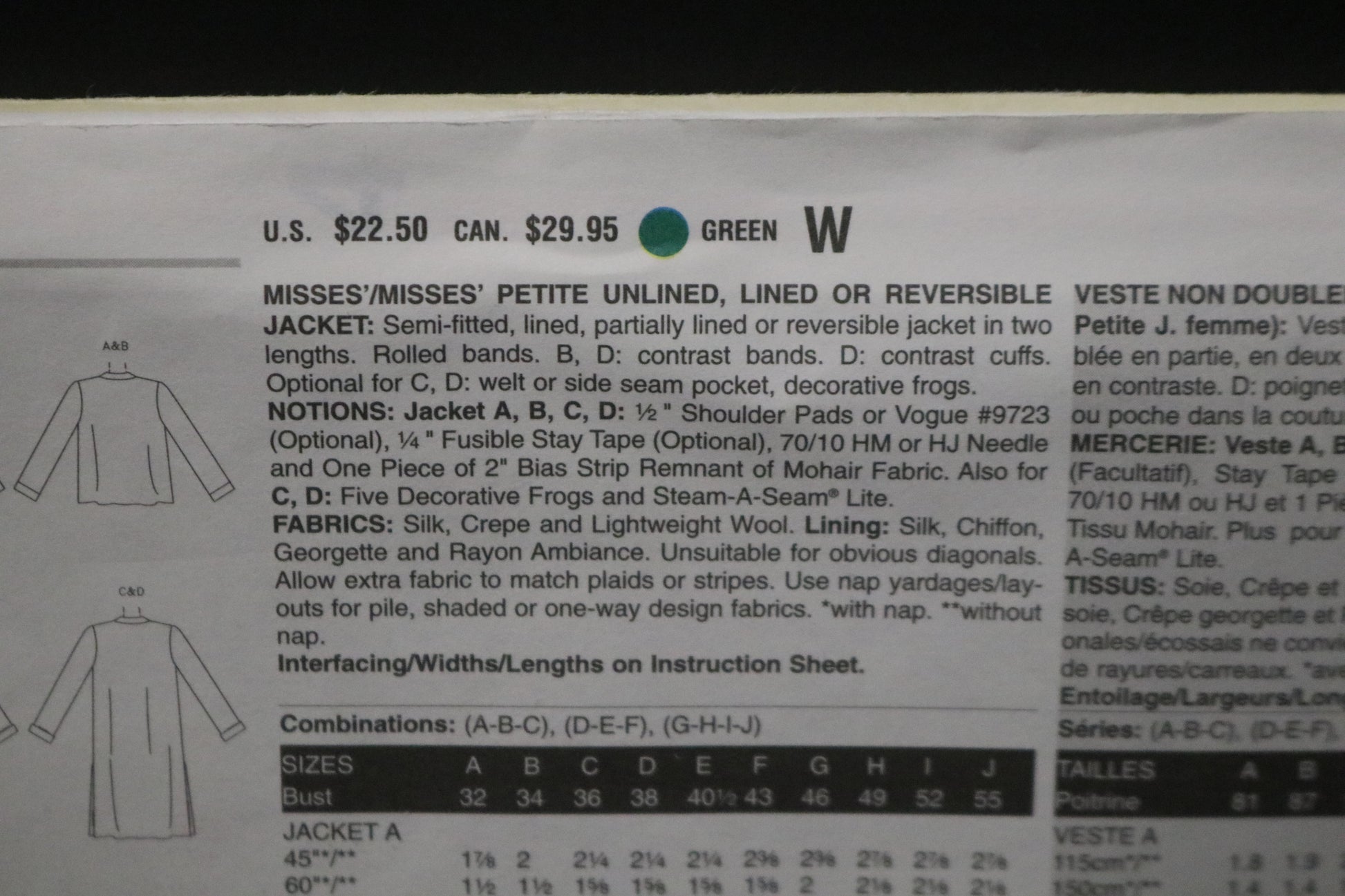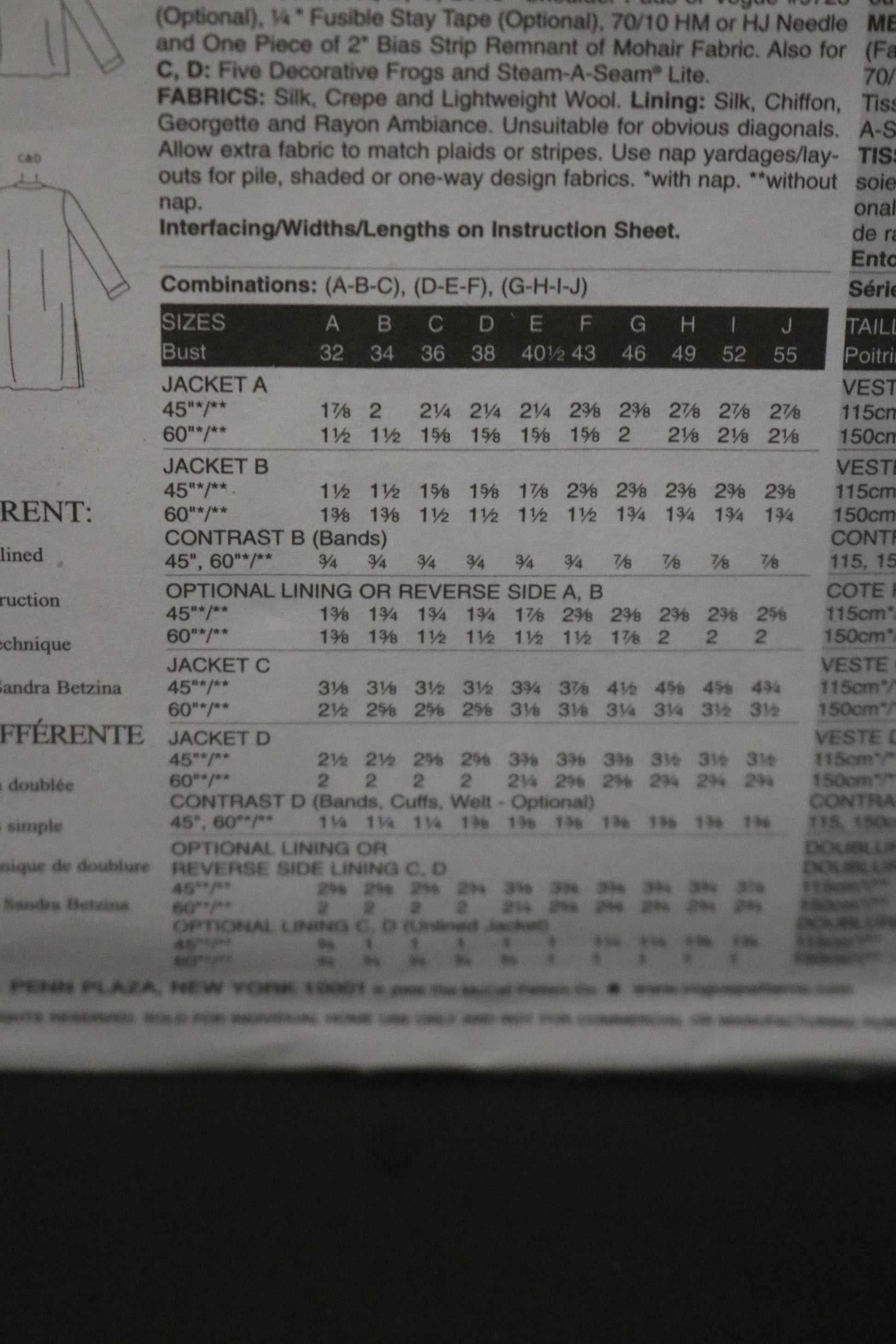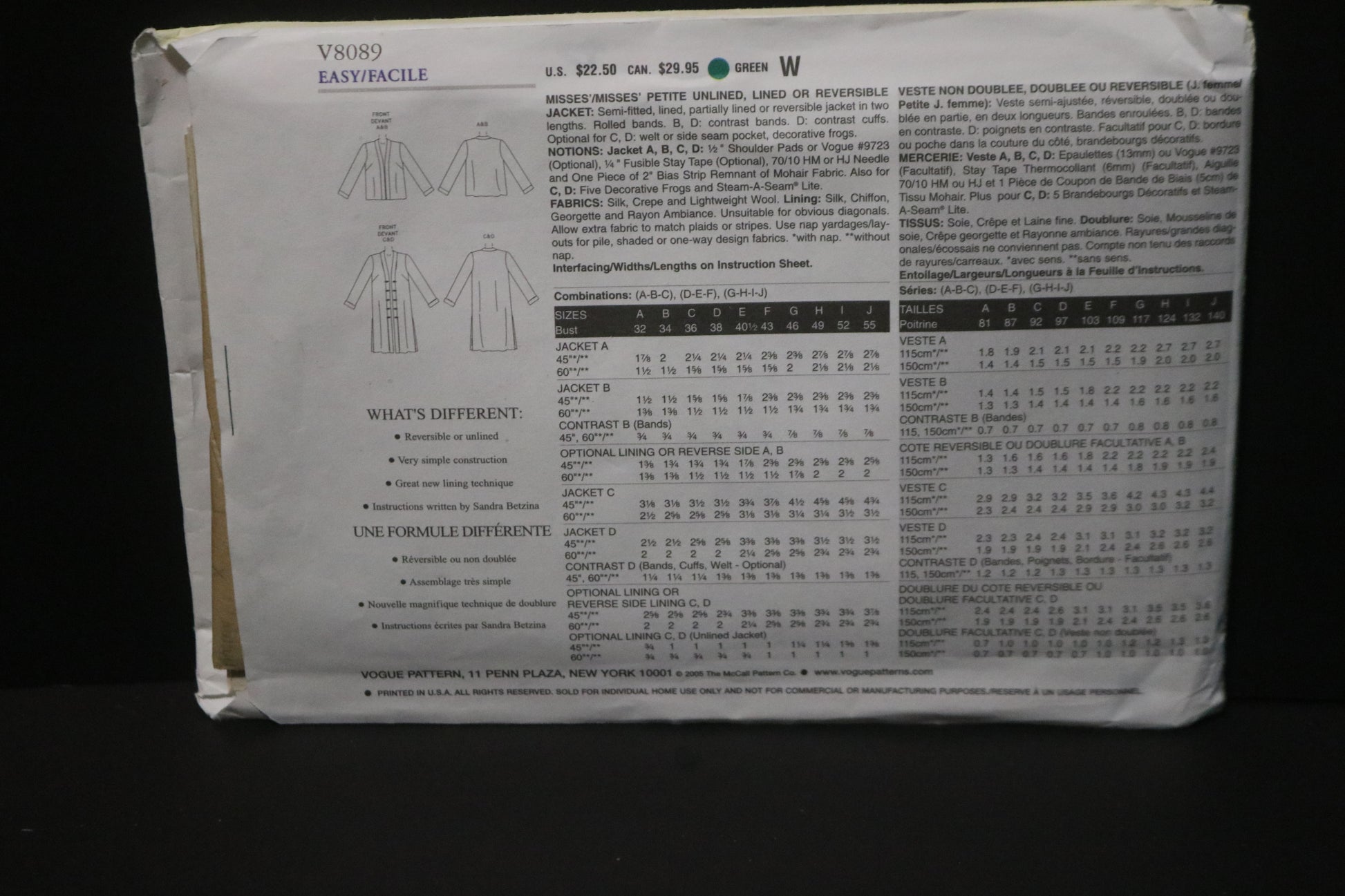 Vogue 8089 Sandra Betzina Misses / Misses Petite Unlined, Lined ot Reversible Jacket Sewing Pattern - UNCUT - Size G H I J