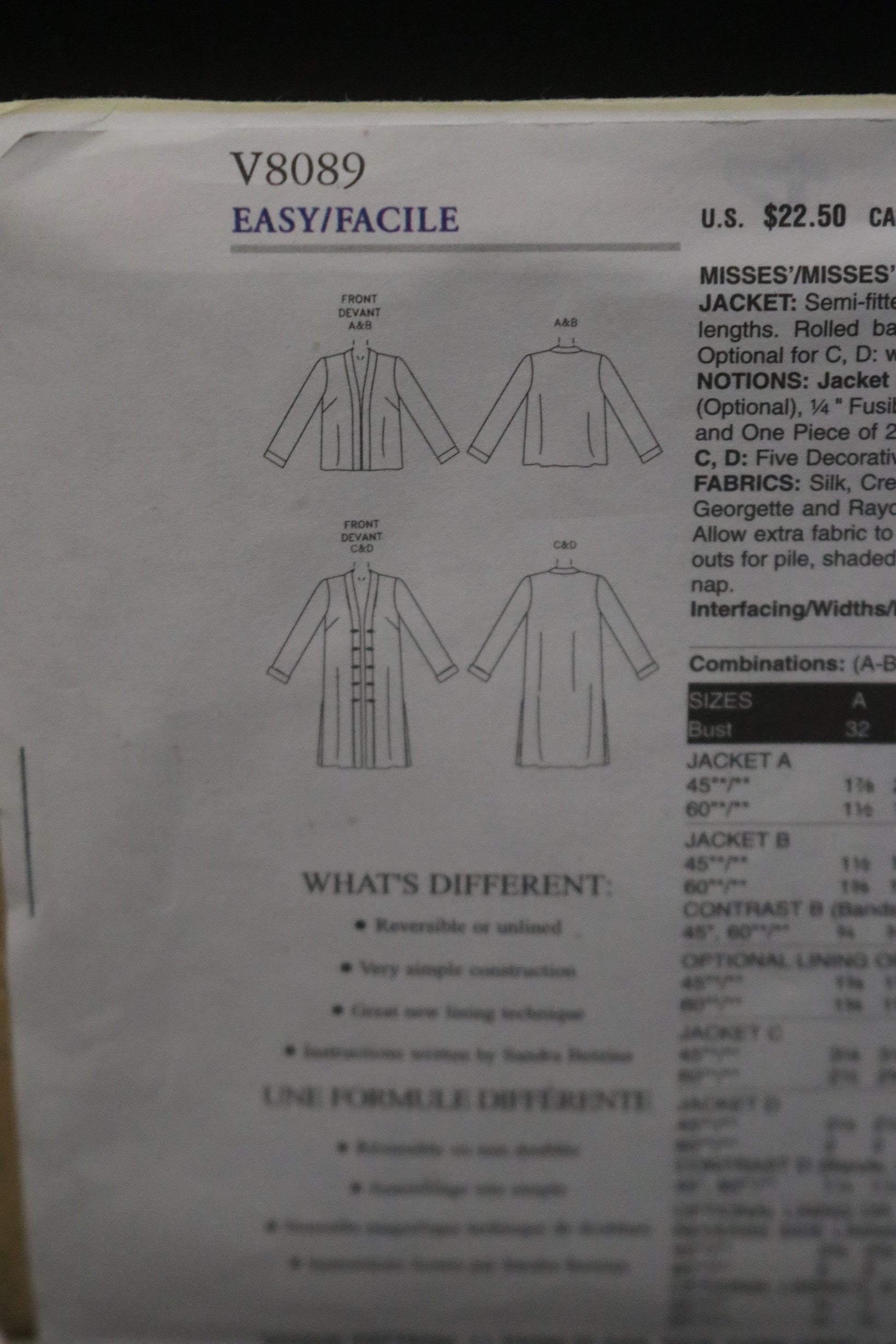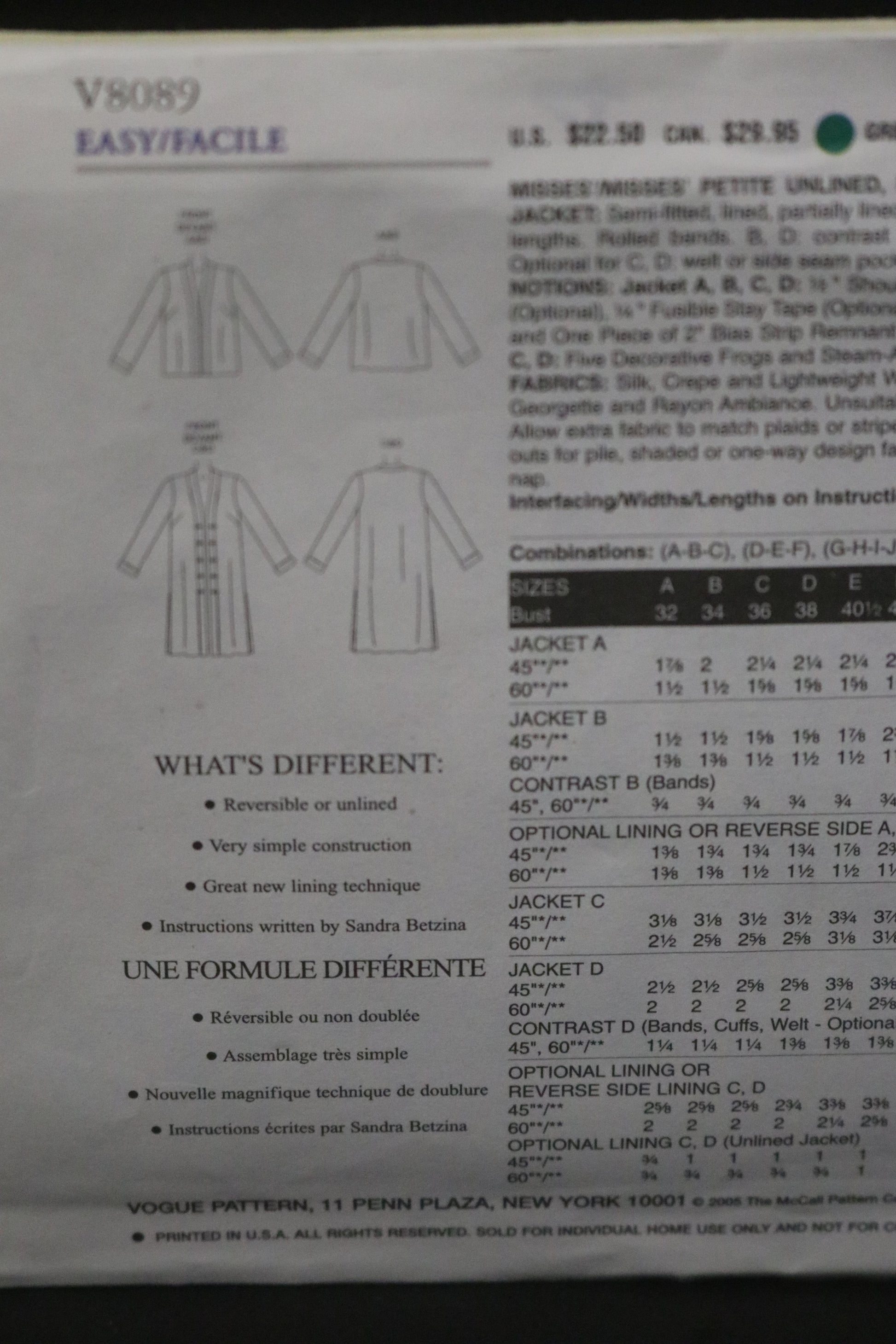 Vogue 8089 Sandra Betzina Misses / Misses Petite Unlined, Lined ot Reversible Jacket Sewing Pattern