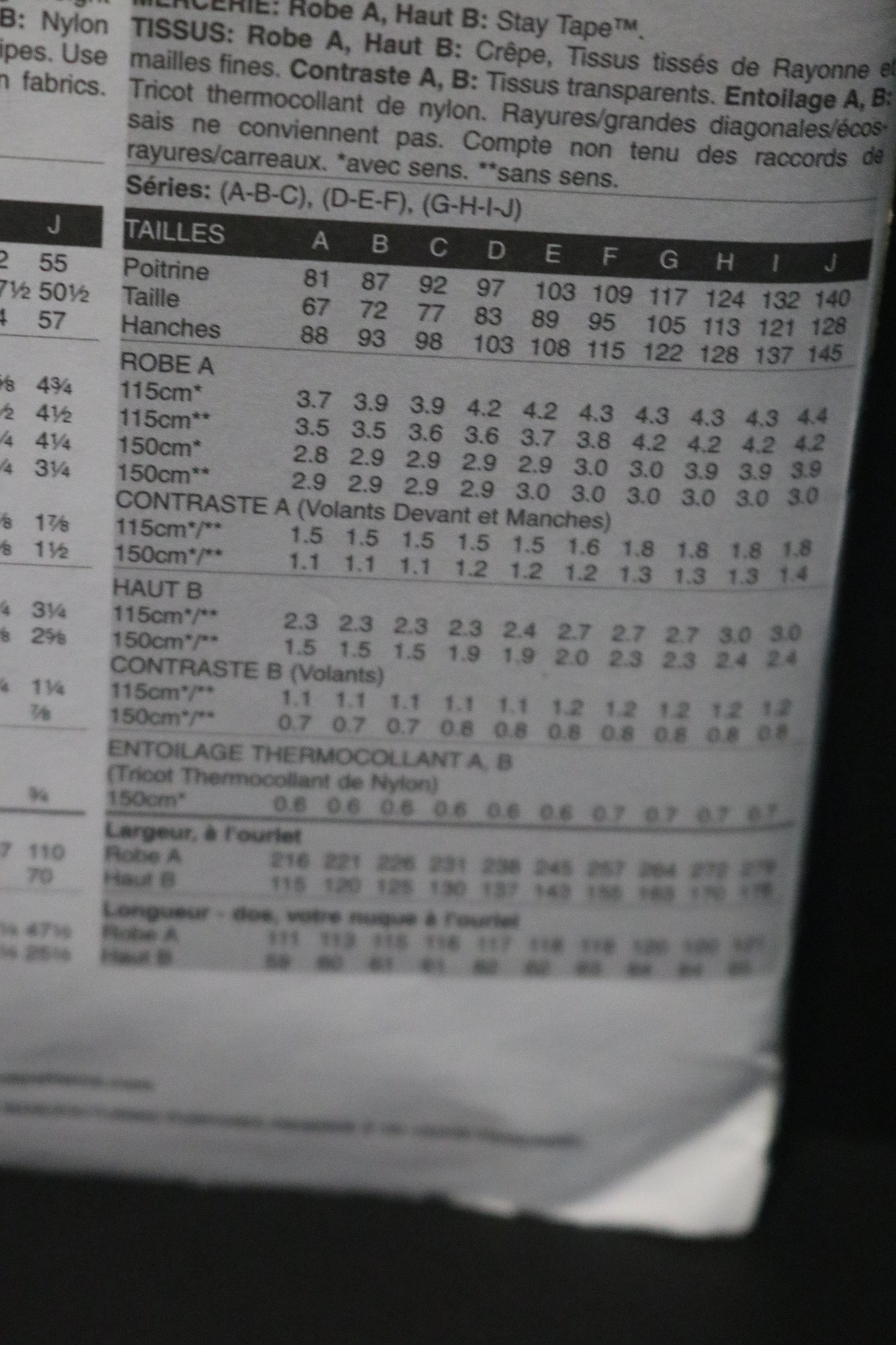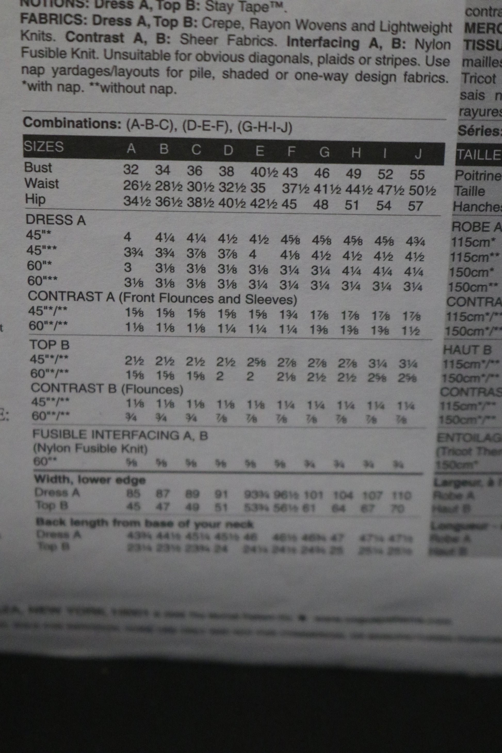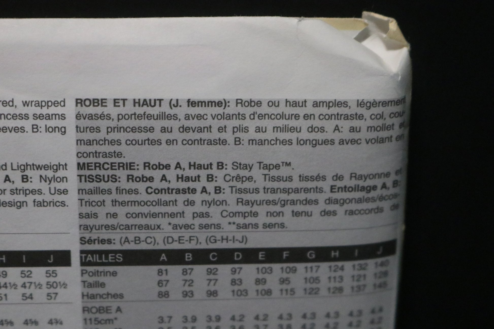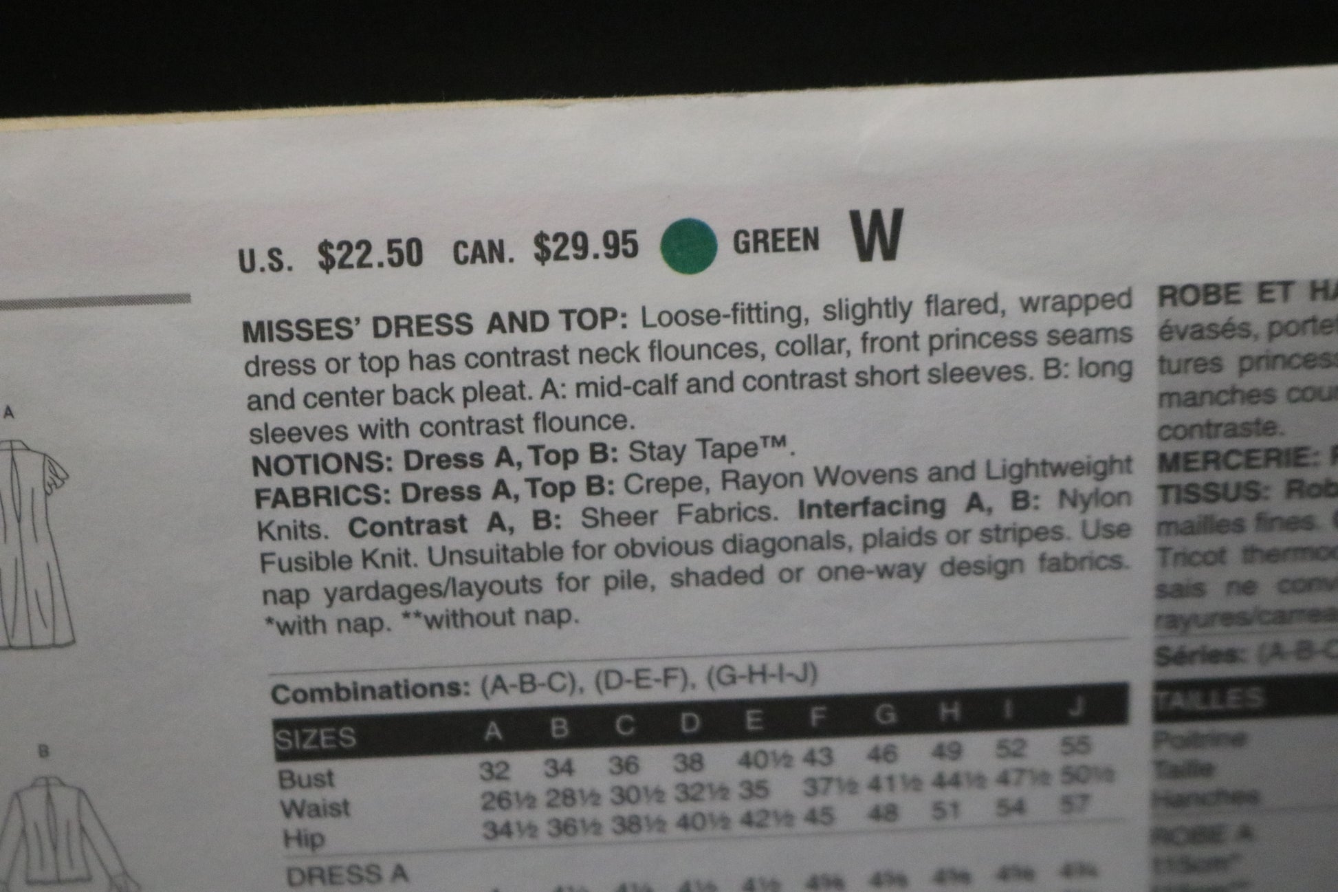 Loose-fitting, slightly flared, wrapped dress or top has contrast neck flounces, collar, front princess seams and center back pleat. A: mid-calf and contrast short sleeves. B: long sleeves with contrast flounce.