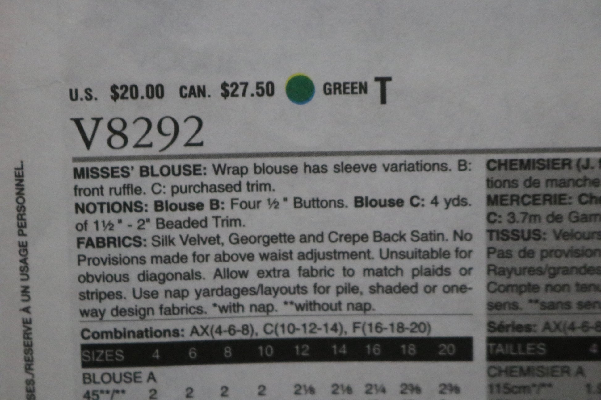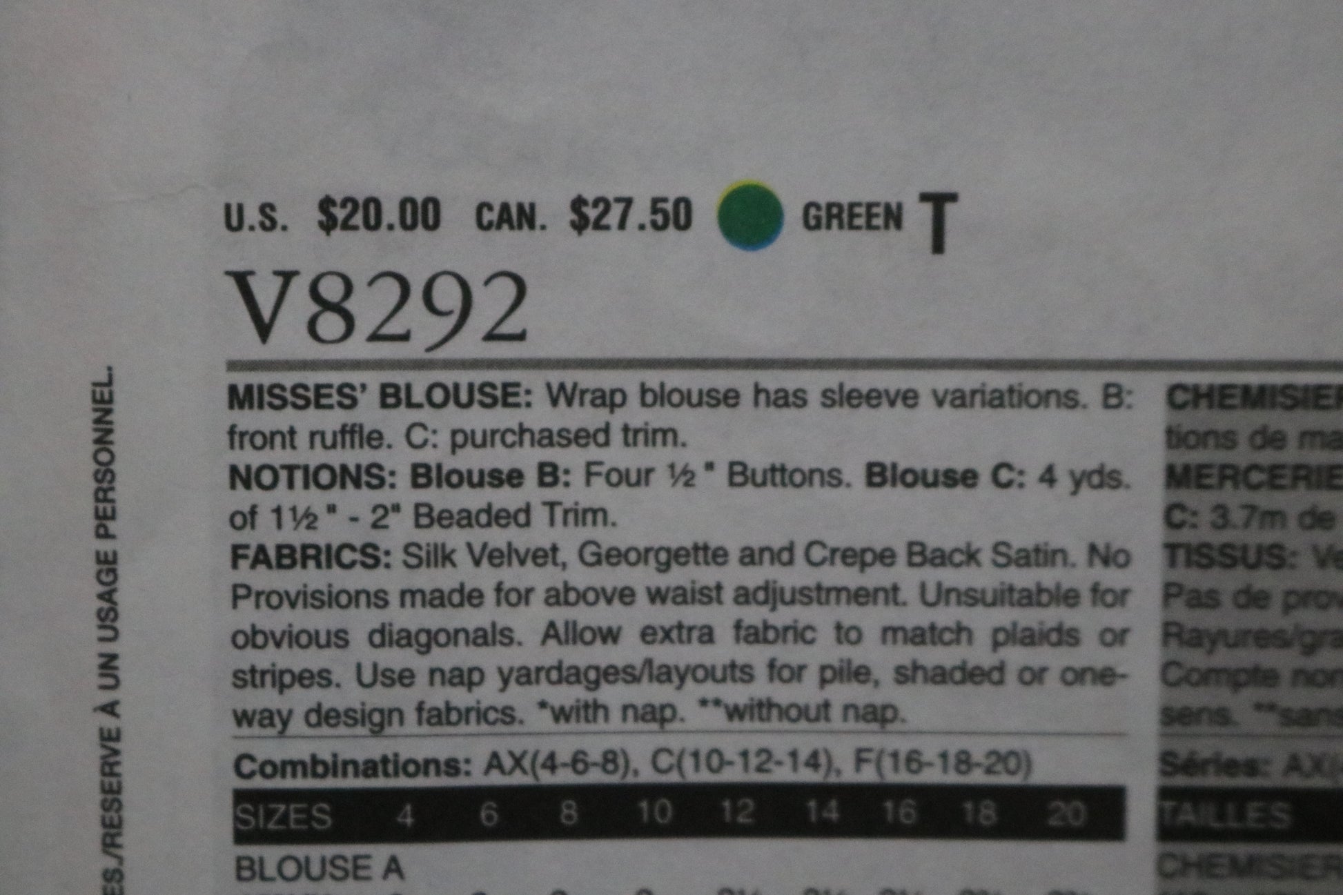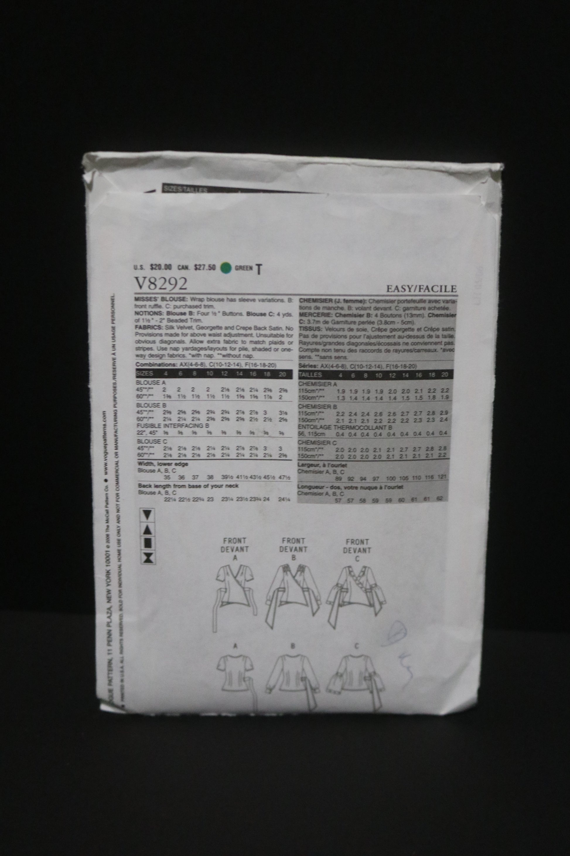 Vogue 8292 Misses Blouse Sewing Pattern - UNCUT - Size 10 12 14