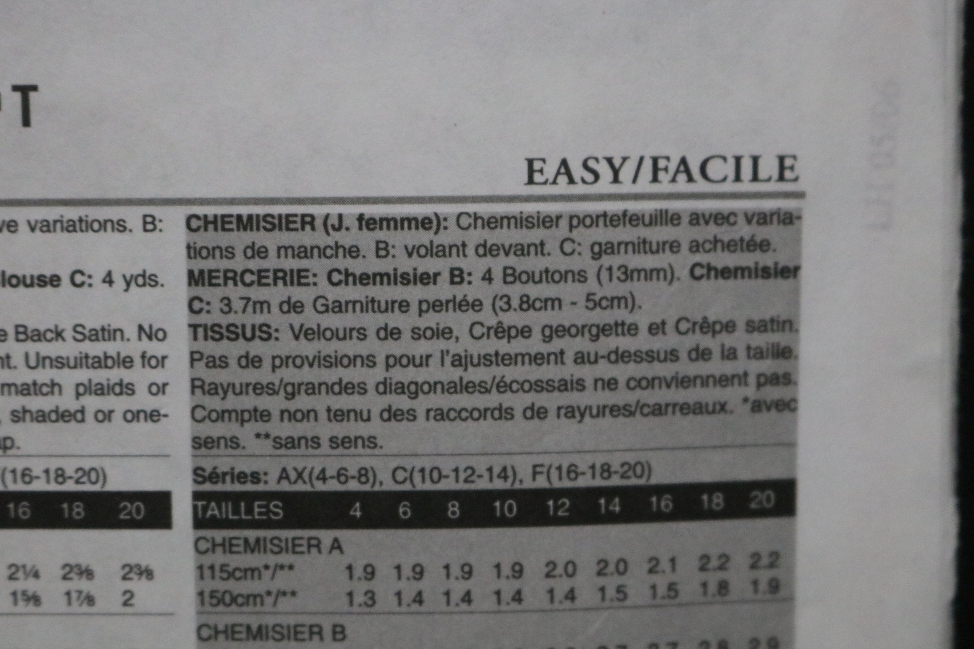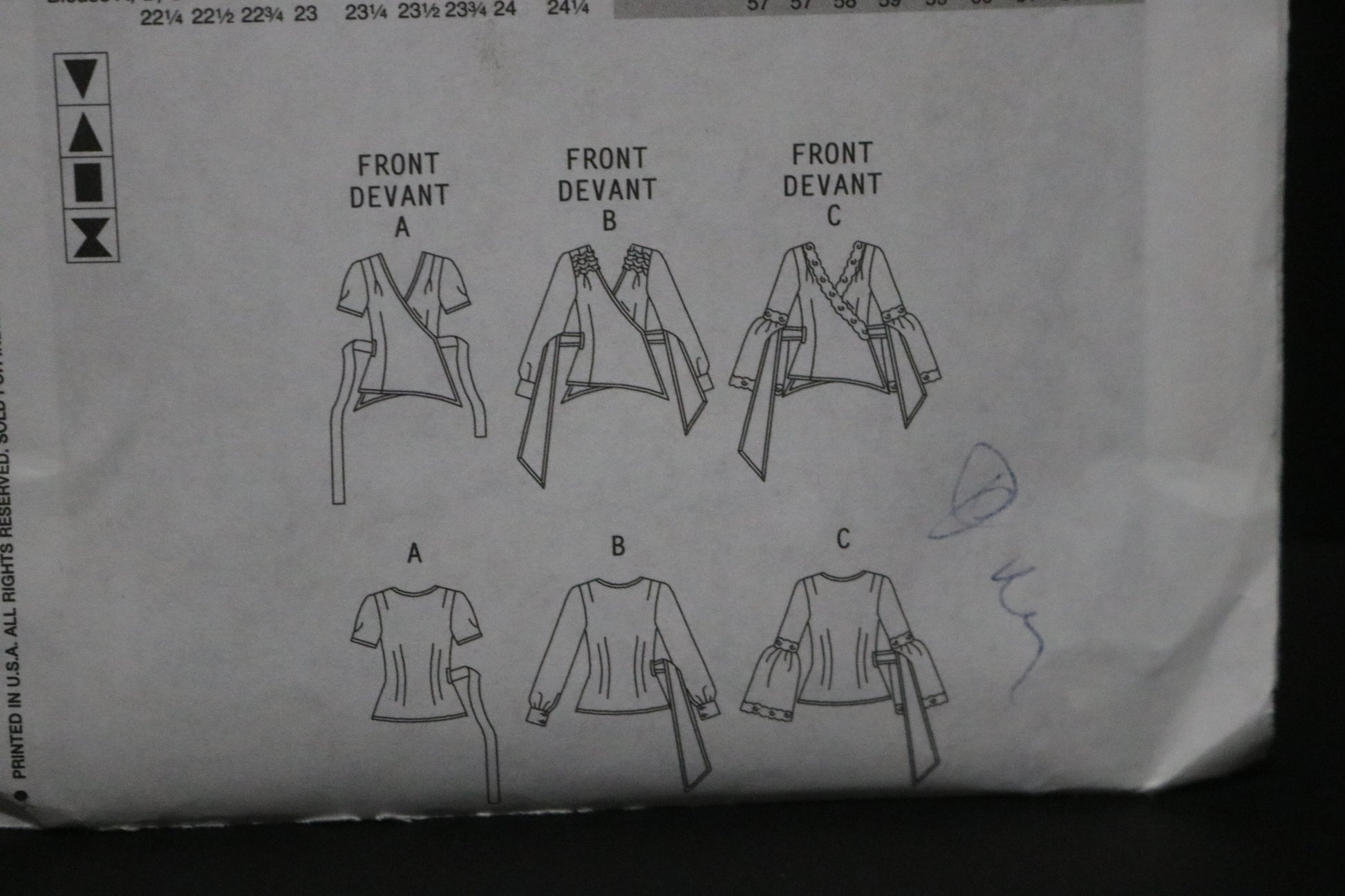 Wrap blouse has sleeve variations. B: front ruffle. C: purchased trim.