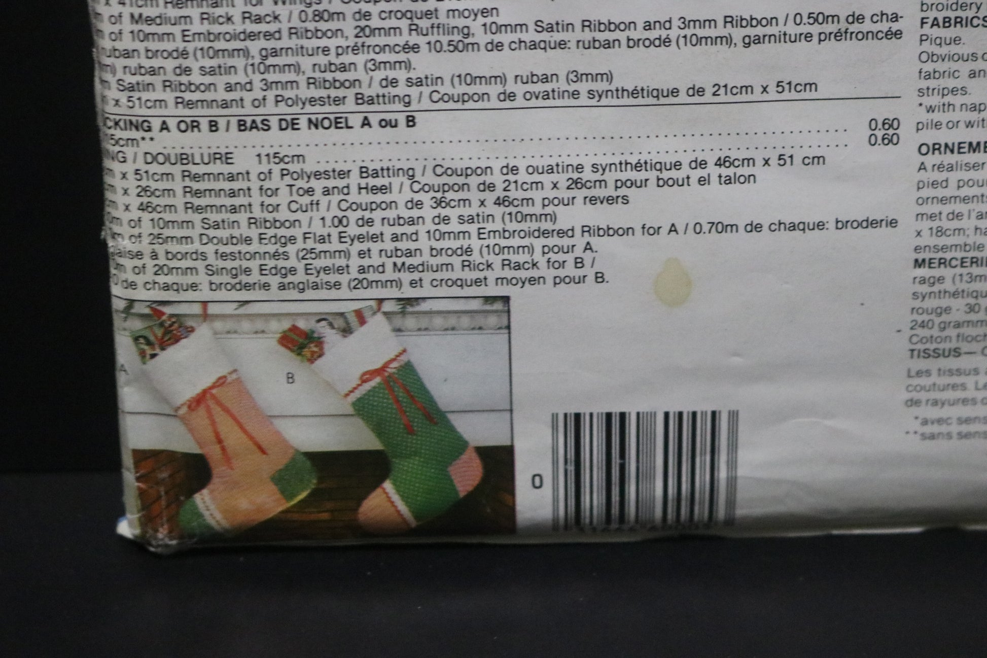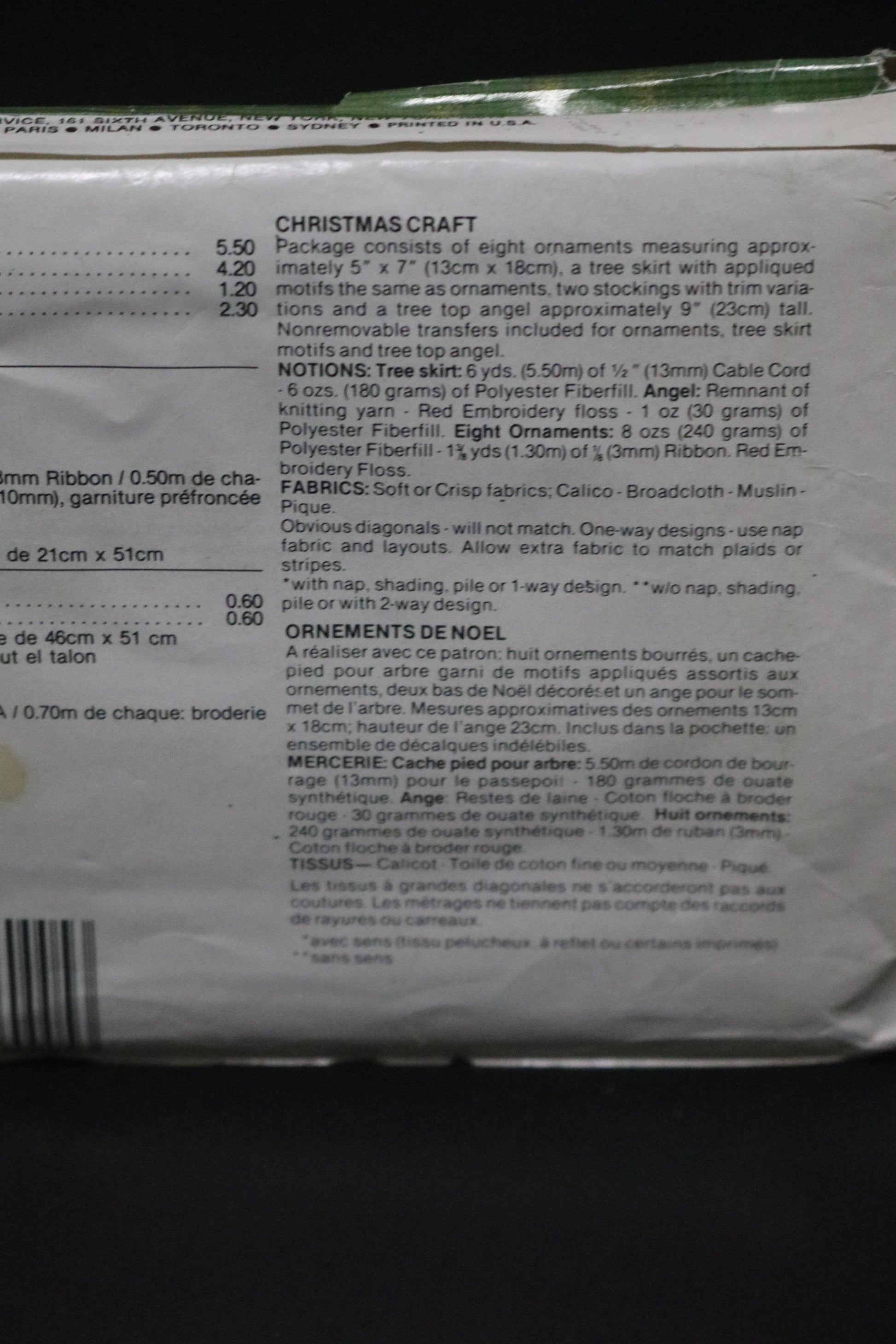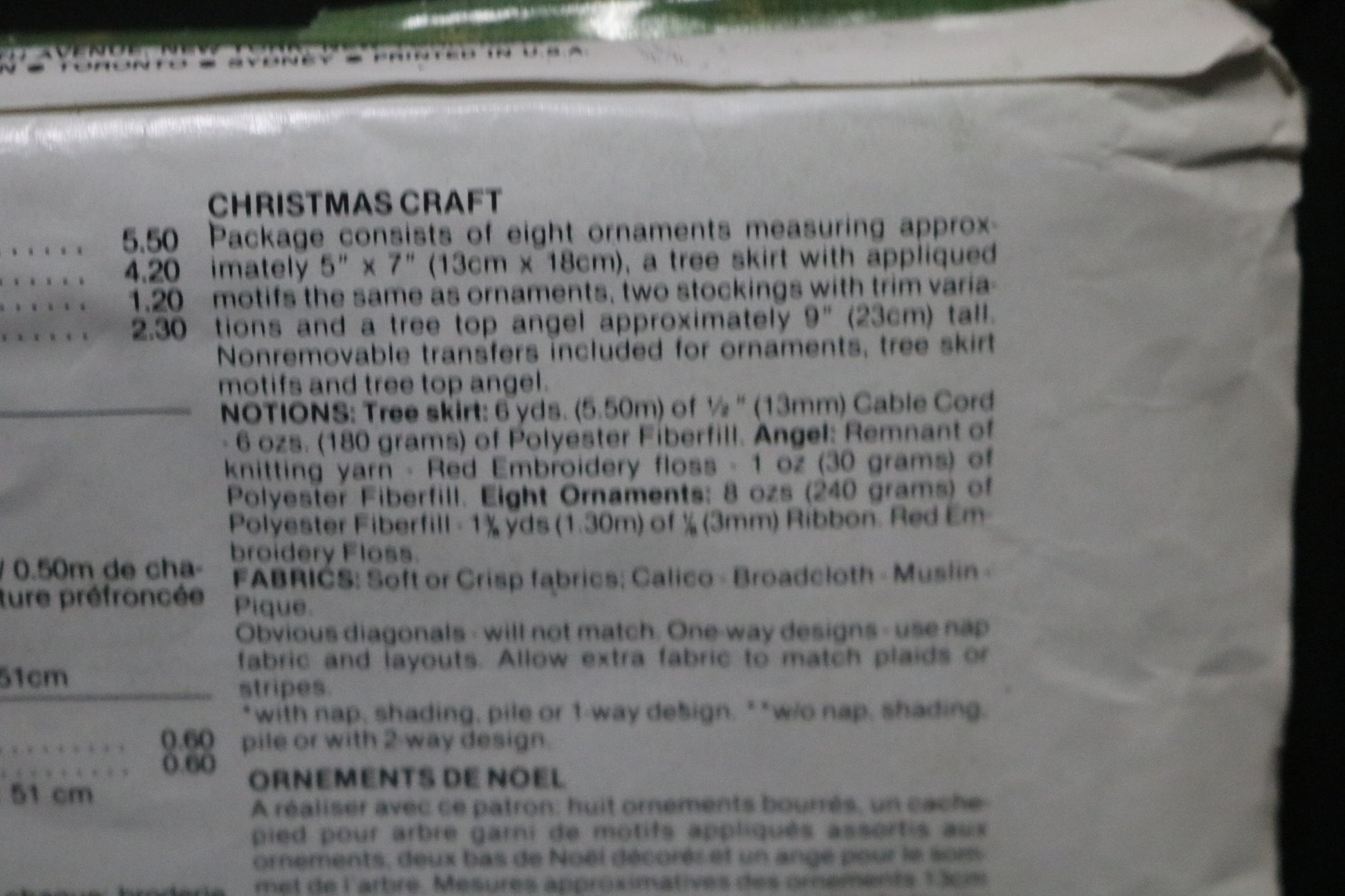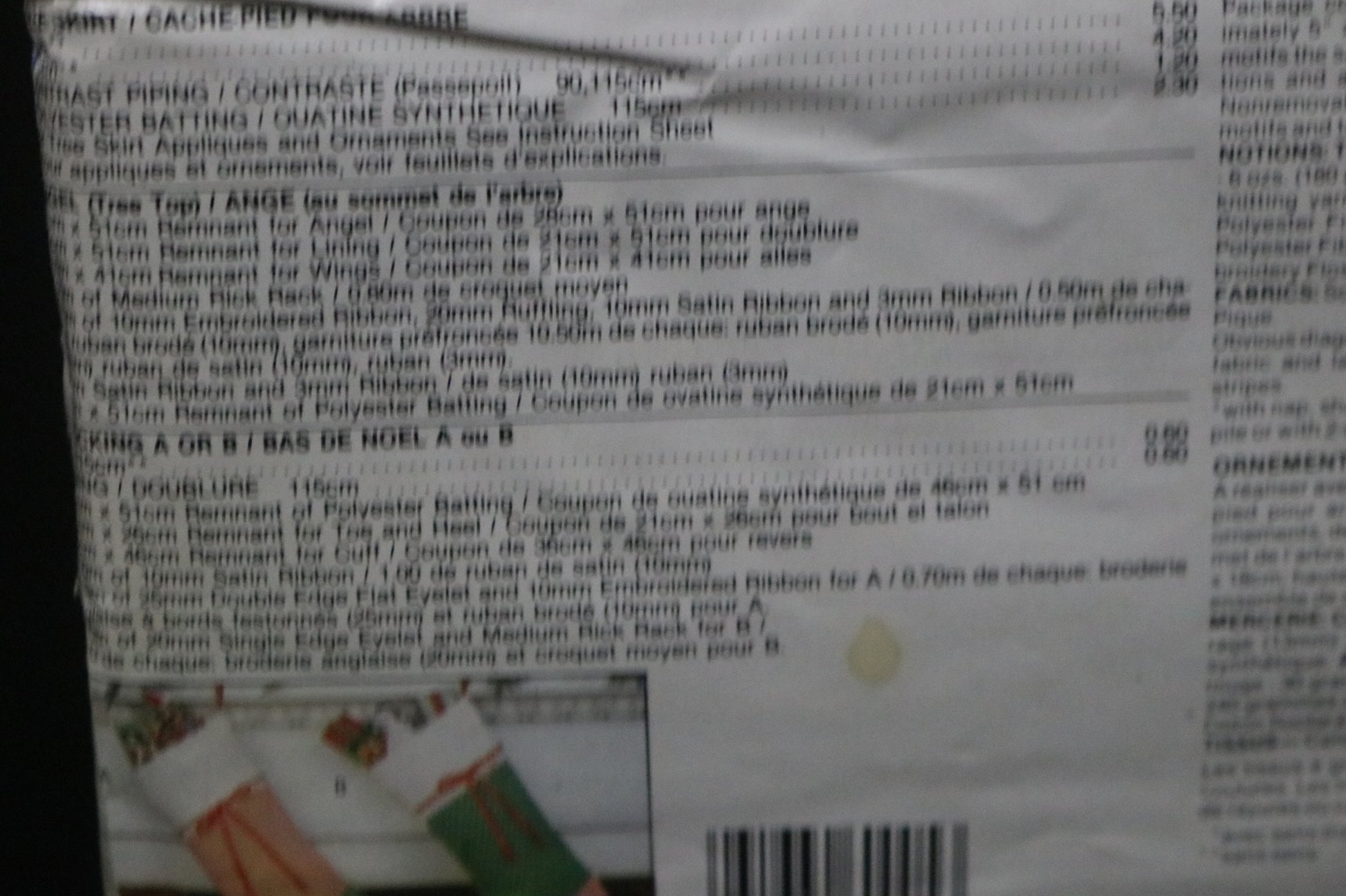 Package consists of eight ornaments measuring approximately 5" x 7", a tree skirt with appliqued motifs the same as ornaments, two stockings with trim variations and a tree topper angel approximately 9" tall. Non removable transfers included for ornaments, tree skirt motifs and tree top angel."