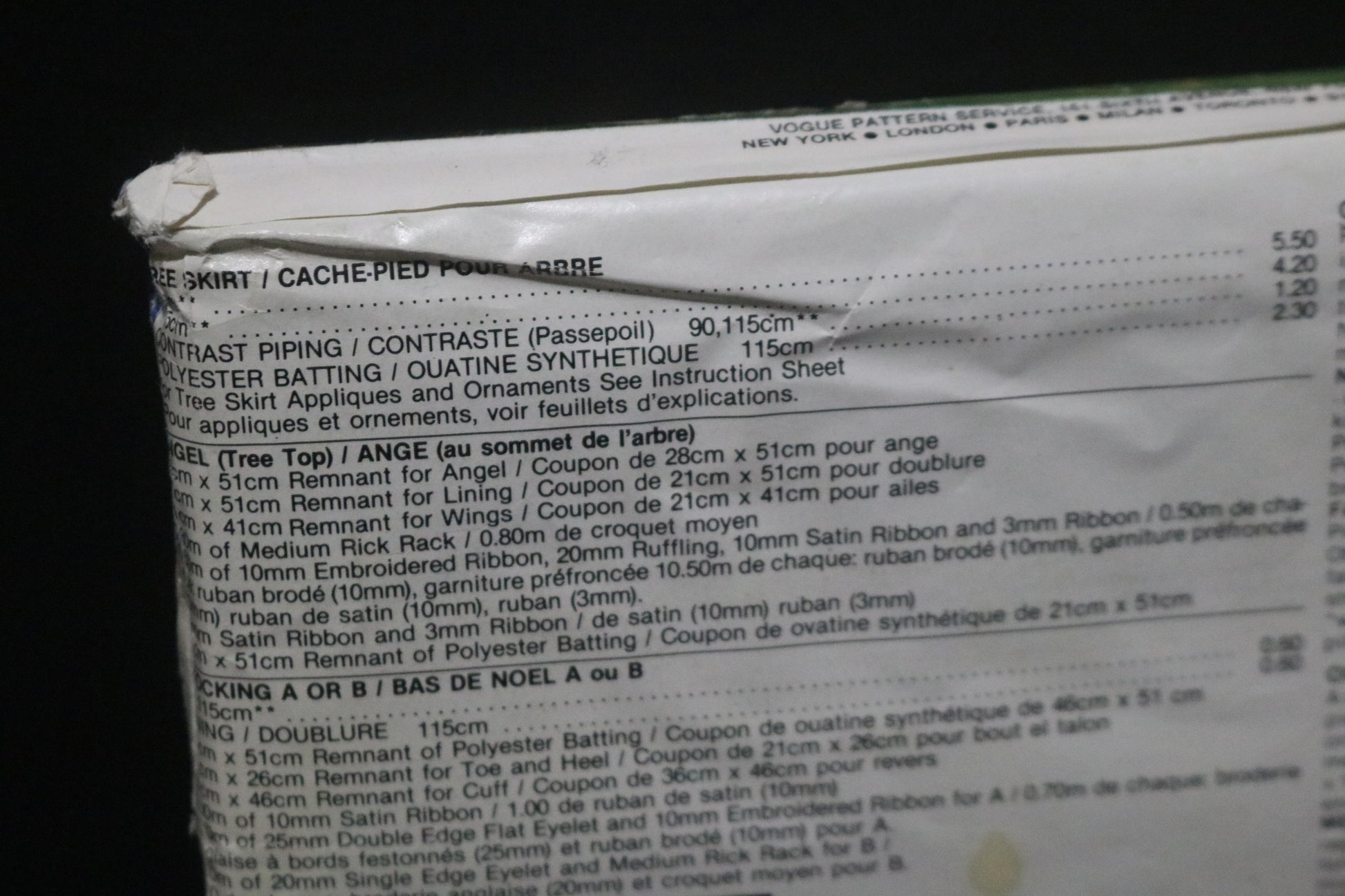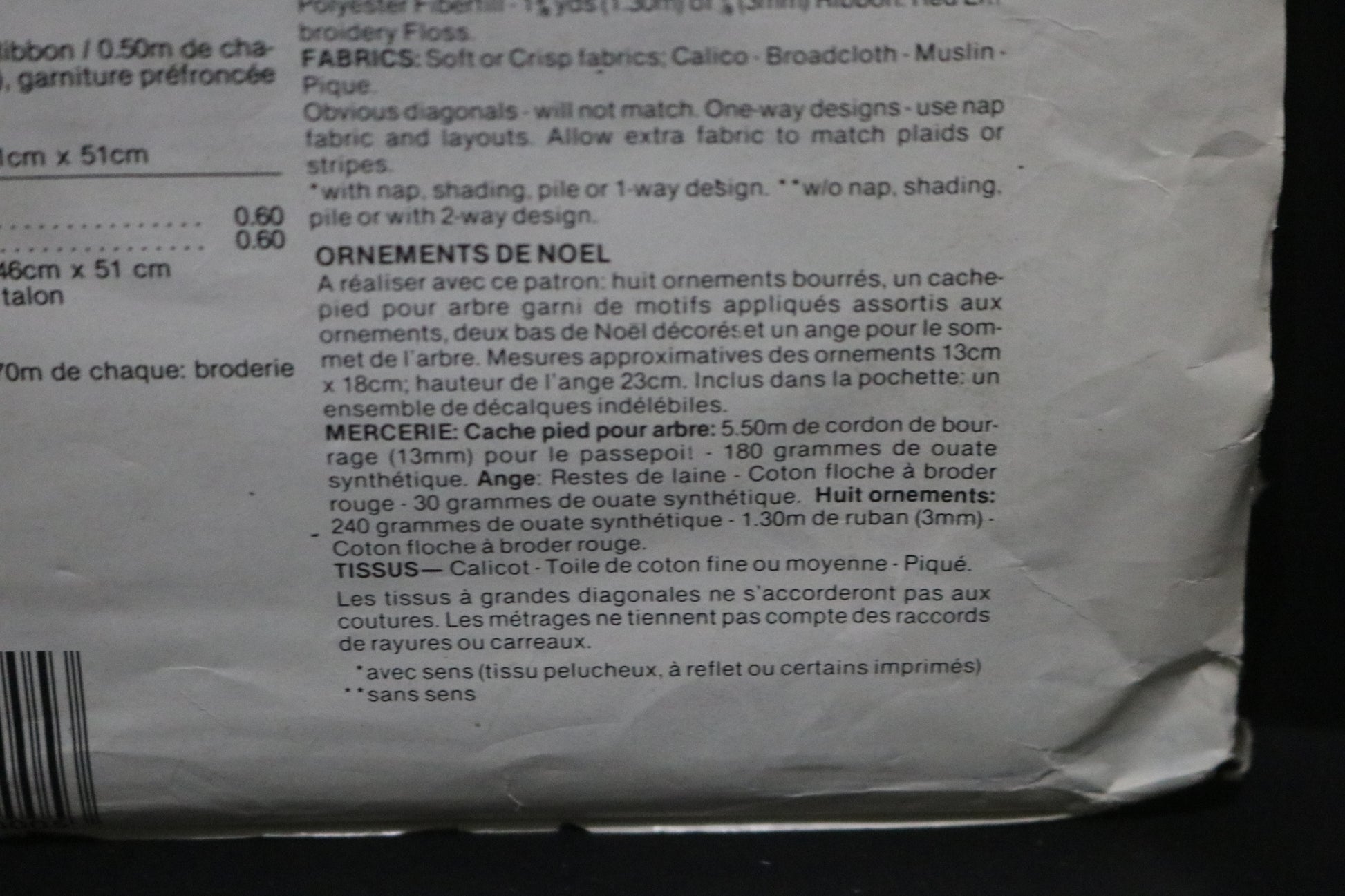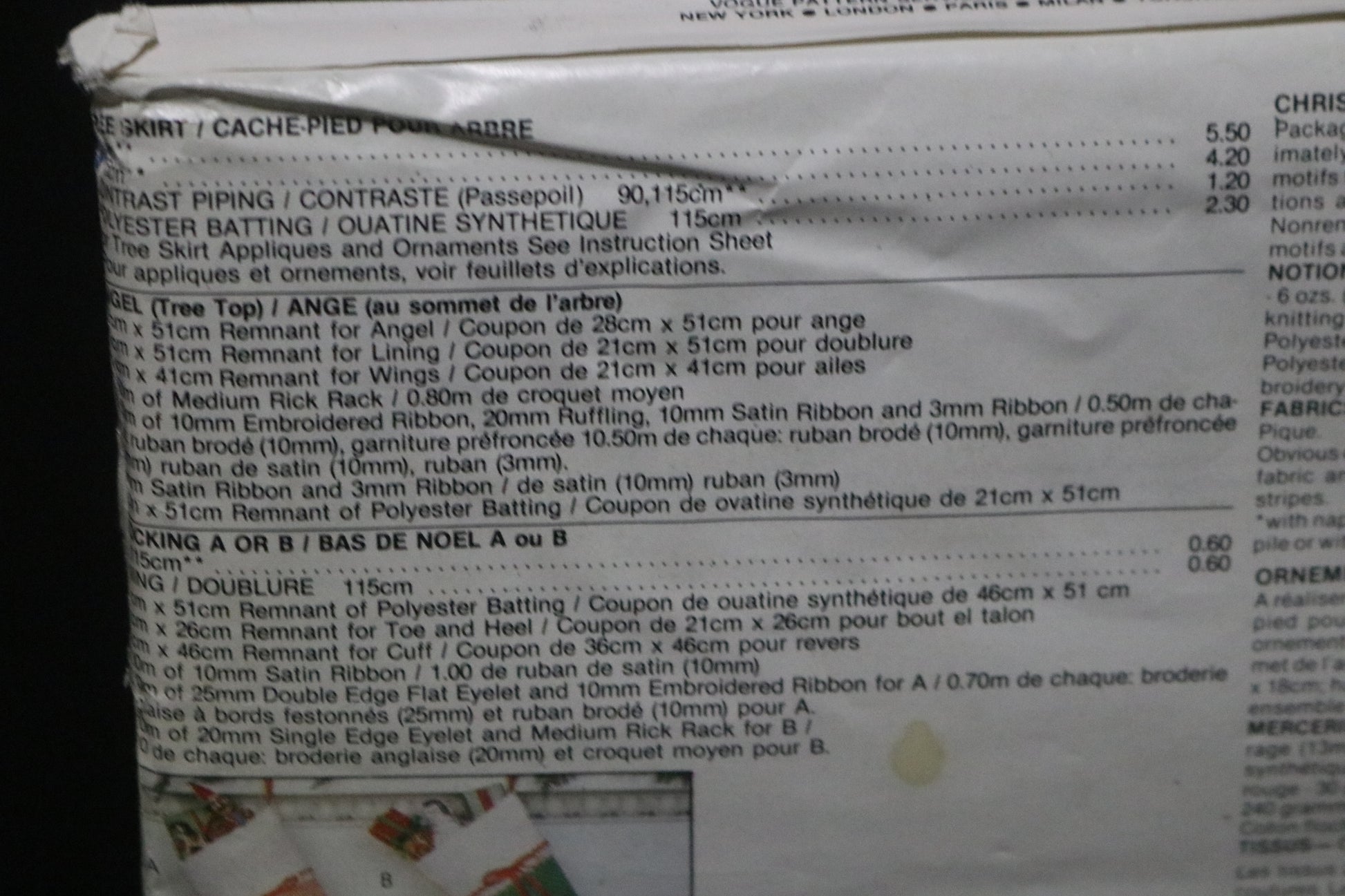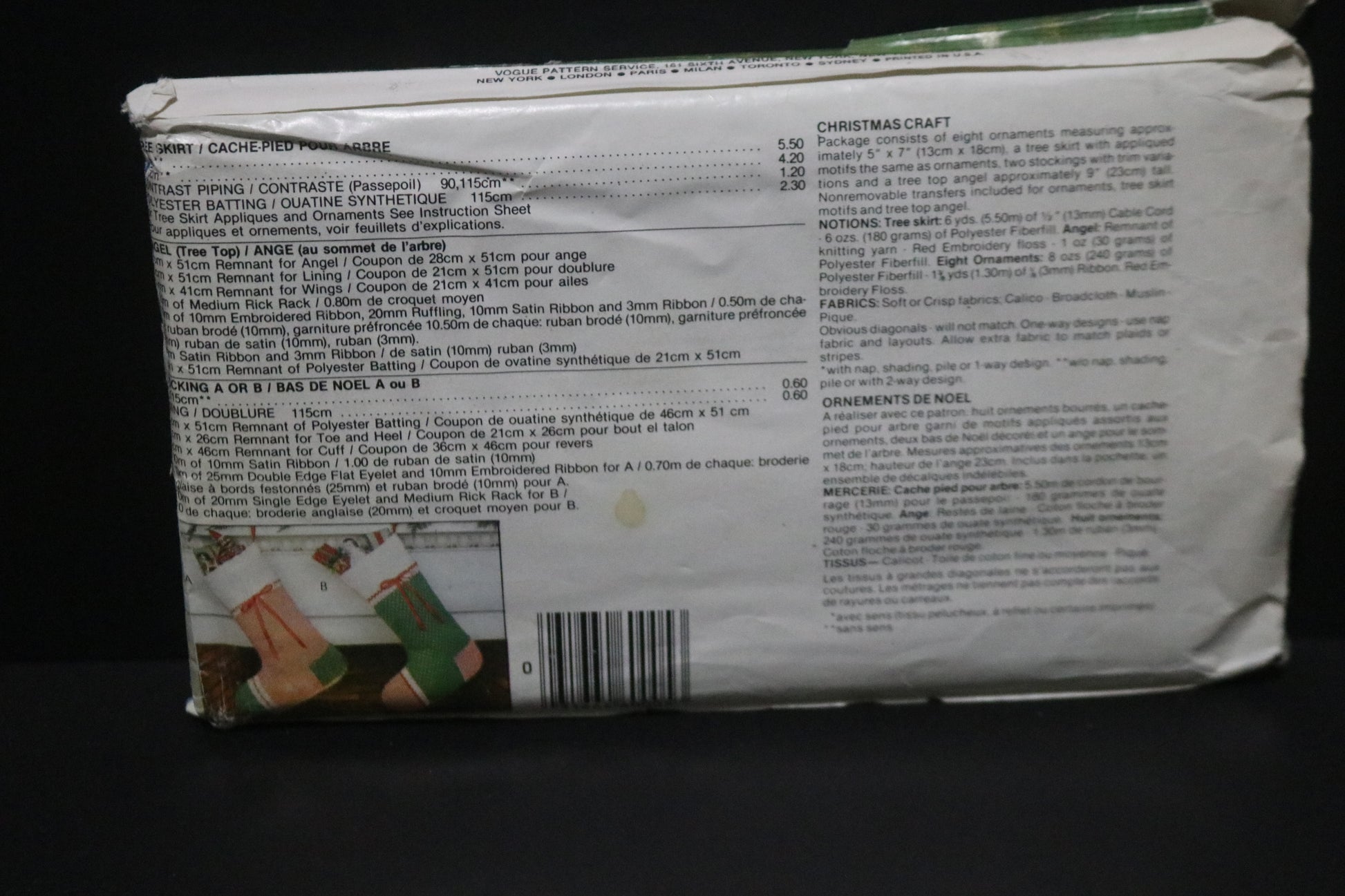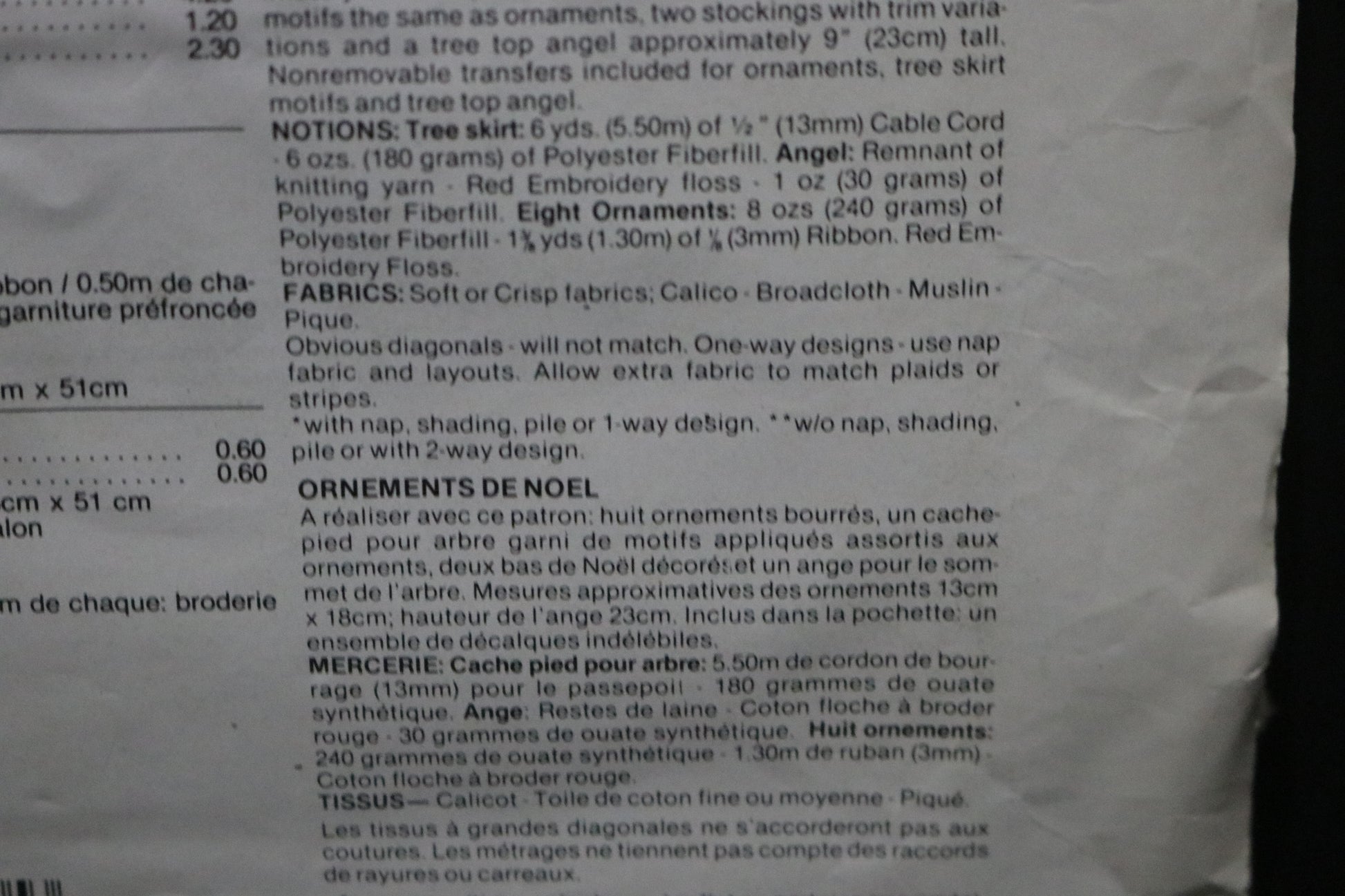 Package consists of eight ornaments measuring approximately 5" x 7", a tree skirt with appliqued motifs the same as ornaments, two stockings with trim variations and a tree topper angel approximately 9" tall. Non removable transfers included for ornaments, tree skirt motifs and tree top angel."