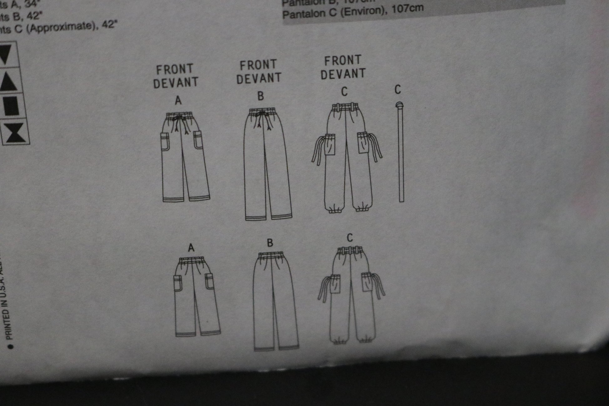Pants A, B have waist casing with elastic and cord ties, topstitched hems. A: 6" above ankle, side pockets with topstitching. Pants C has side pockets with ties, elastic waist and ankle casings, carriers and belt with “D” ring closures.