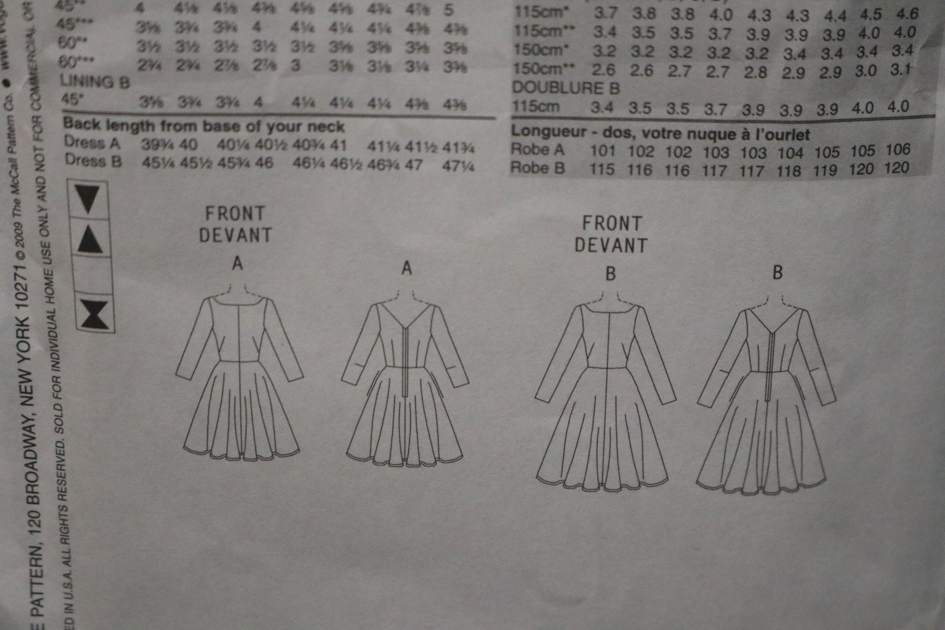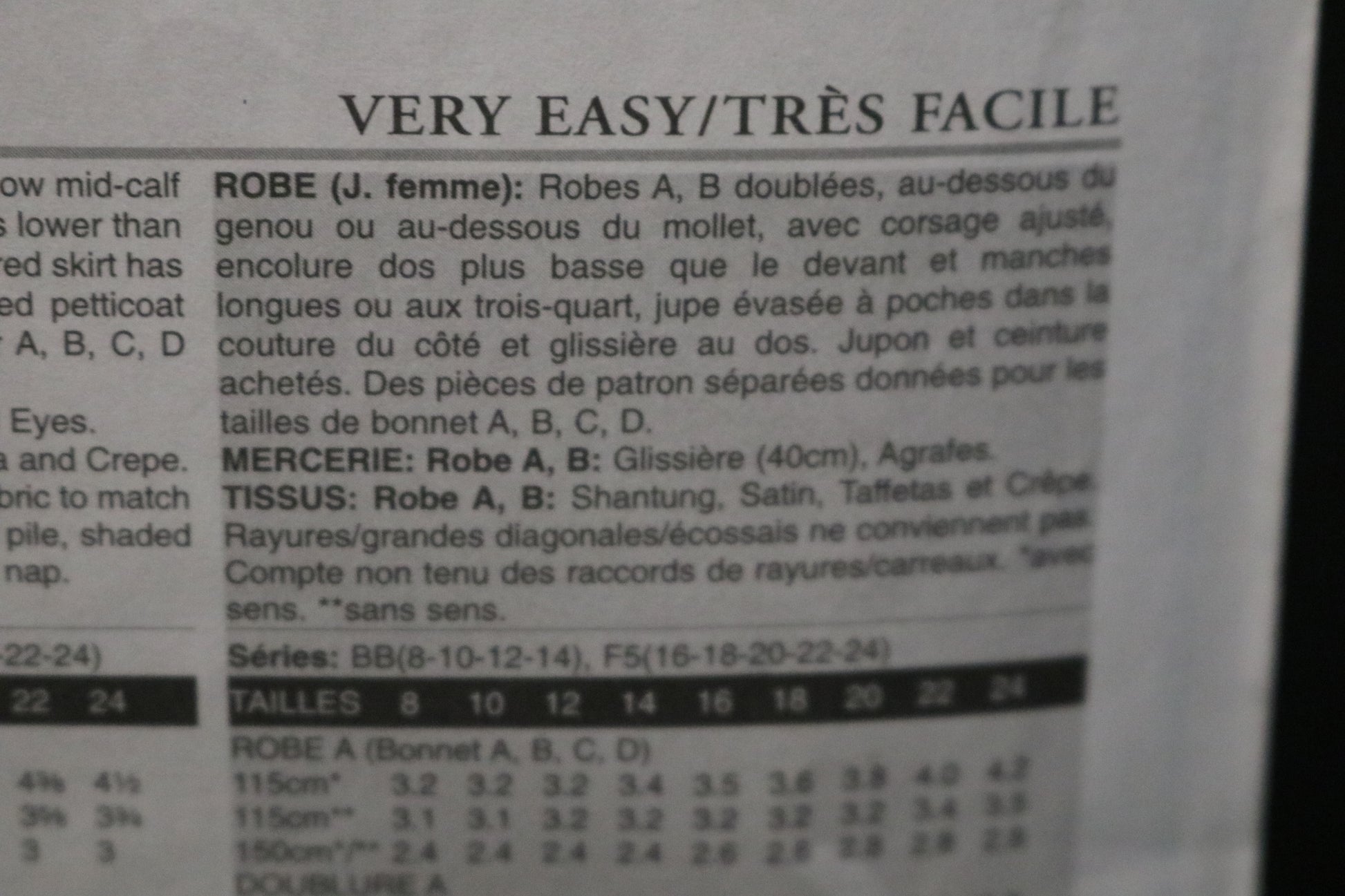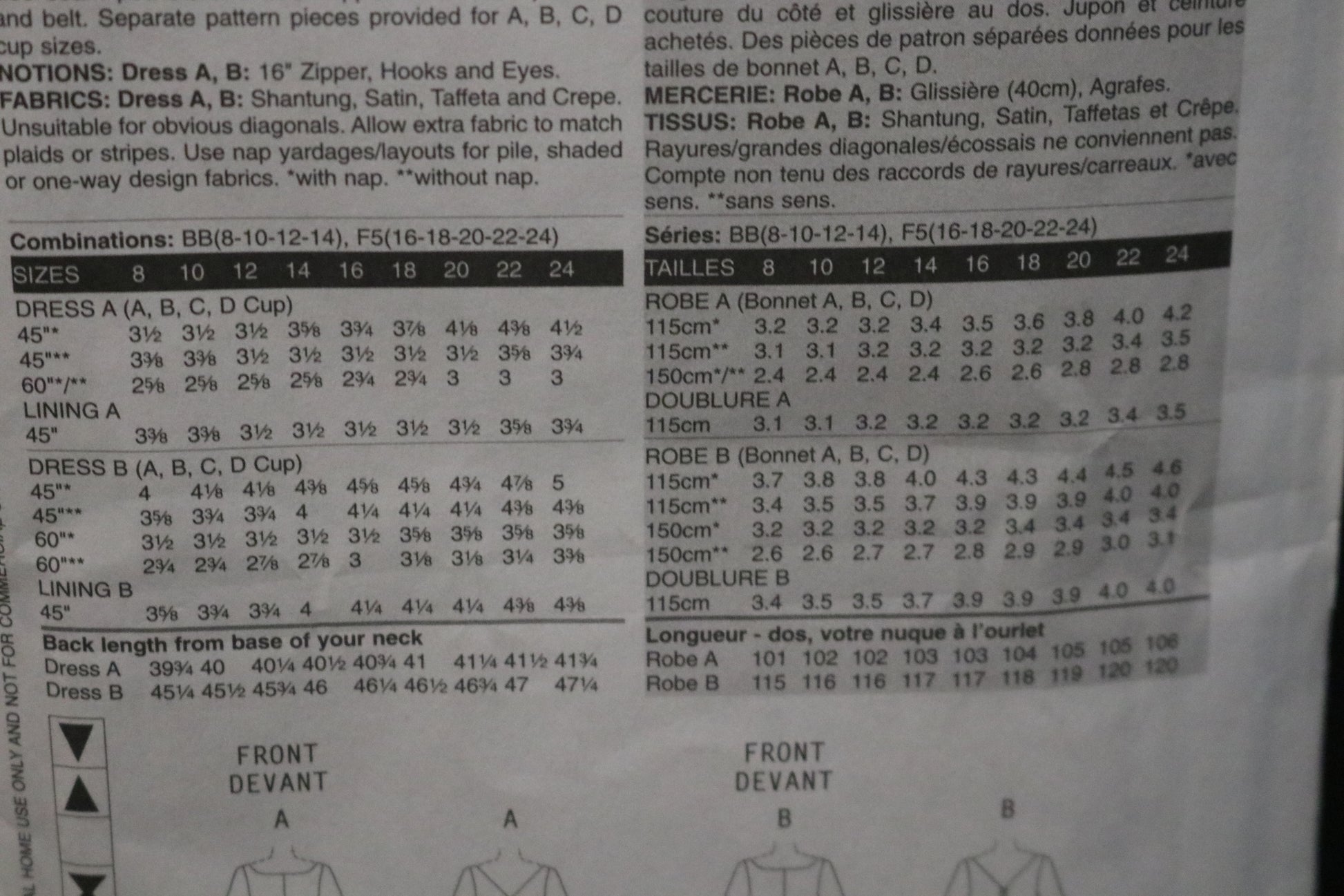 Lined, below mid-knee or below mid-calf dresses A, B have fitted bodice, back neckline is lower than front and three-quarter or full length sleeves, flared skirt has side seam pockets and back zipper. Purchased petticoat and belt. Separate pattern pieces provided for A, B, C, D cup sizes.