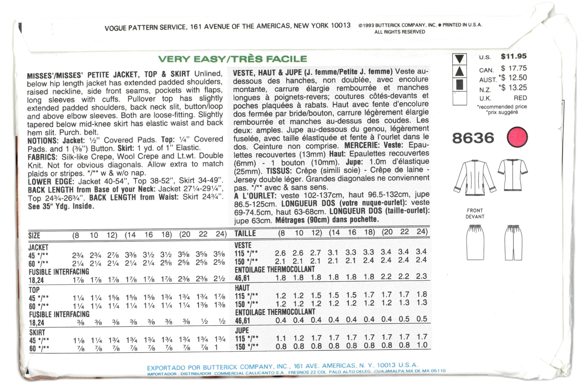 Vogue 8636 Misses / Misses Petite Jacket Top and Skirt Sewing Pattern
