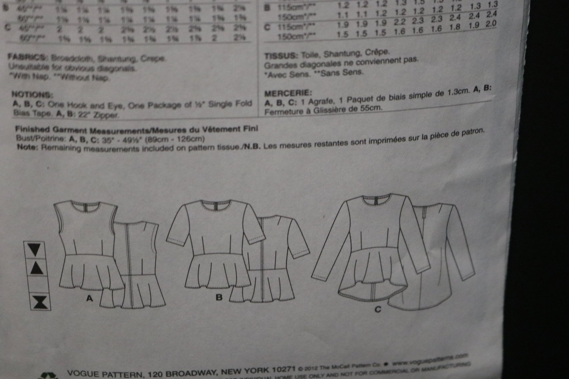 Fitted top has raised waist/hemline variations and narrow hem. A, B: Back zipper. A: Sleeveless. B: Short sleeves. C: Pullover, high-low hem, wrong side shows (back hemline), long sleeves, back keyhole closure with hook/eye closing. B, C: Stitched hems on sleeves. Purchase bias tape to finish necklines and armholes A.
