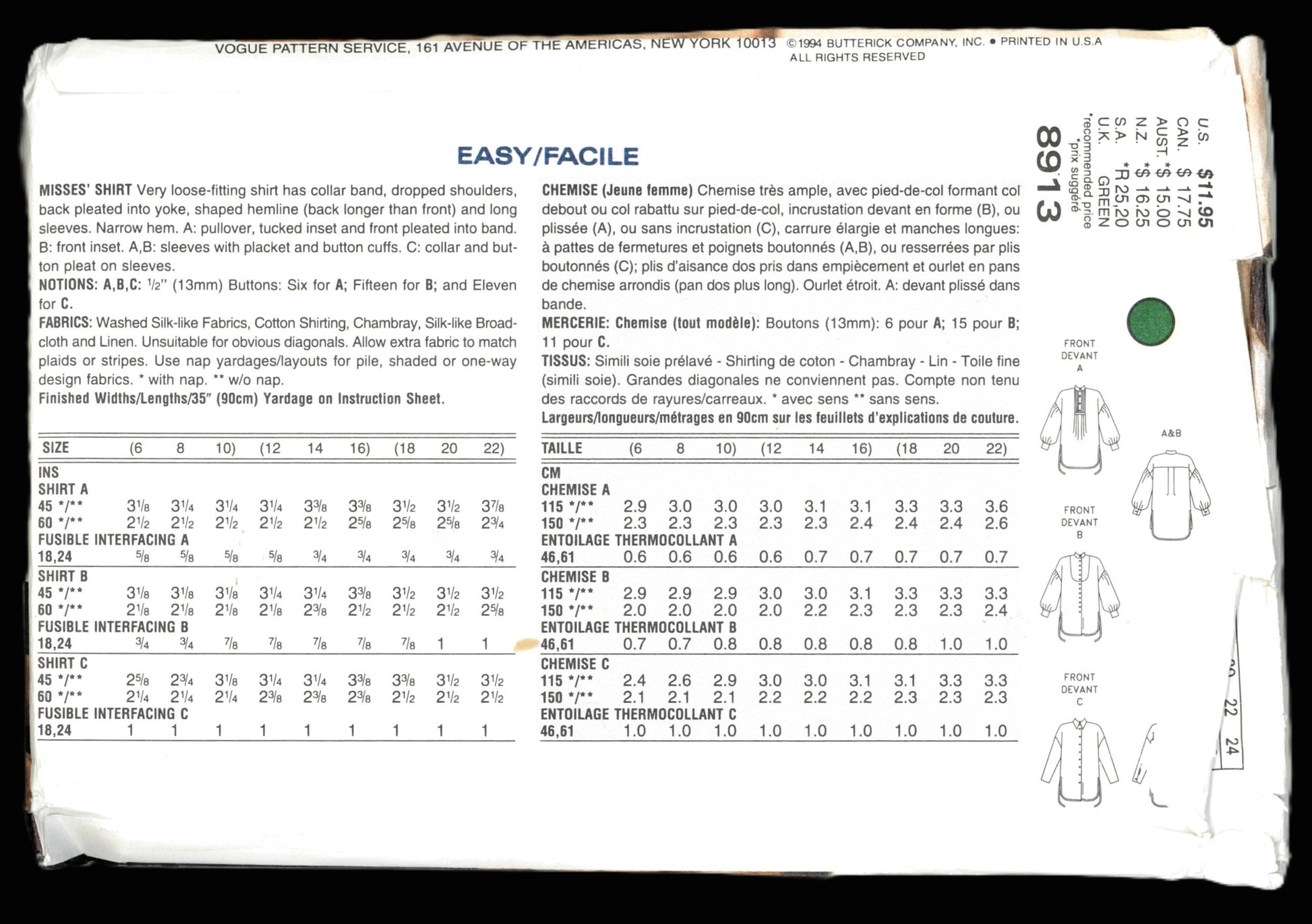 Vogue 8913 Misses Shirt Sewing Pattern