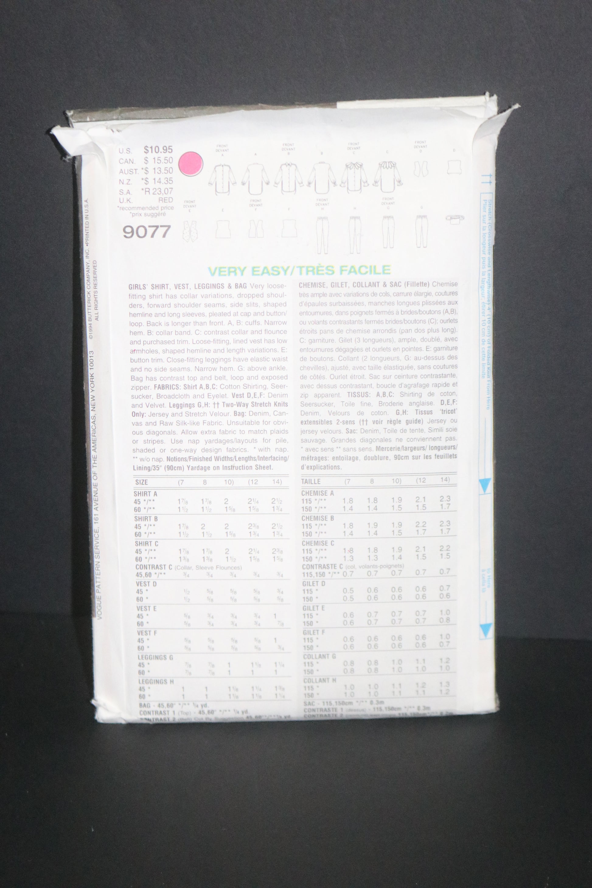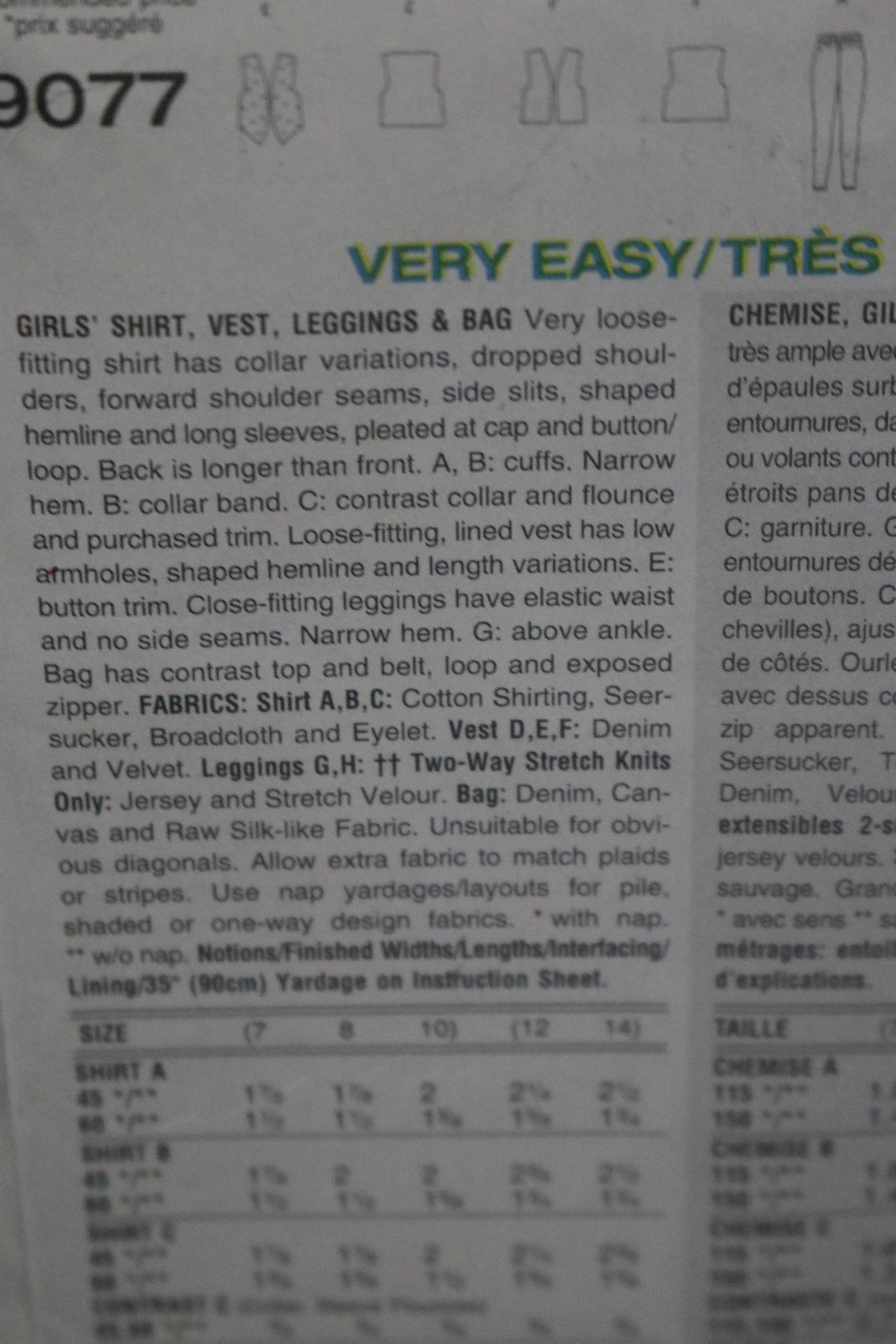 Vogue 9077 Girls Shirt Vest Leggings and Bag Sewing pattern