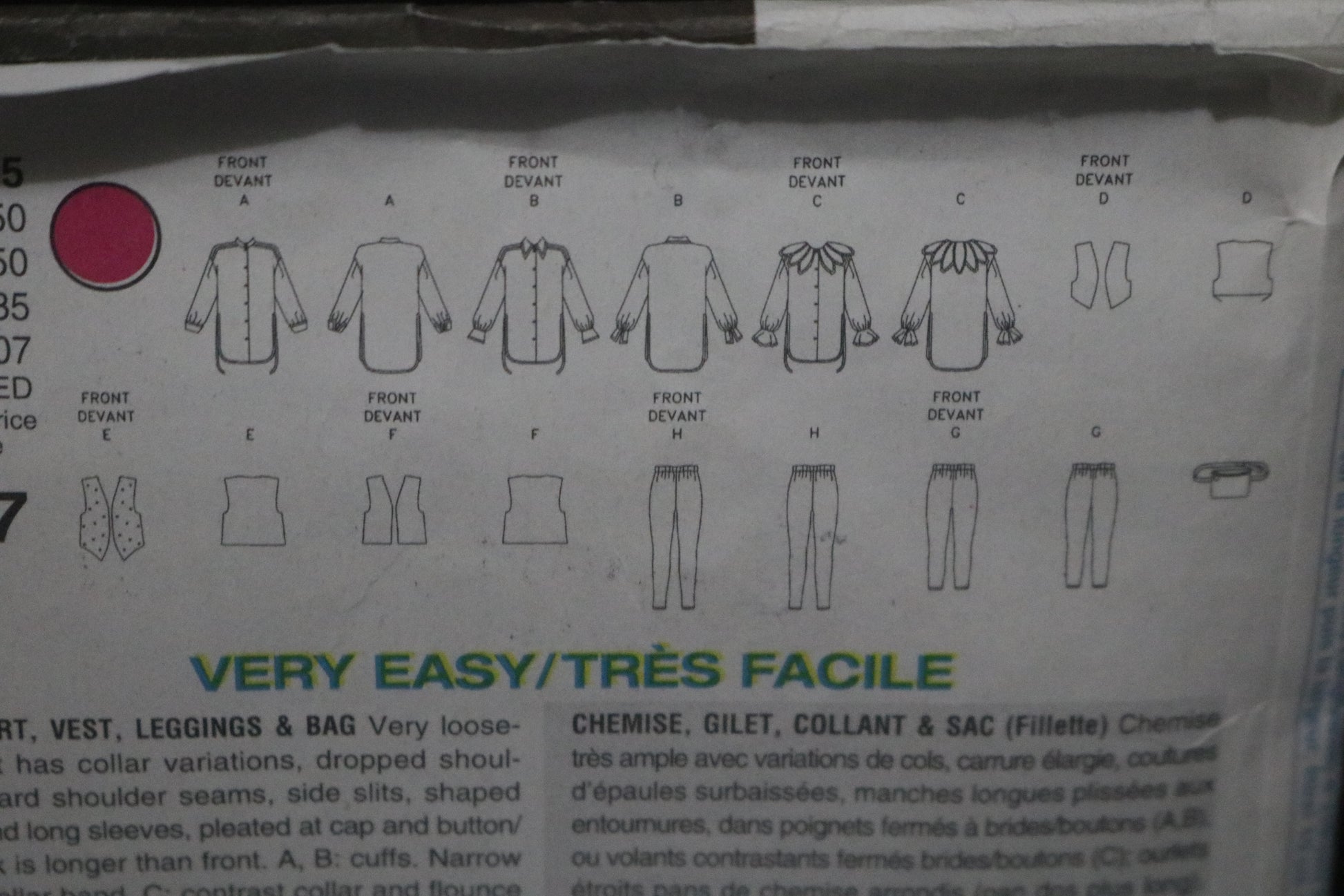 Very loose fitting shirt has collar variations, dropped shoulders forwards shoulder seams, side slits, shaped hemline and long sleeves, pleated at cap and button/loop. Back is longer than front. A,B; cuffs. Narrow hem, B collar band; C contrast collar and flounce and purchased trim. Loose fitting, lined vest has low armholes, shaped hemline and length variations. E; button trim, Close fitting leggings have elastic waist and no side seams. Narrow hem. G; above ankle, Bag has contrast top and belt. Loop and exposed zipper.