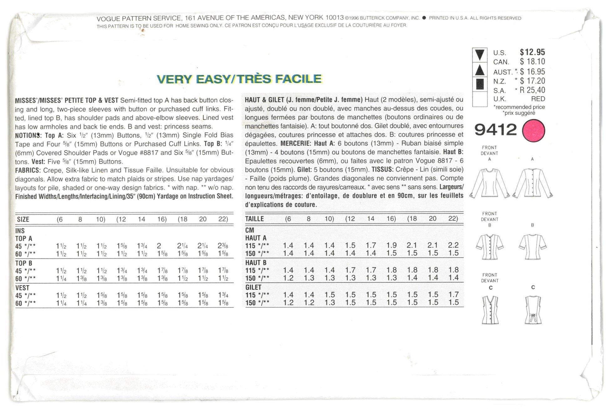 Vogue 9412 Misses / Miss Petite Top and Vest Sewing Pattern - UNCUT - Size 6 8 10