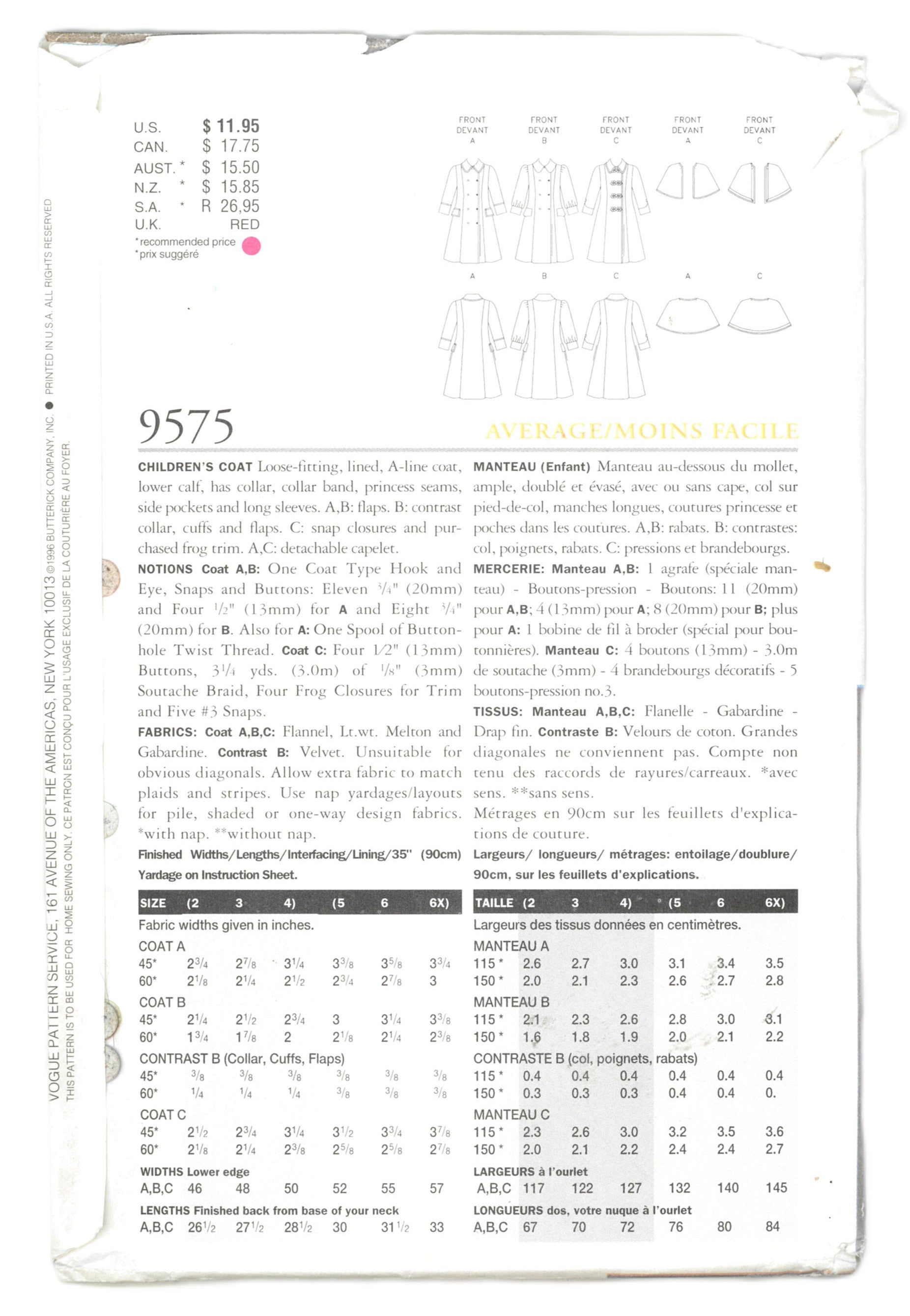 Vogue 9575 Vogue for Me Childrens Girls Coat Sewing Pattern