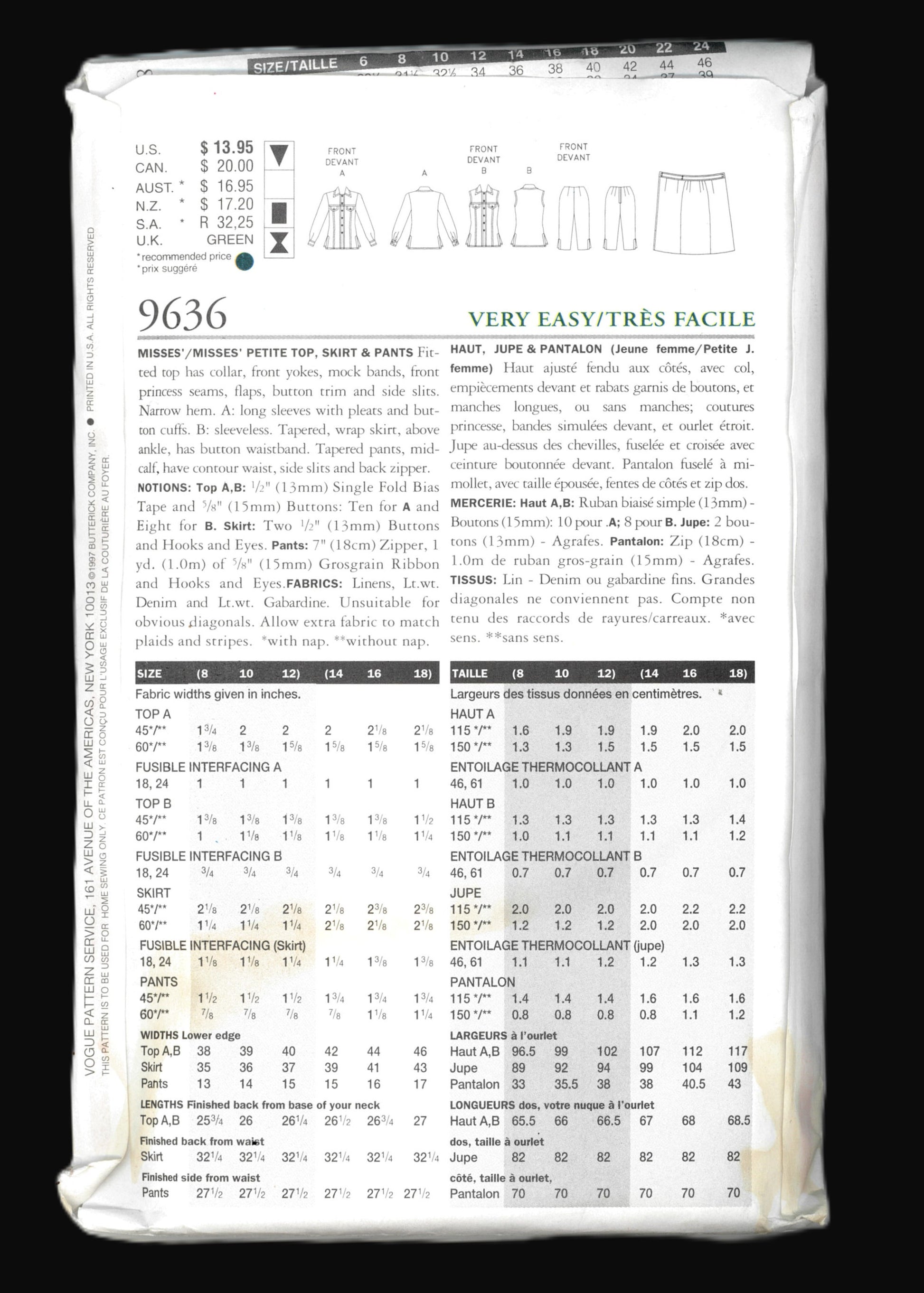 Vogue 9636 Misses / Misses Petite Top Skirt and Pants Sewing Pattern